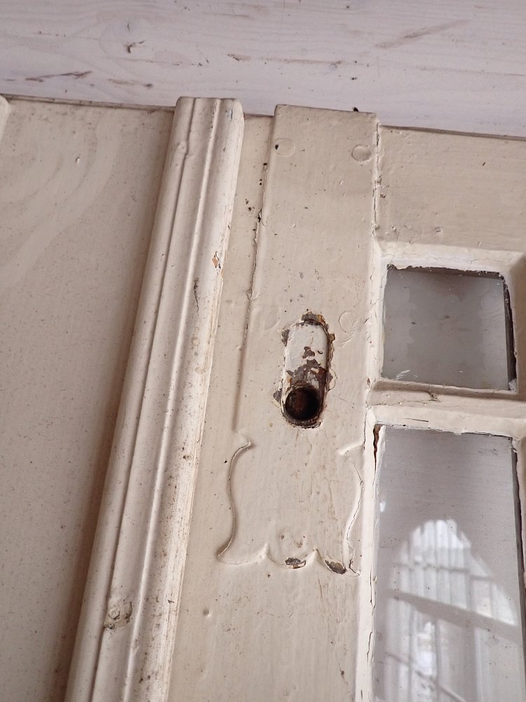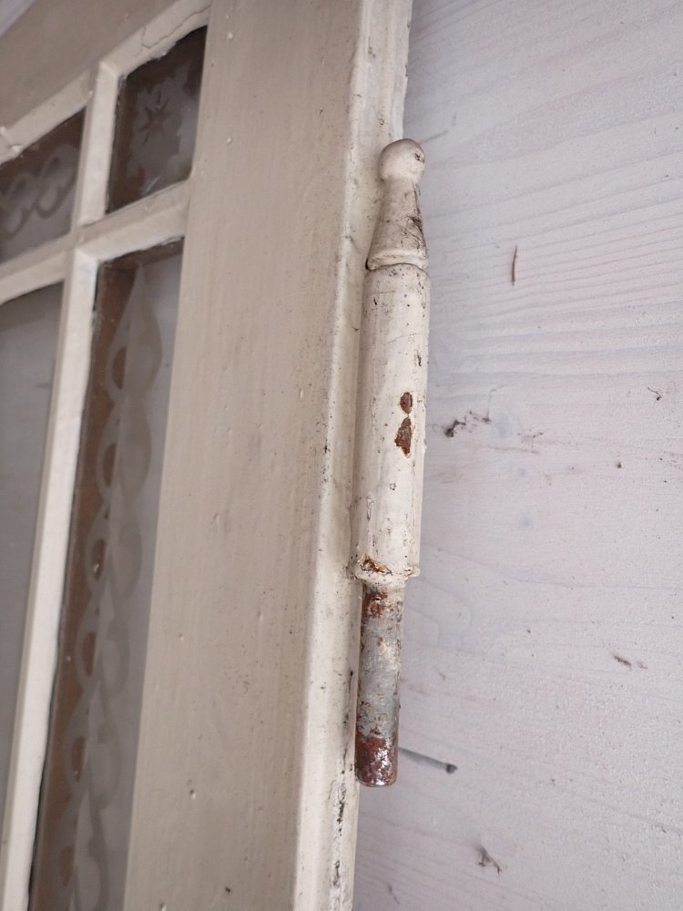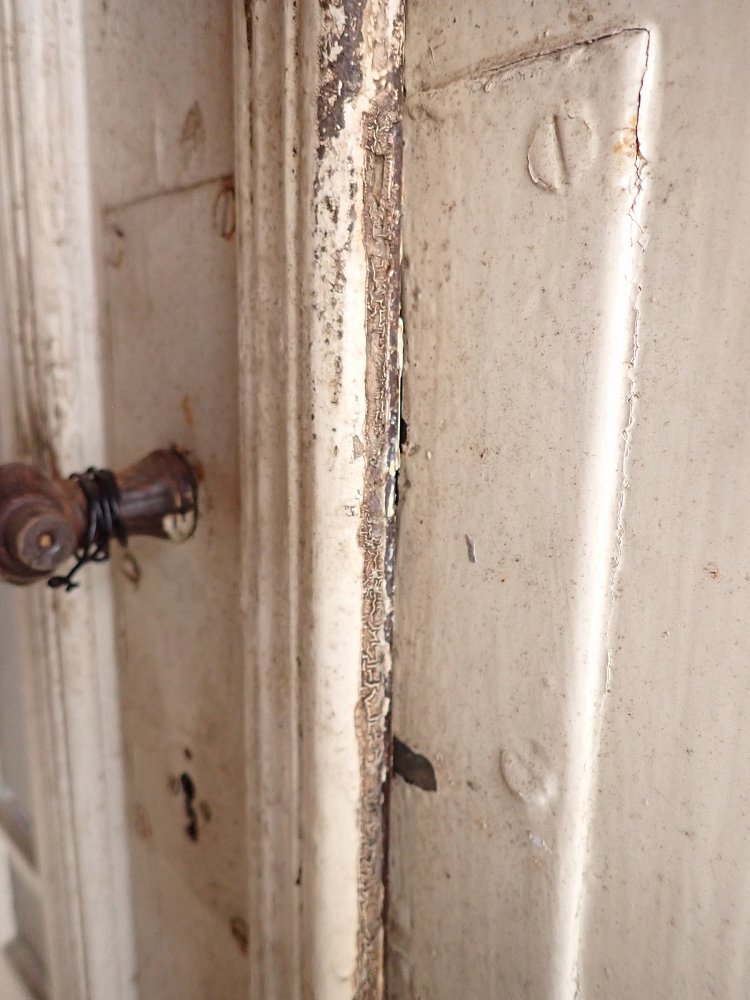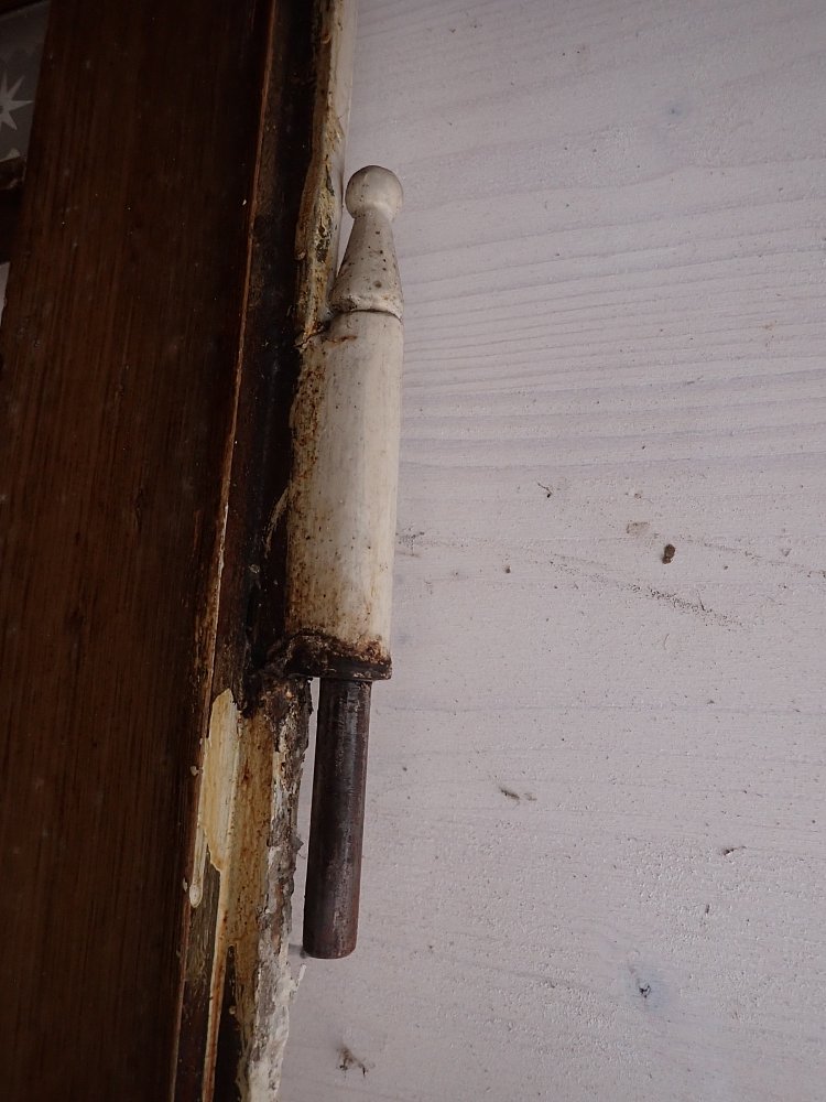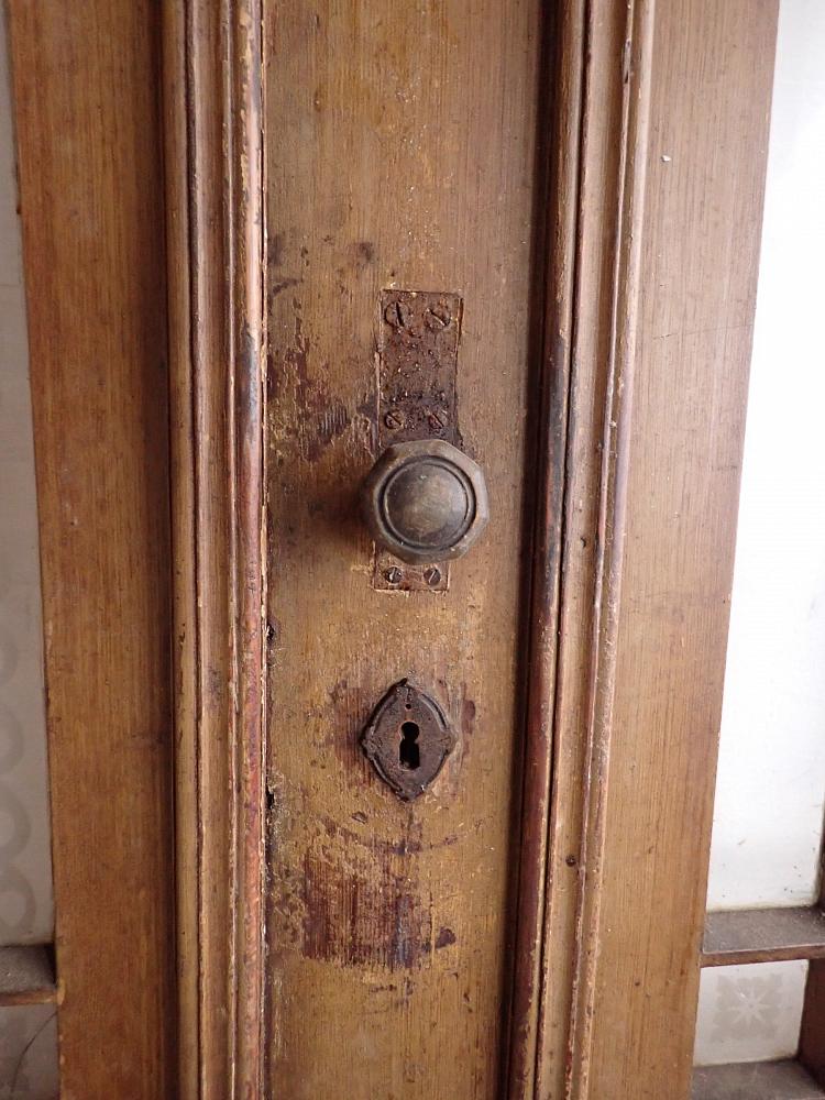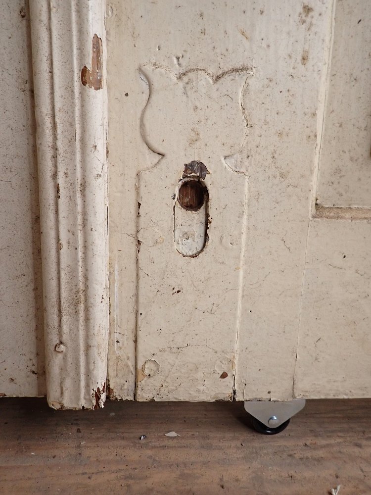 Die Tür ist in einem soliden Zustand. Sie weist Gebrauchsspuren wie abblättender Lack und kleine Beschädigungen auf der Oberfläche auf. Es sind Spuren eines Holzwurms zu erkennen.