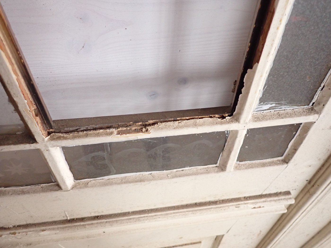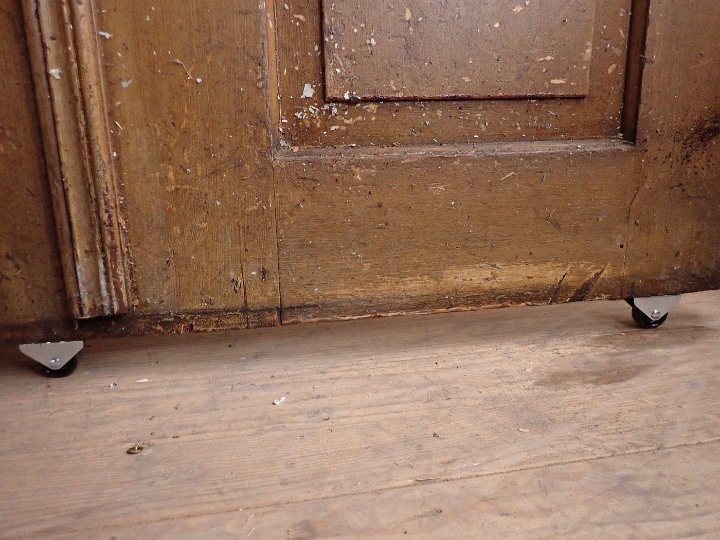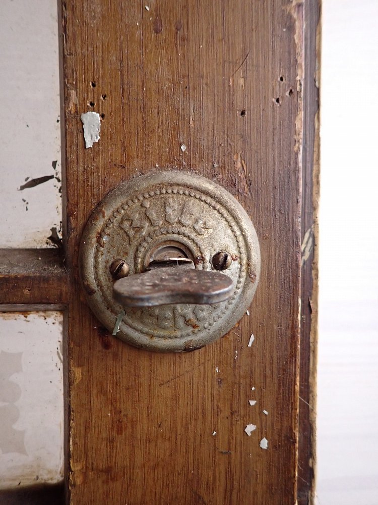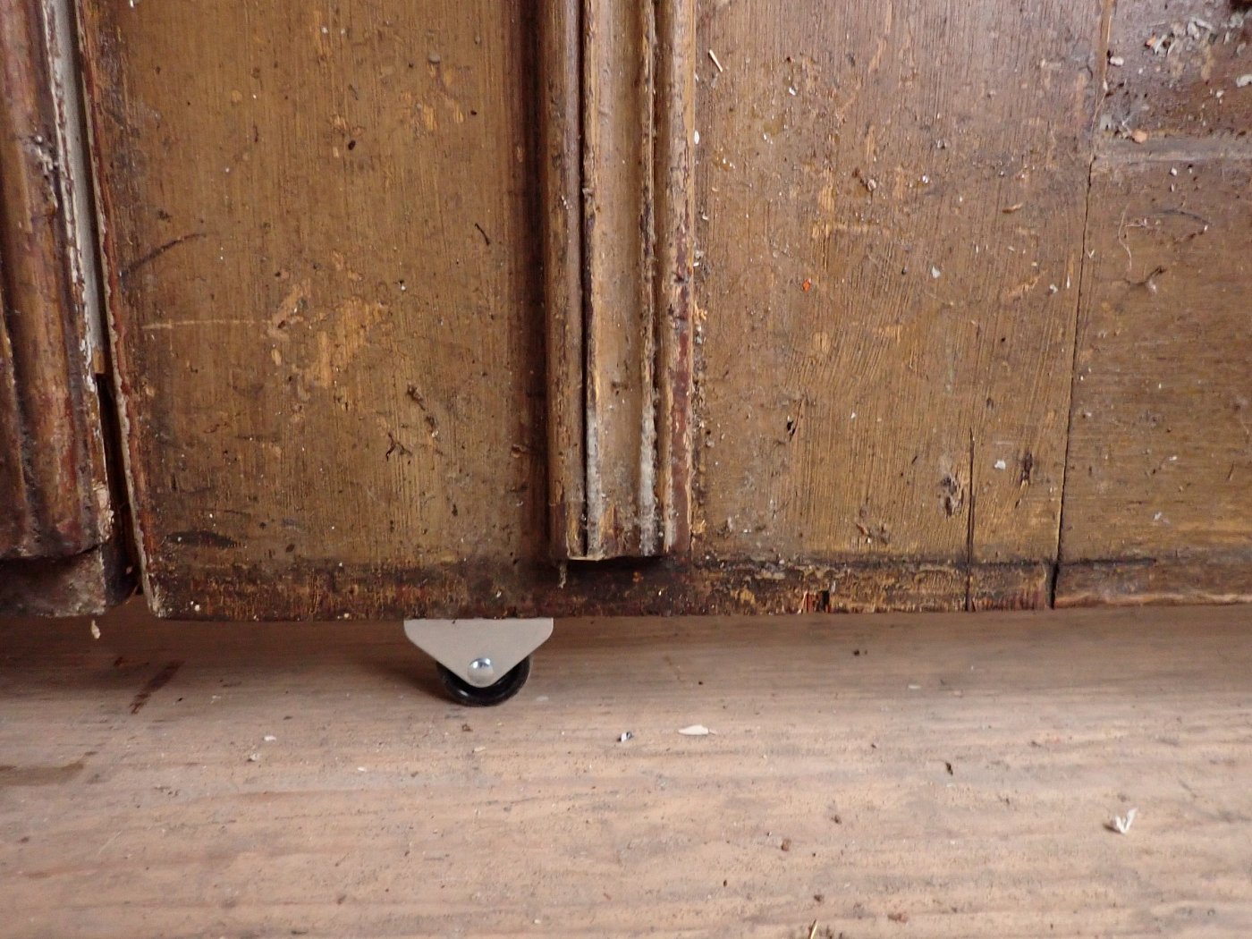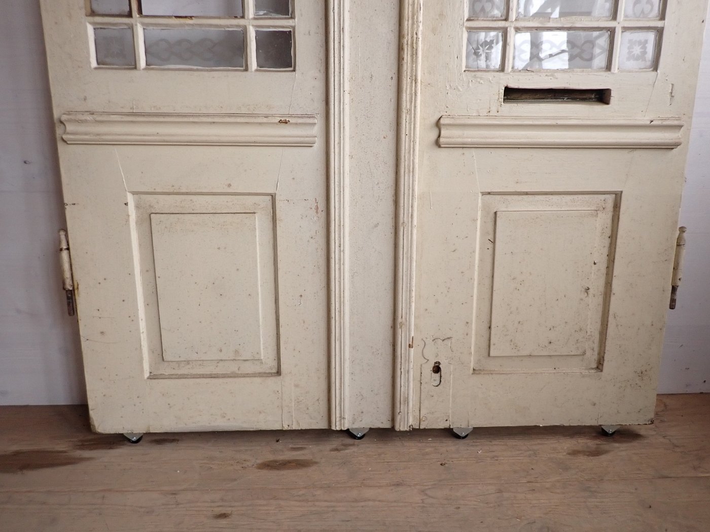 Die Tür ist in einem soliden Zustand. Sie weist Gebrauchsspuren wie abblättender Lack und kleine Beschädigungen auf der Oberfläche auf. Es sind Spuren eines Holzwurms zu erkennen.