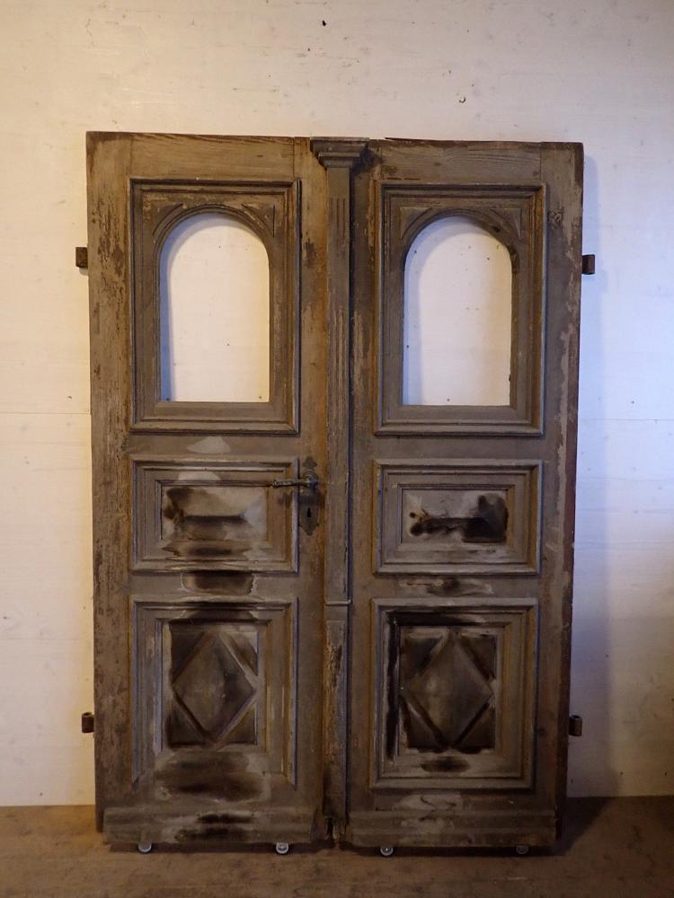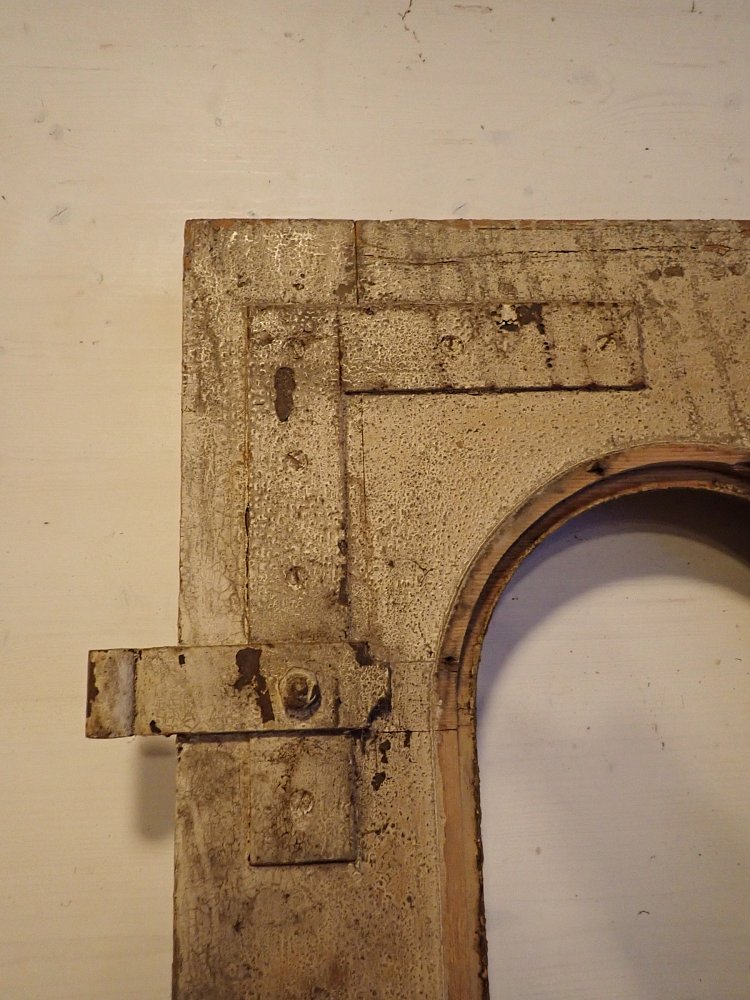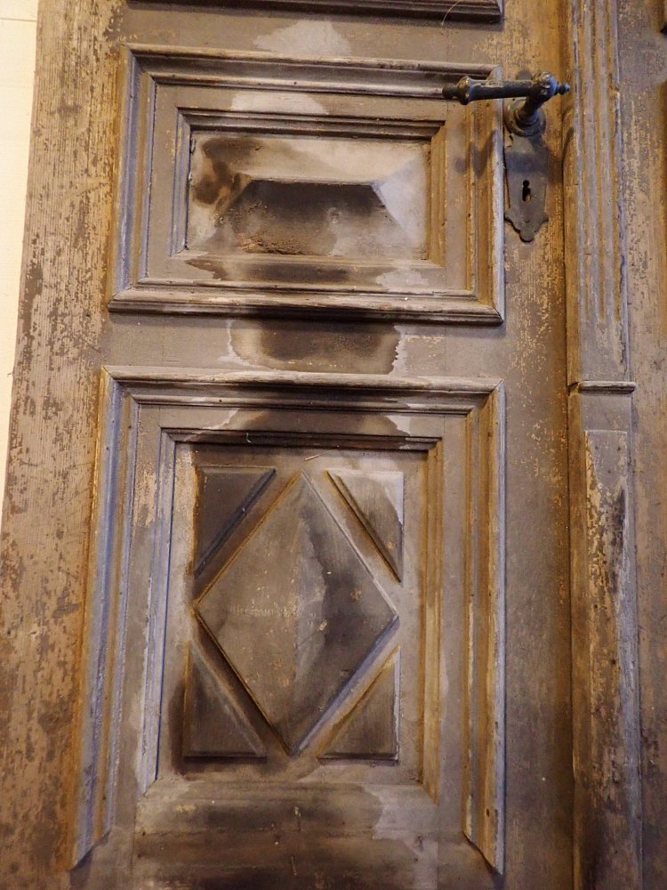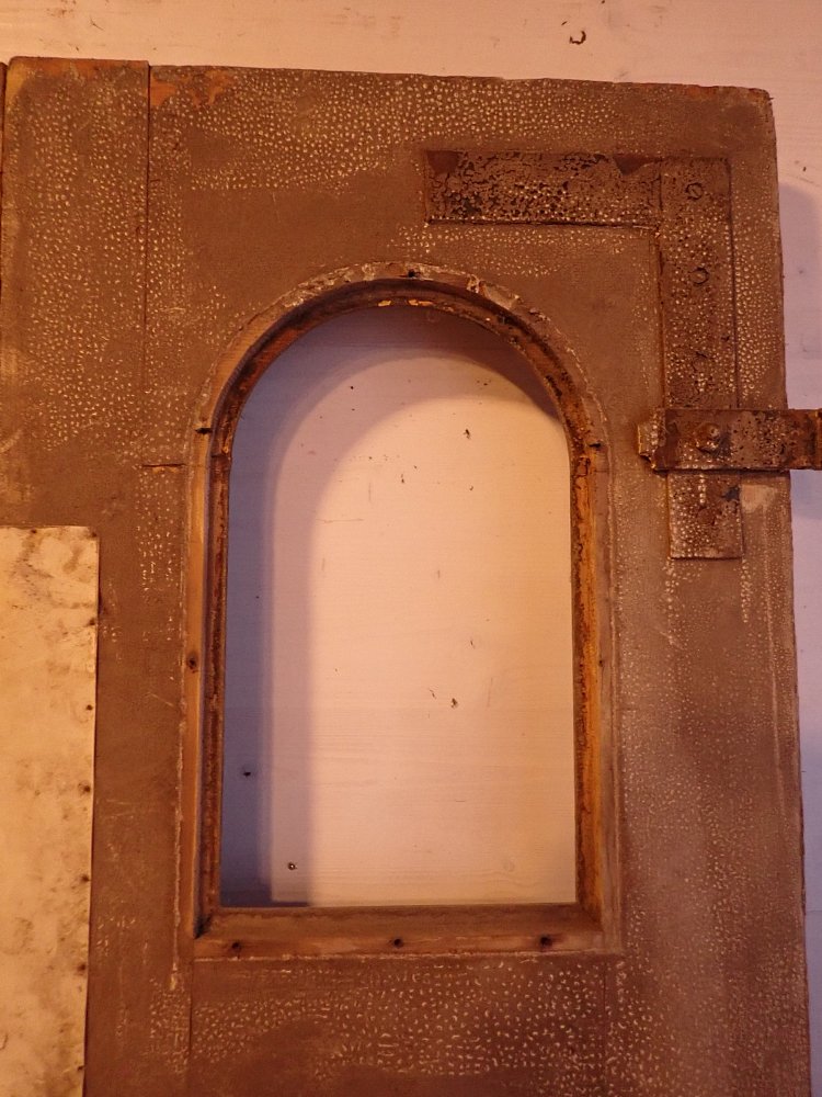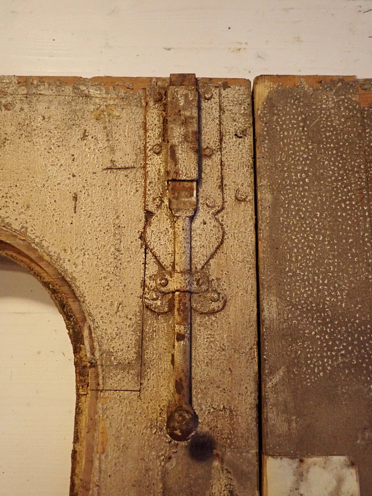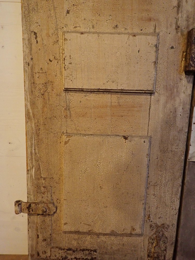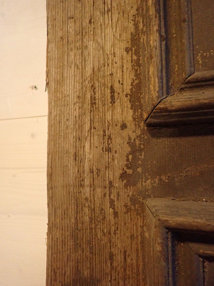 Die beiden Rundbogenfenster fehlen und lassen somit eigene Wünsche umsetzen. Ansonsten ist die Tür in einem soliden Zustand. Der Lack blättert ab, der untere Teil der Schlagleiste fehlt und es sind Spuren eines Holzwurms sind erkennbar. Beides lässt sich beheben. Der Lack ist mit Ablaugen entfernbar und ein möglich aktiver Holzwurm durch eine thermische Behandlung.