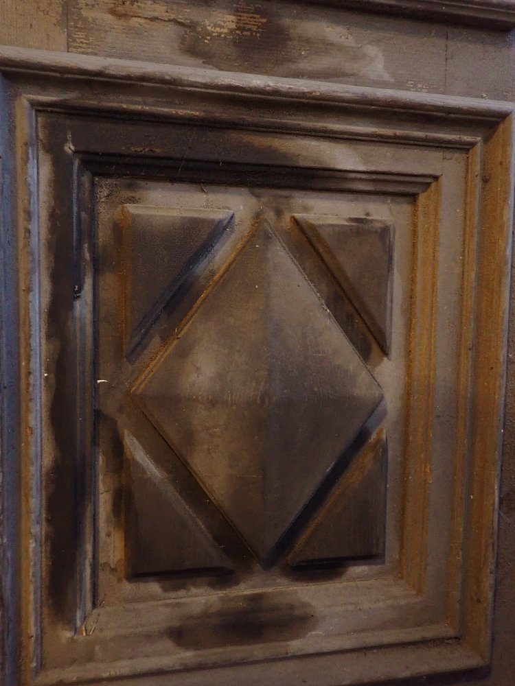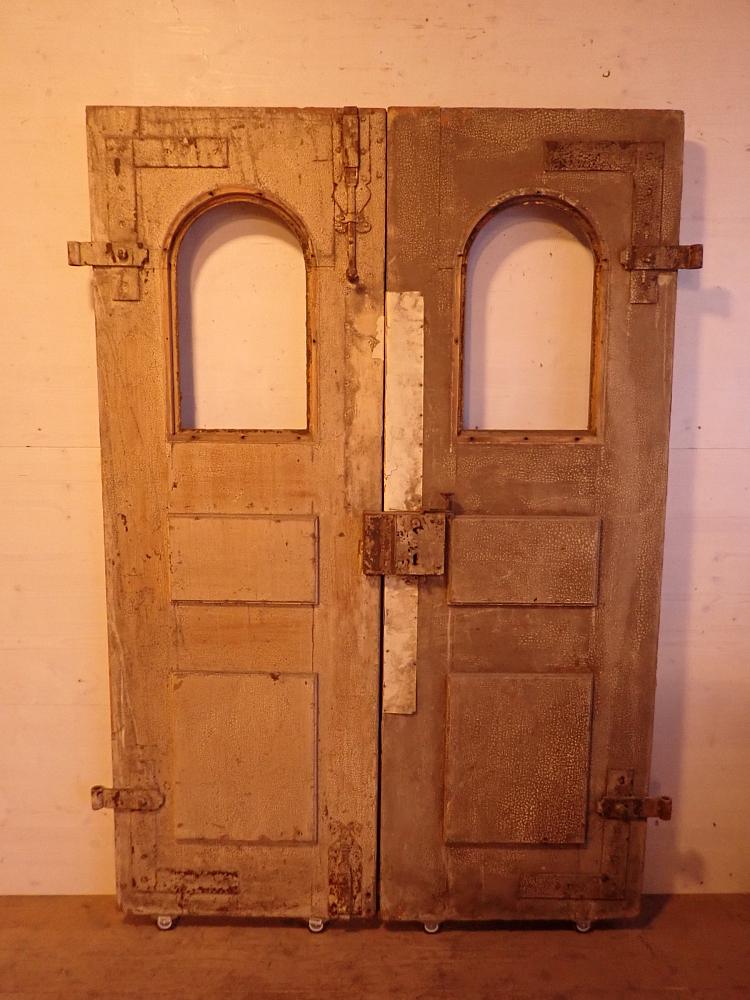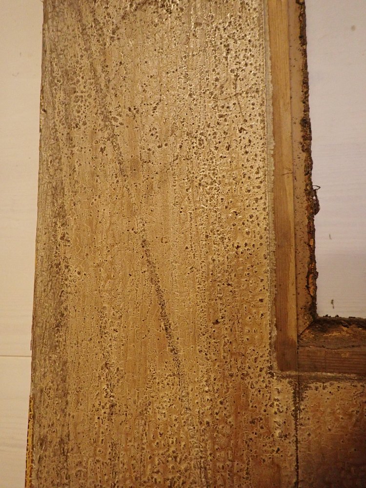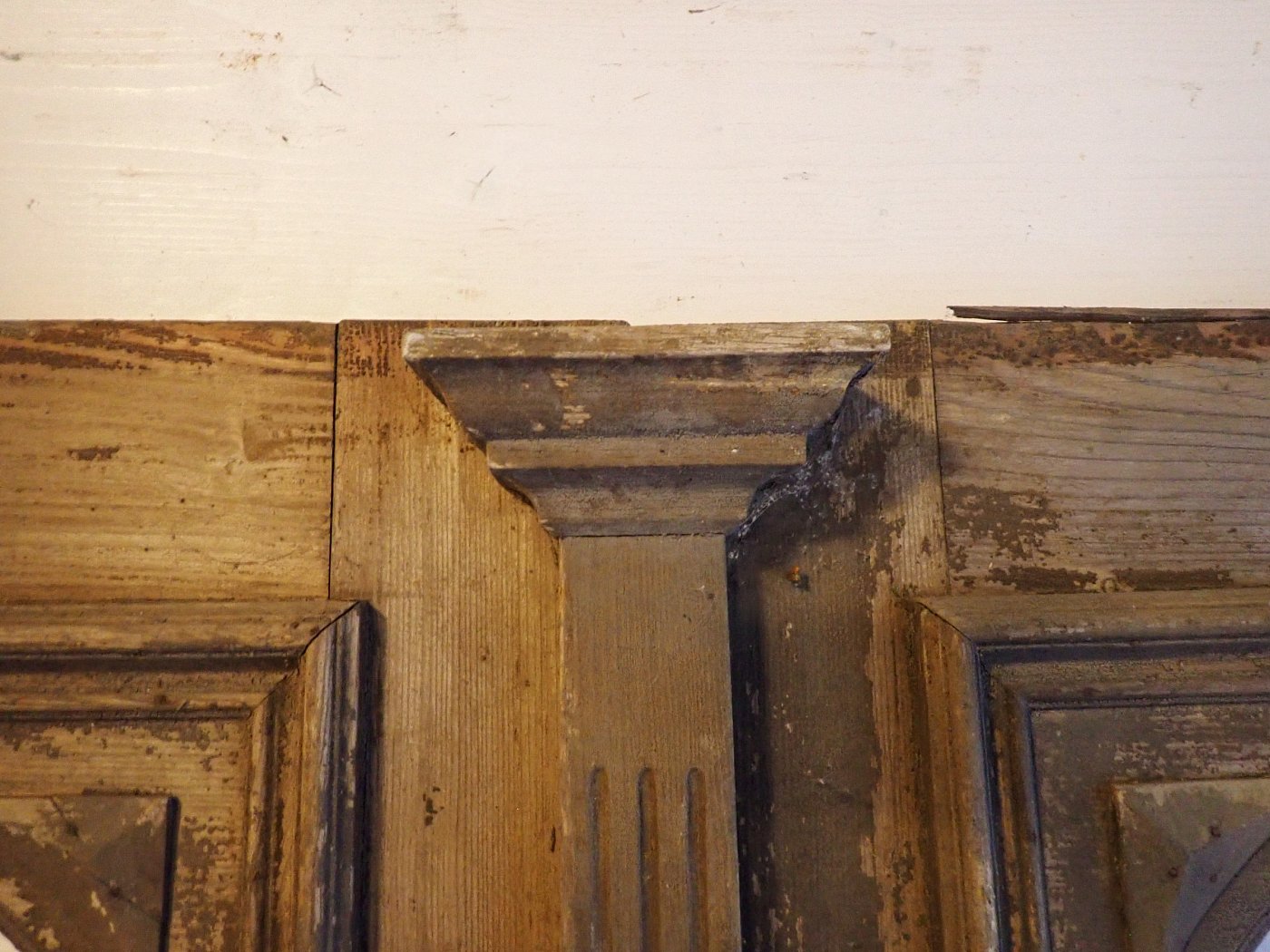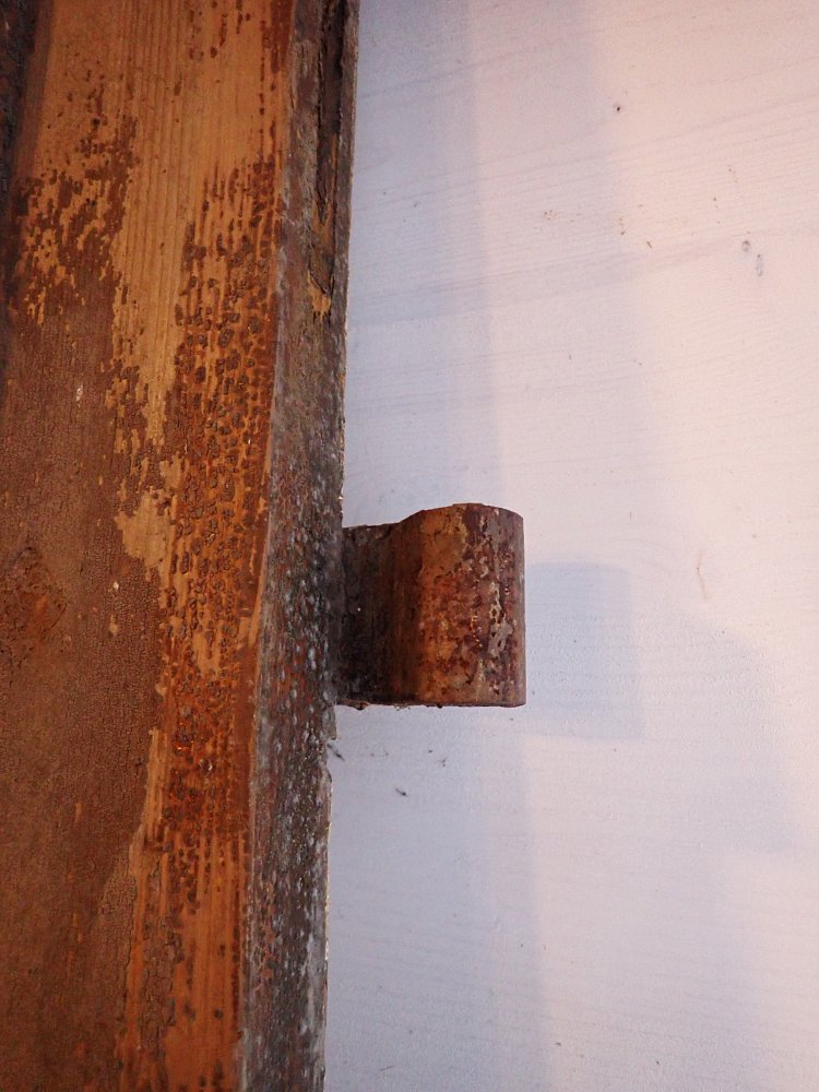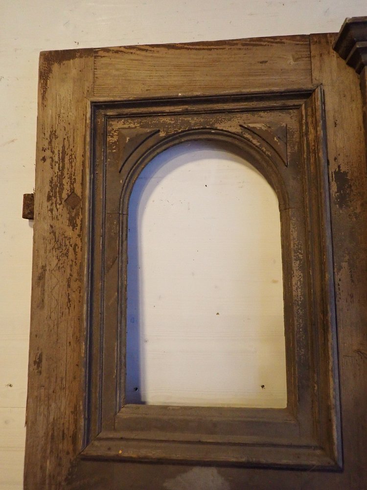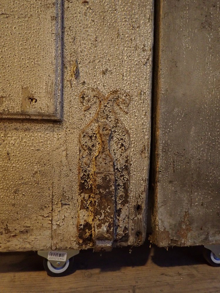 Die beiden Rundbogenfenster fehlen und lassen somit eigene Wünsche umsetzen. Ansonsten ist die Tür in einem soliden Zustand. Der Lack blättert ab, der untere Teil der Schlagleiste fehlt und es sind Spuren eines Holzwurms sind erkennbar. Beides lässt sich beheben. Der Lack ist mit Ablaugen entfernbar und ein möglich aktiver Holzwurm durch eine thermische Behandlung.