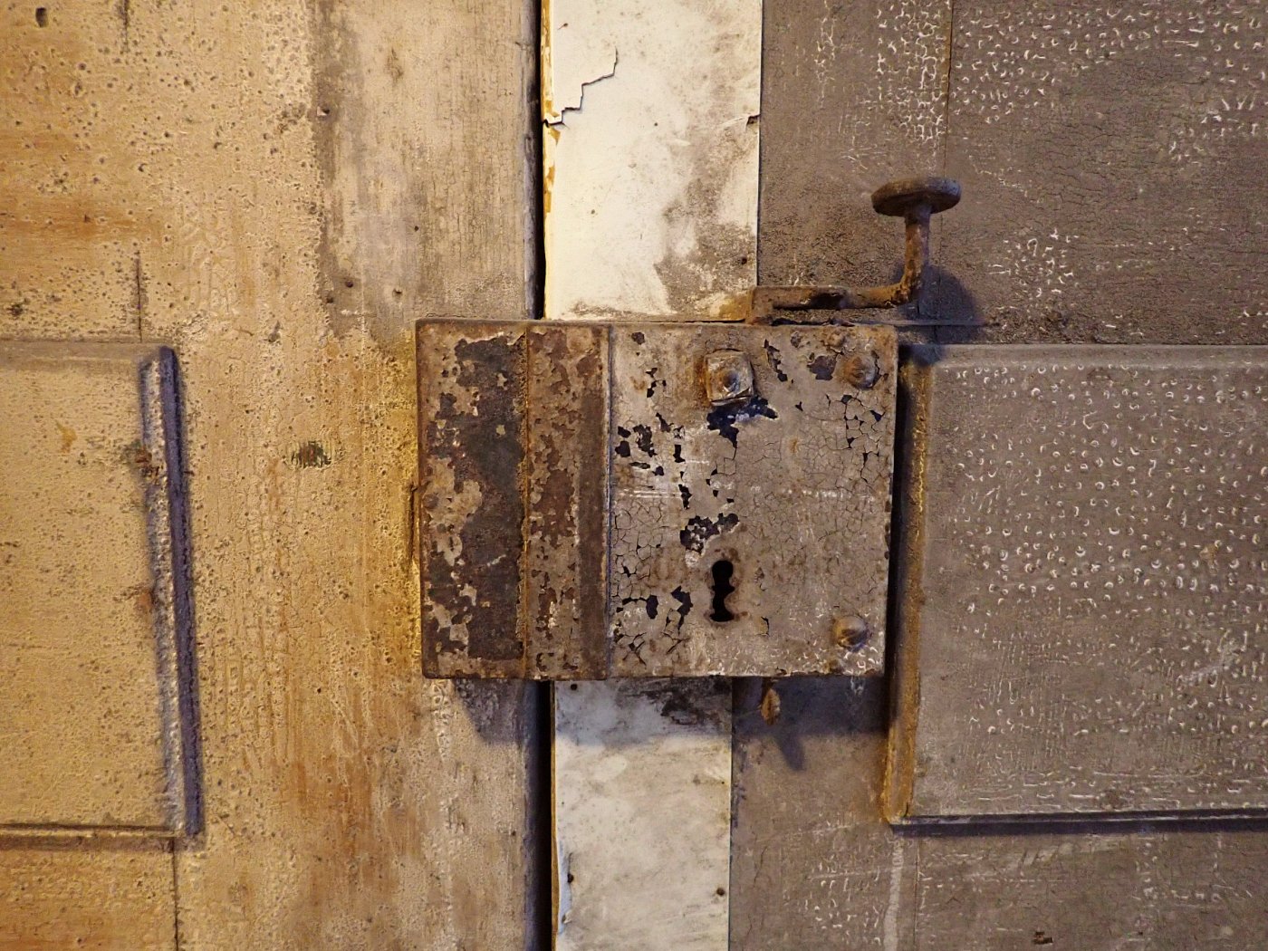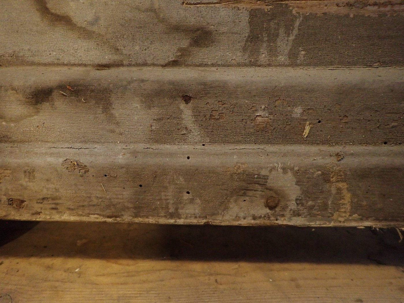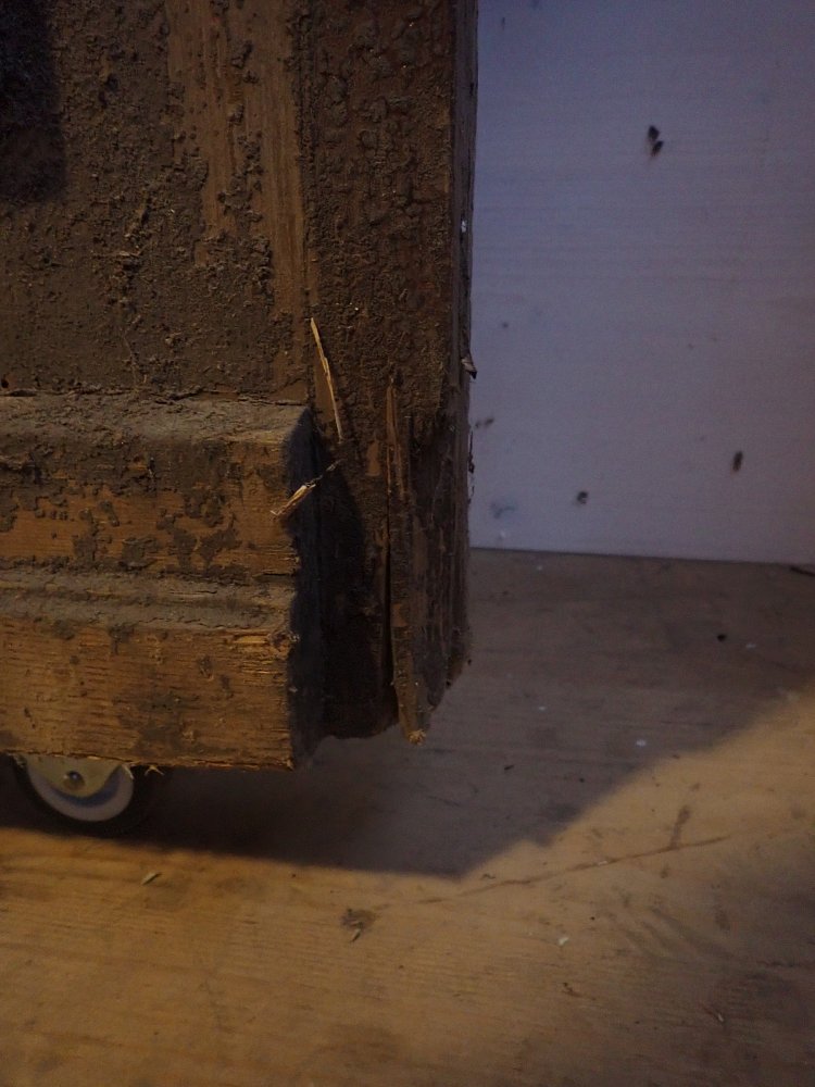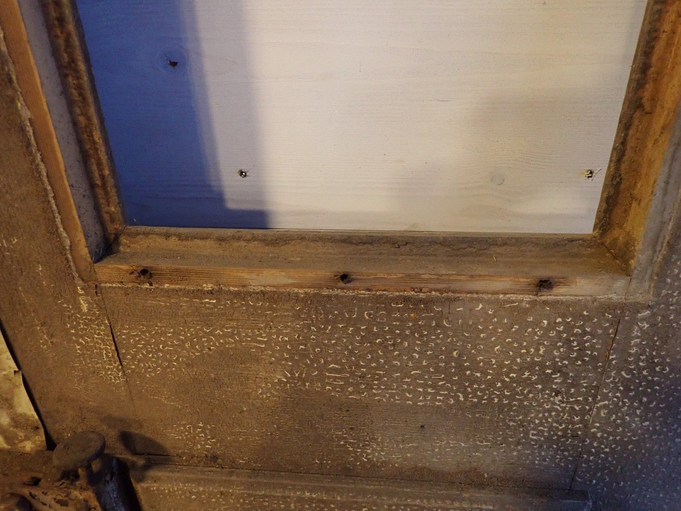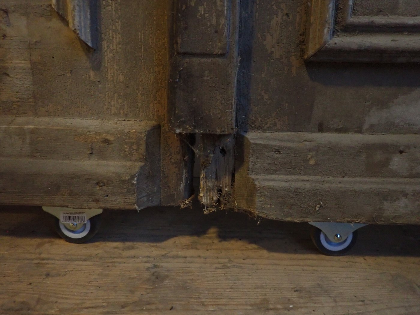 Die beiden Rundbogenfenster fehlen und lassen somit eigene Wünsche umsetzen. Ansonsten ist die Tür in einem soliden Zustand. Der Lack blättert ab, der untere Teil der Schlagleiste fehlt und es sind Spuren eines Holzwurms sind erkennbar. Beides lässt sich beheben. Der Lack ist mit Ablaugen entfernbar und ein möglich aktiver Holzwurm durch eine thermische Behandlung.