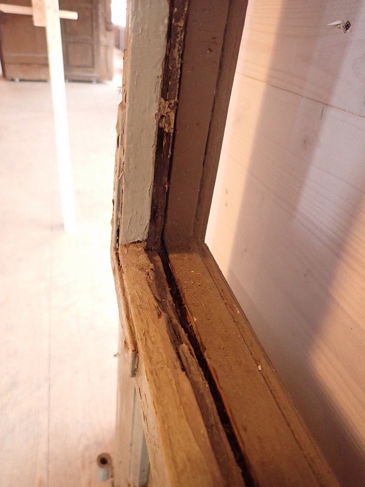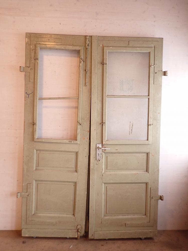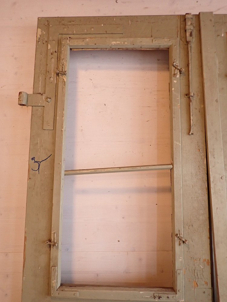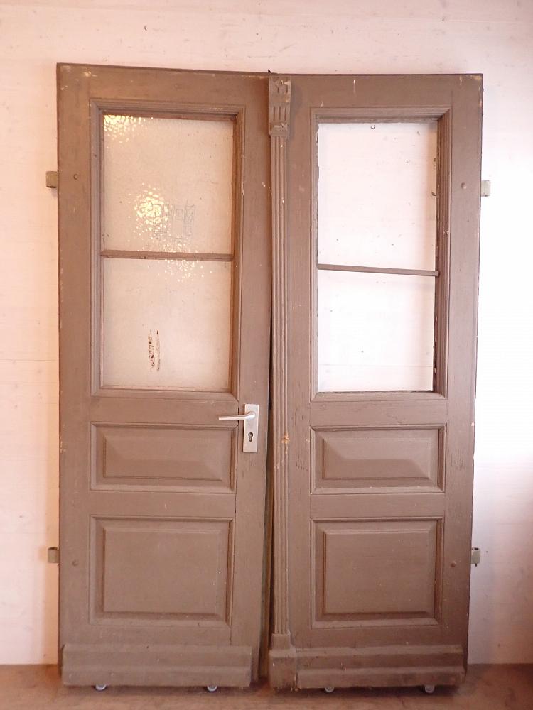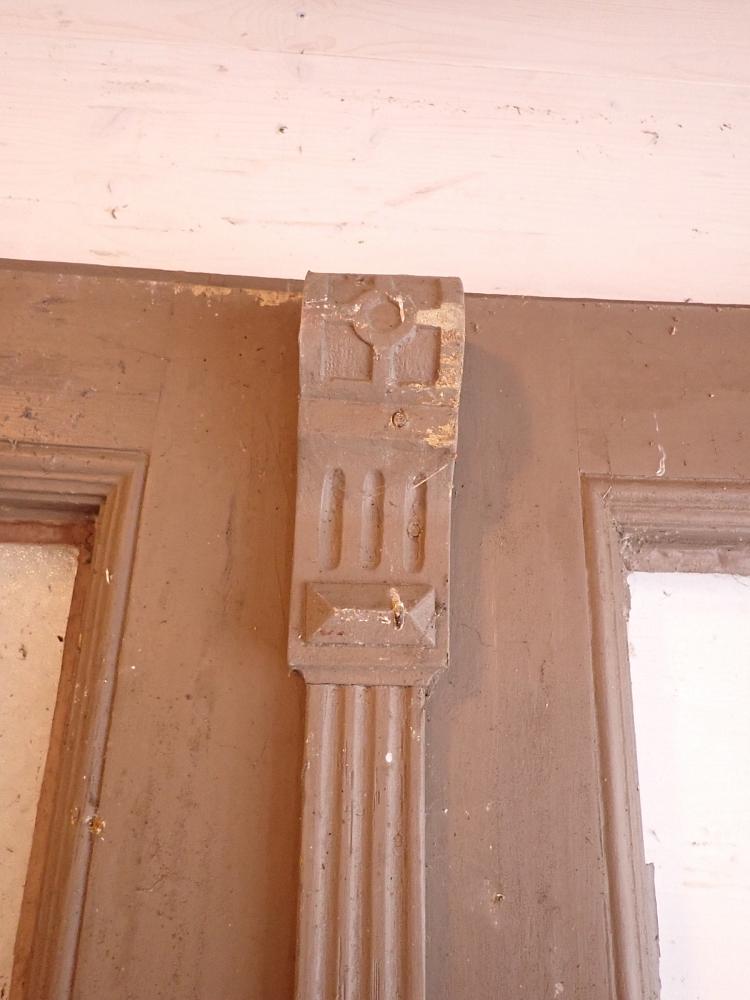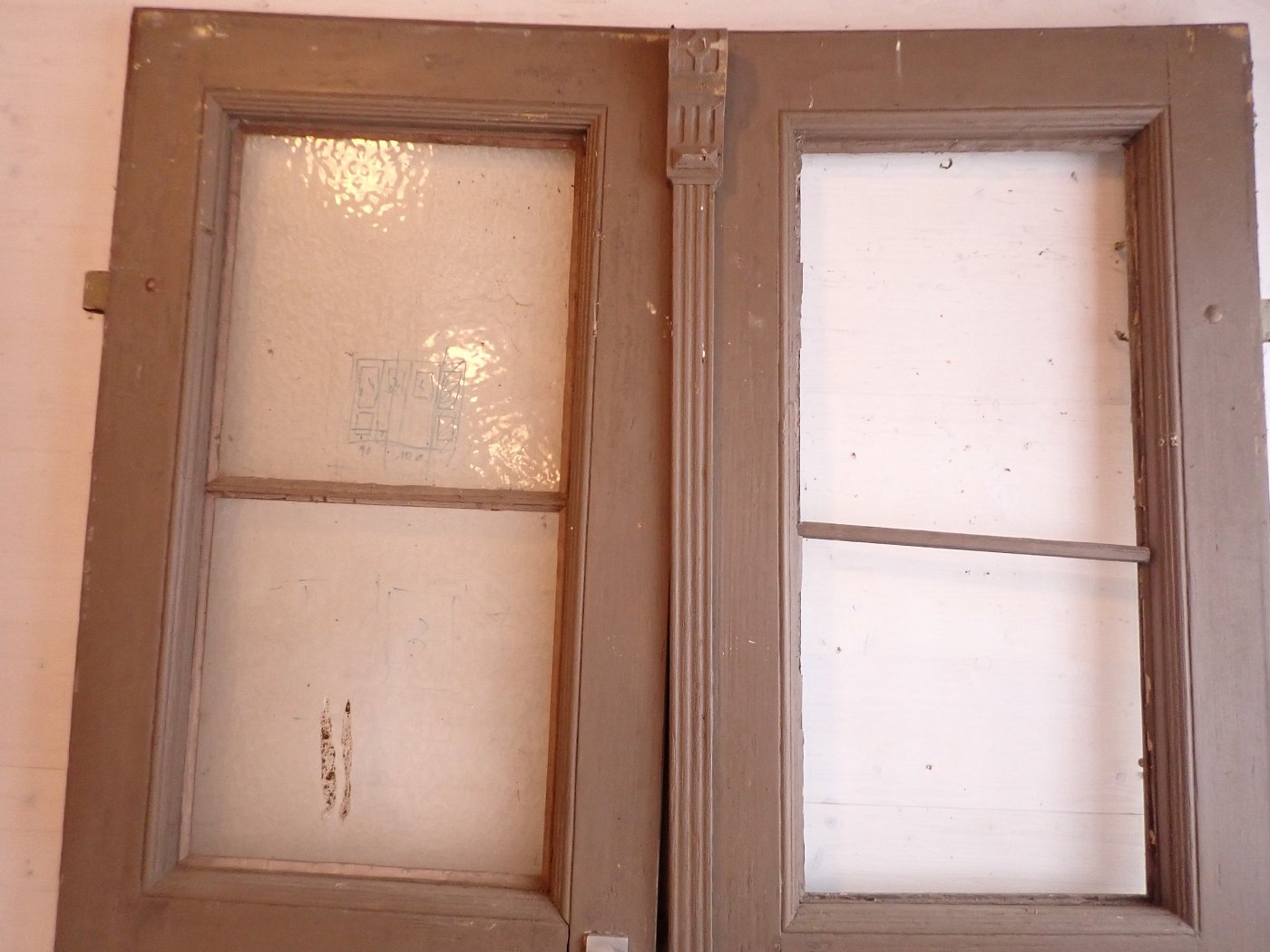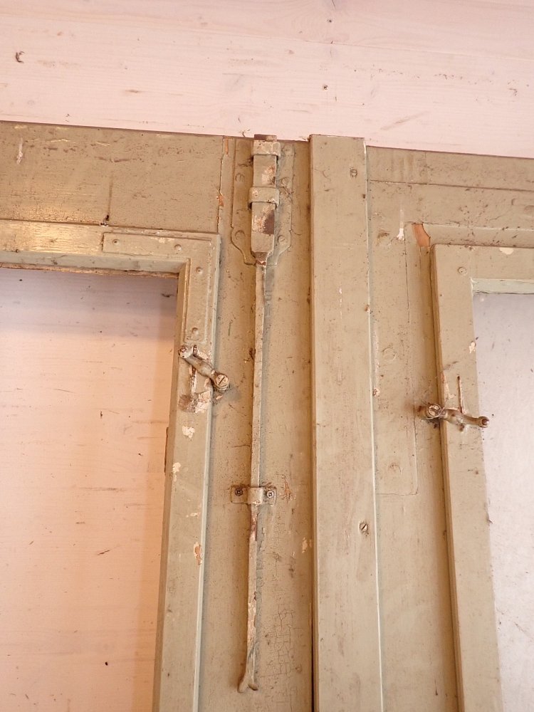 Die zweiflügelige Haustür ist aus Nadelholz gefertigt und ist mit zwei großen vertikalen Lichtfüllungen im oberen Bereich und vier Holzfüllungen im unteren Bereich gestaltet. Die Tür besitzt Klinken, Schloss sowie Riegel zum befestigen des Standflügels. Außerdem können die Fenster der Lichtöffnung geöffnet werden. Leider fehlt eins der klaren Strukturgläser.