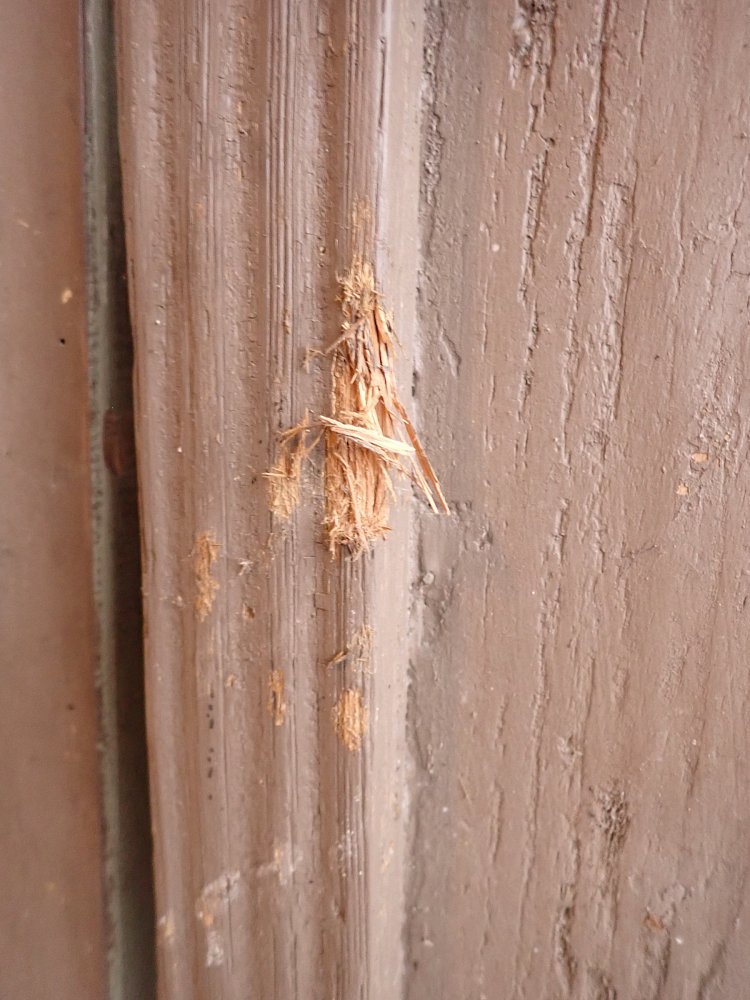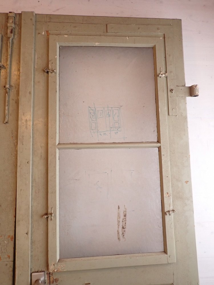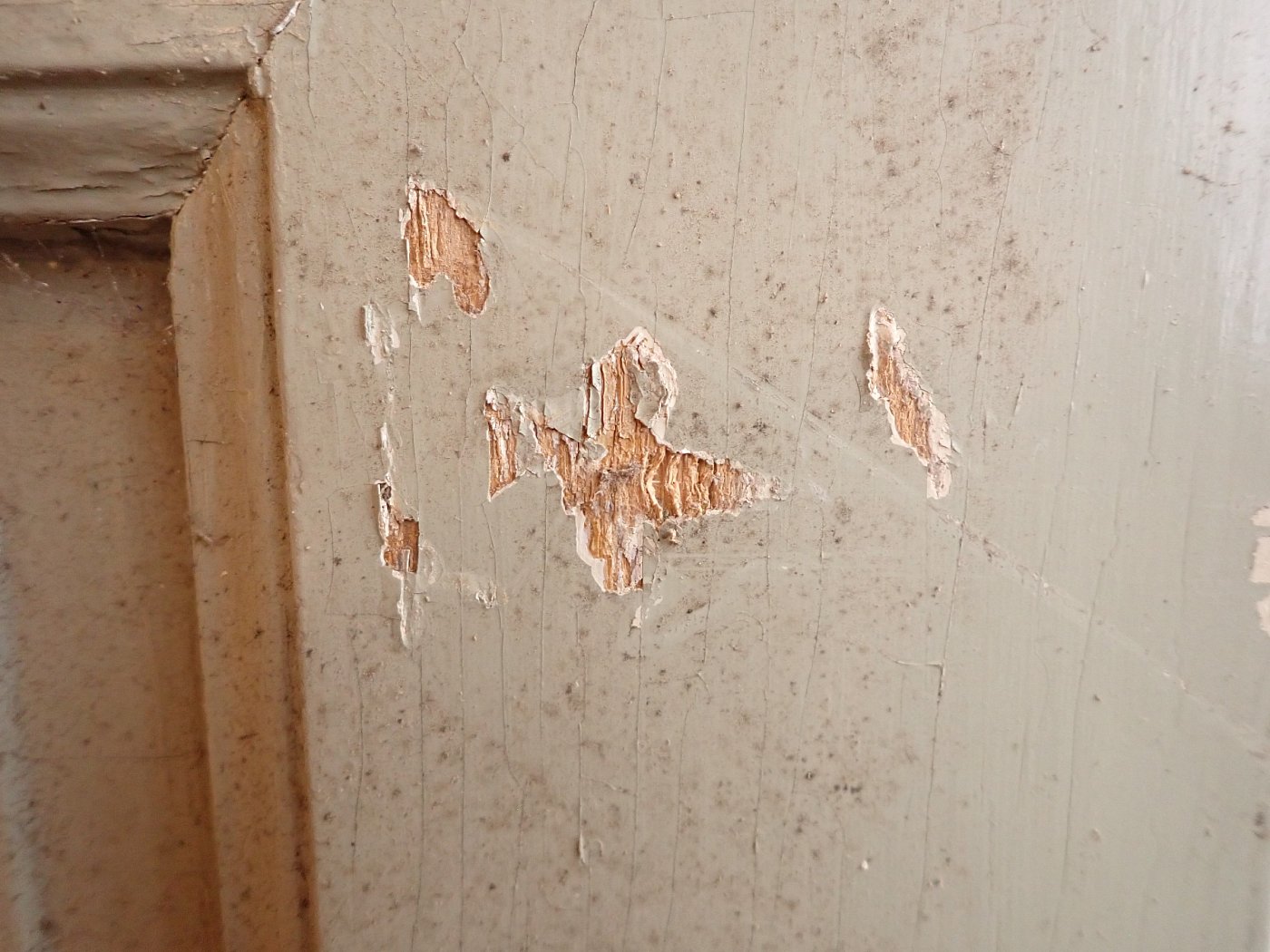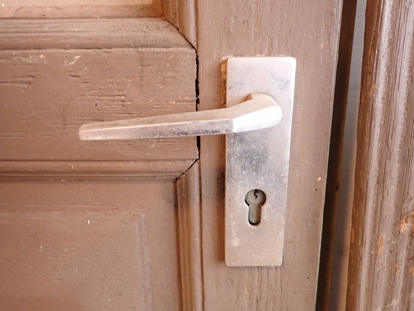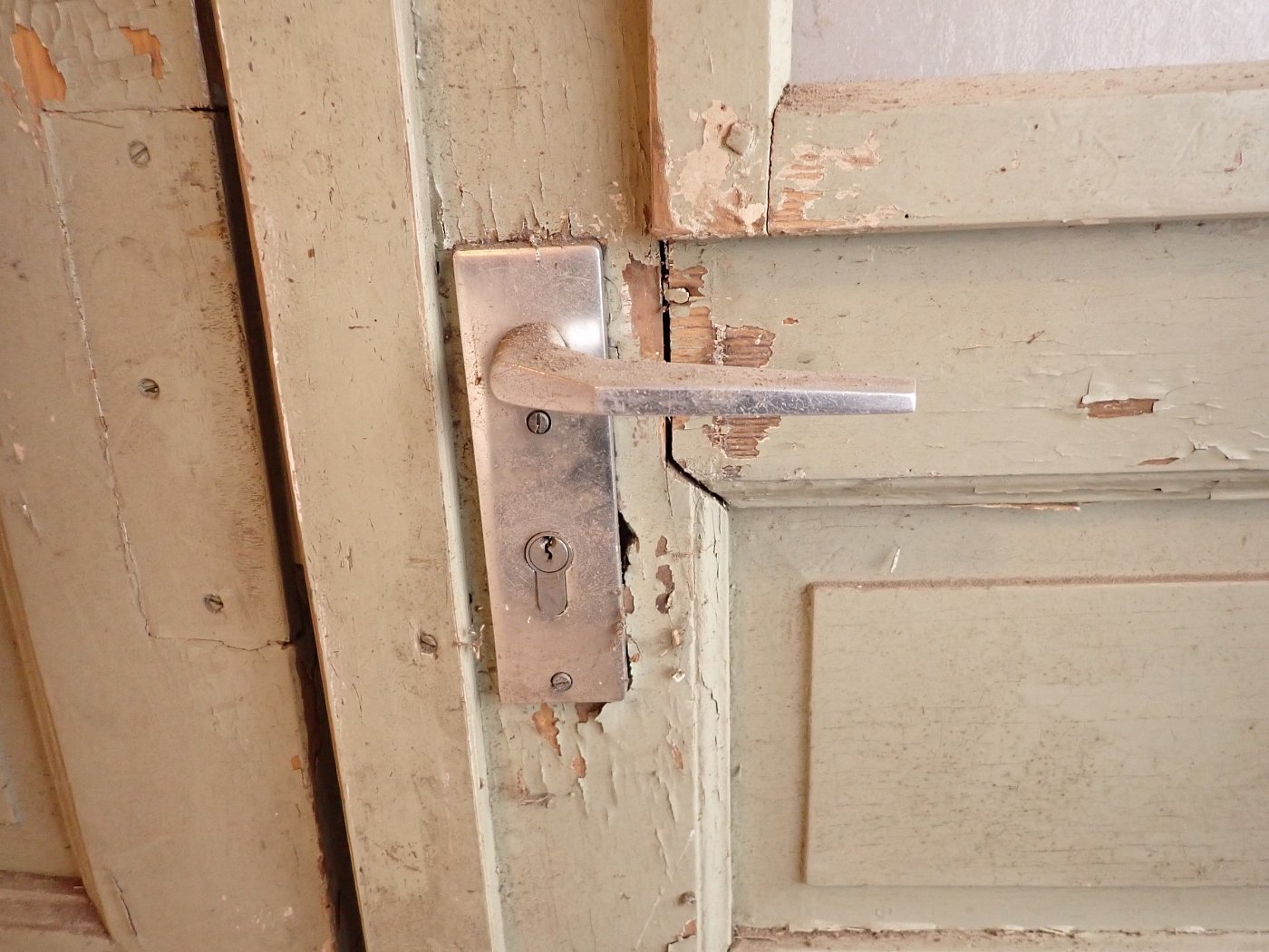 Allgemein befindet sich die Tür in einem soliden Zustand. Der Lack blättert ab, es sind kleine Macken auf der Oberfläche zu finden und am Türschild befidnet sich ein größeres Loch, weil vermutlich mal ein anderes Schloss eingebaut war.