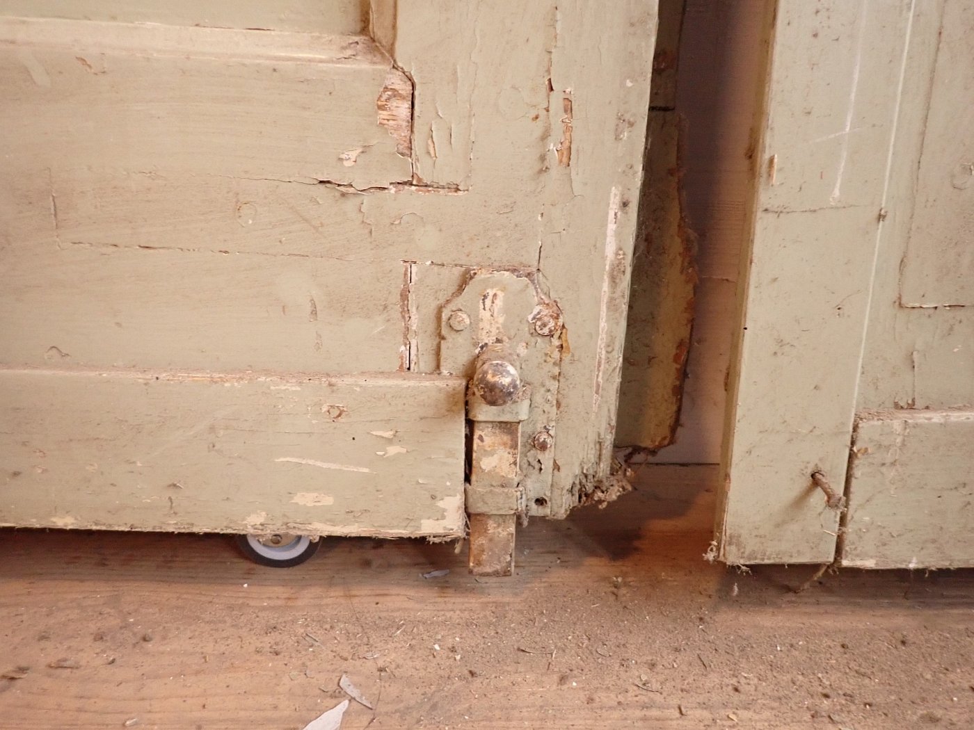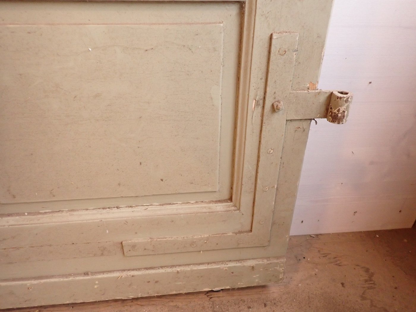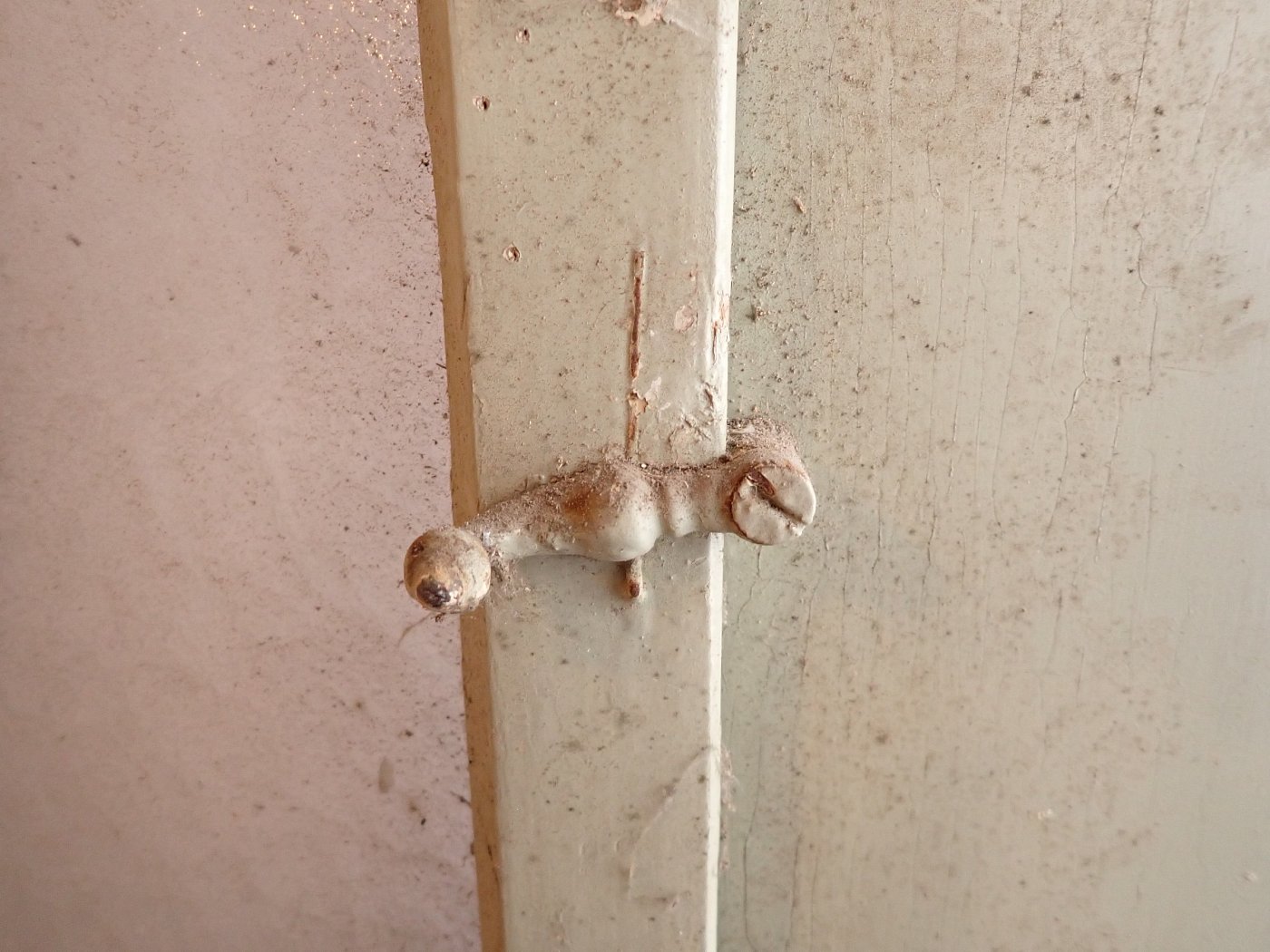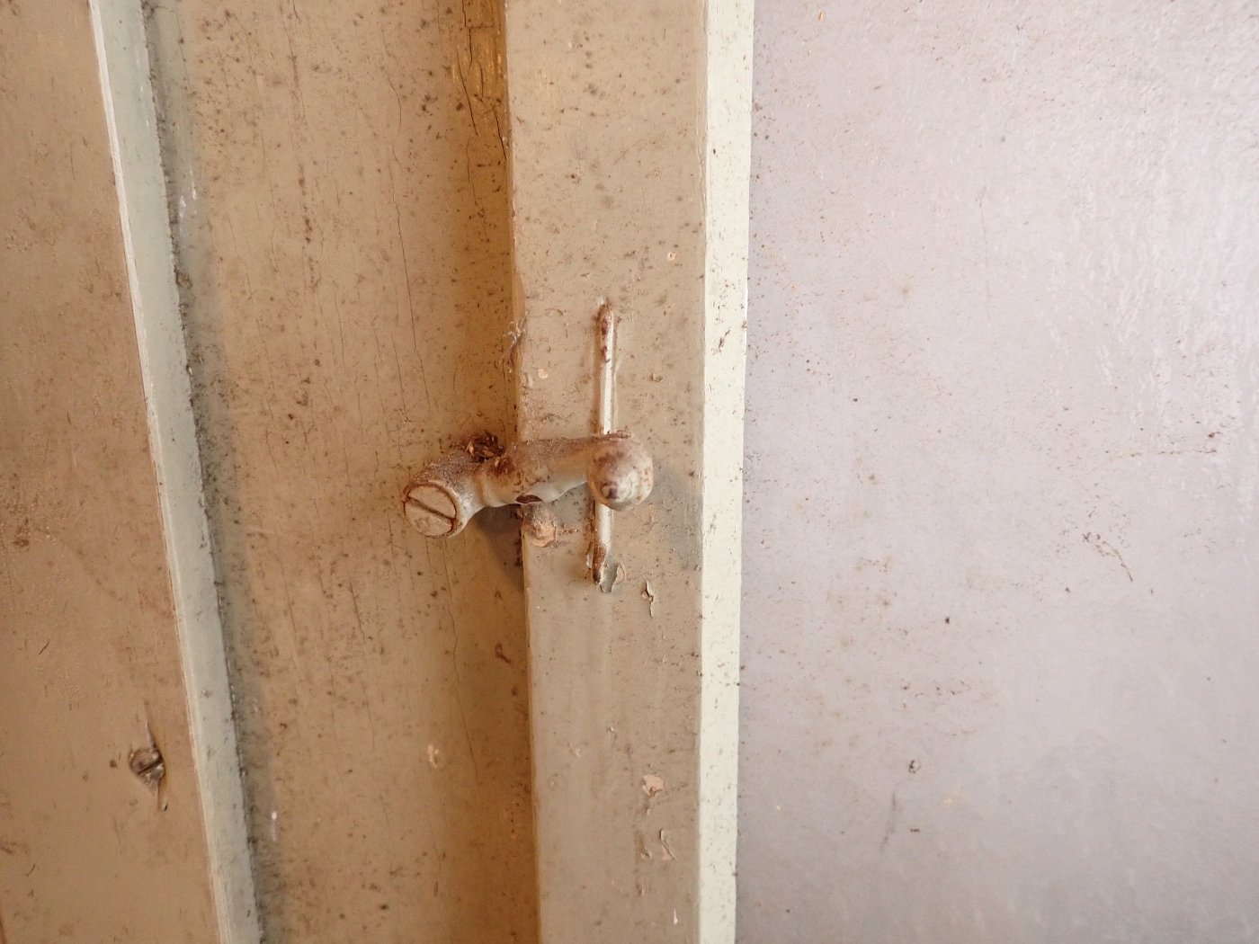 Allgemein befindet sich die Tür in einem soliden Zustand. Der Lack blättert ab, es sind kleine Macken auf der Oberfläche zu finden und am Türschild befidnet sich ein größeres Loch, weil vermutlich mal ein anderes Schloss eingebaut war.