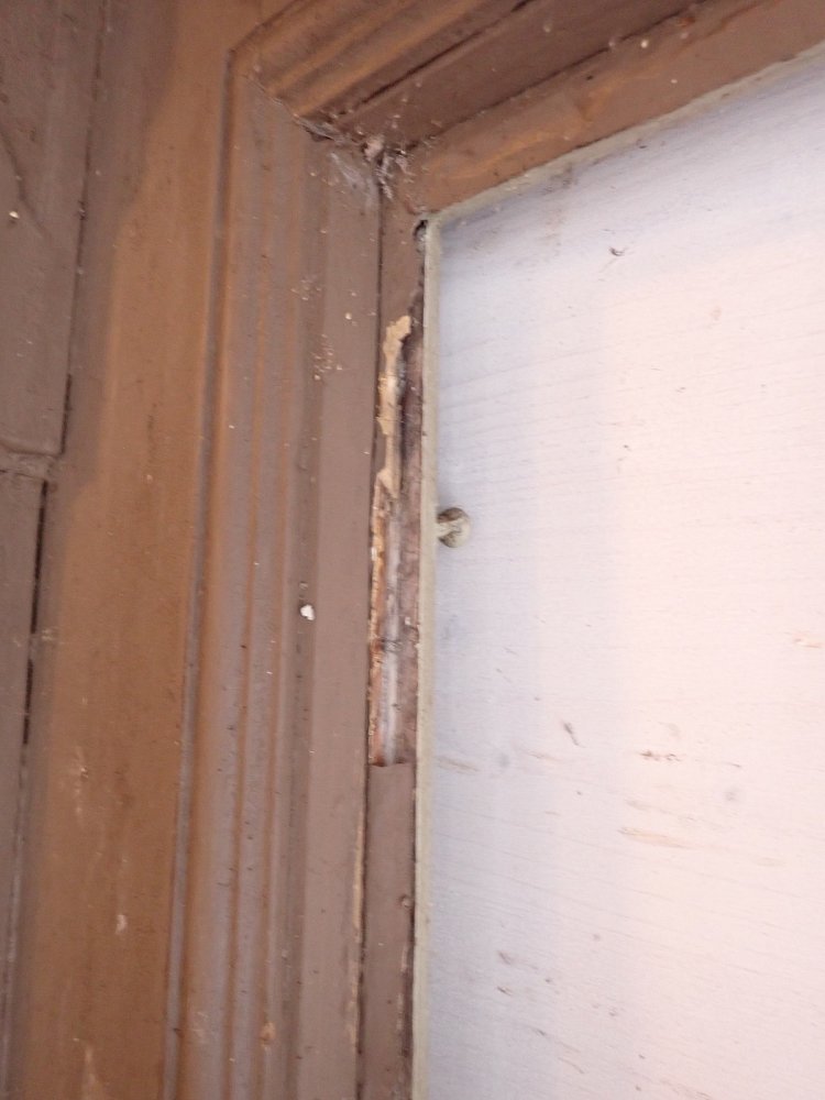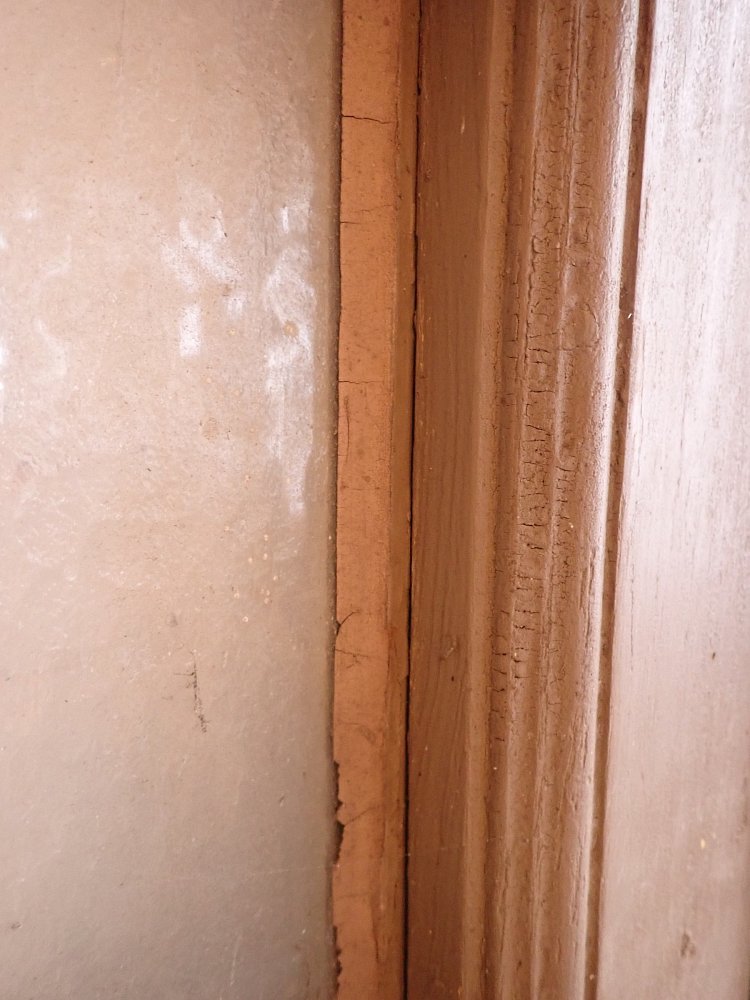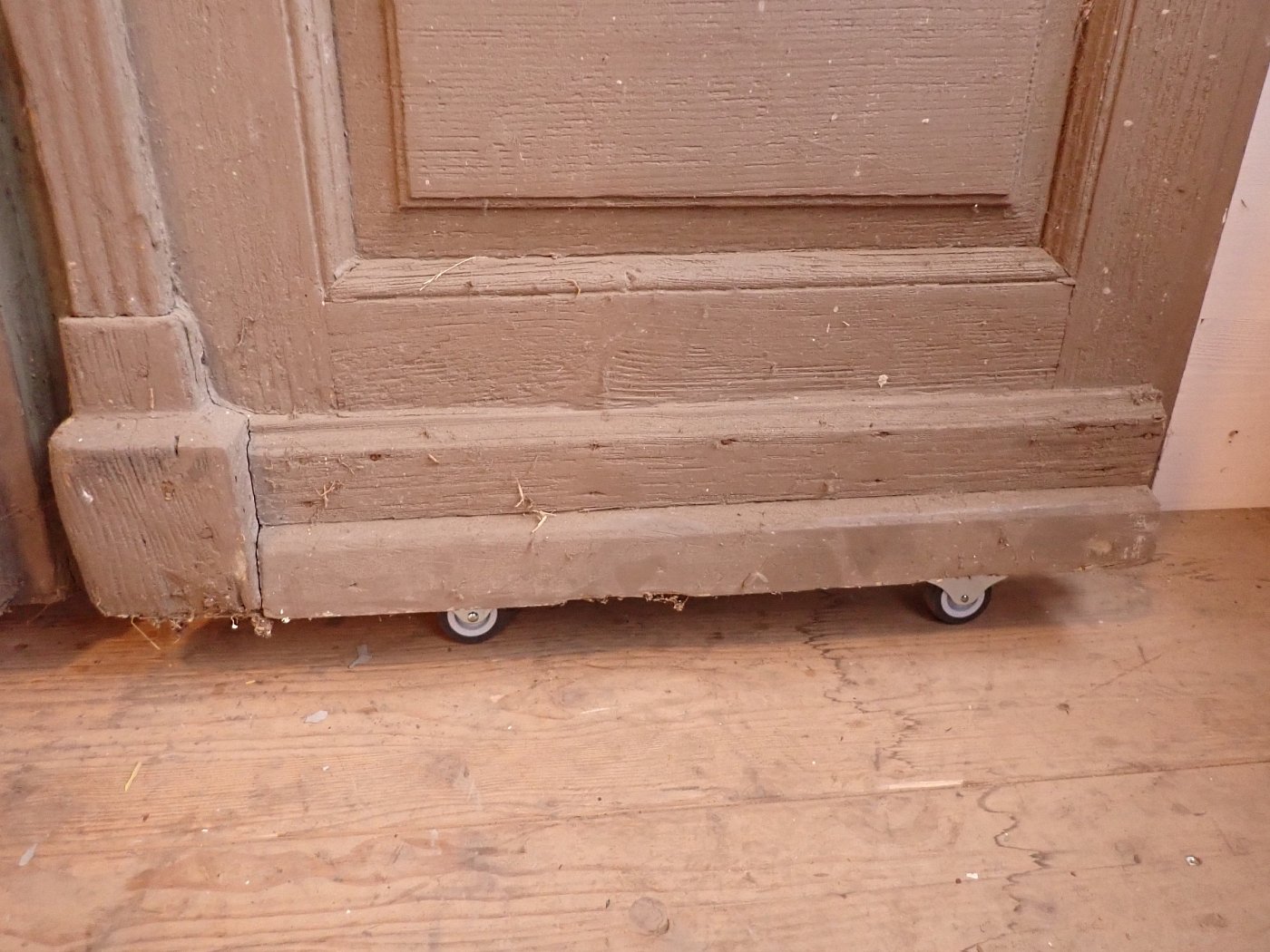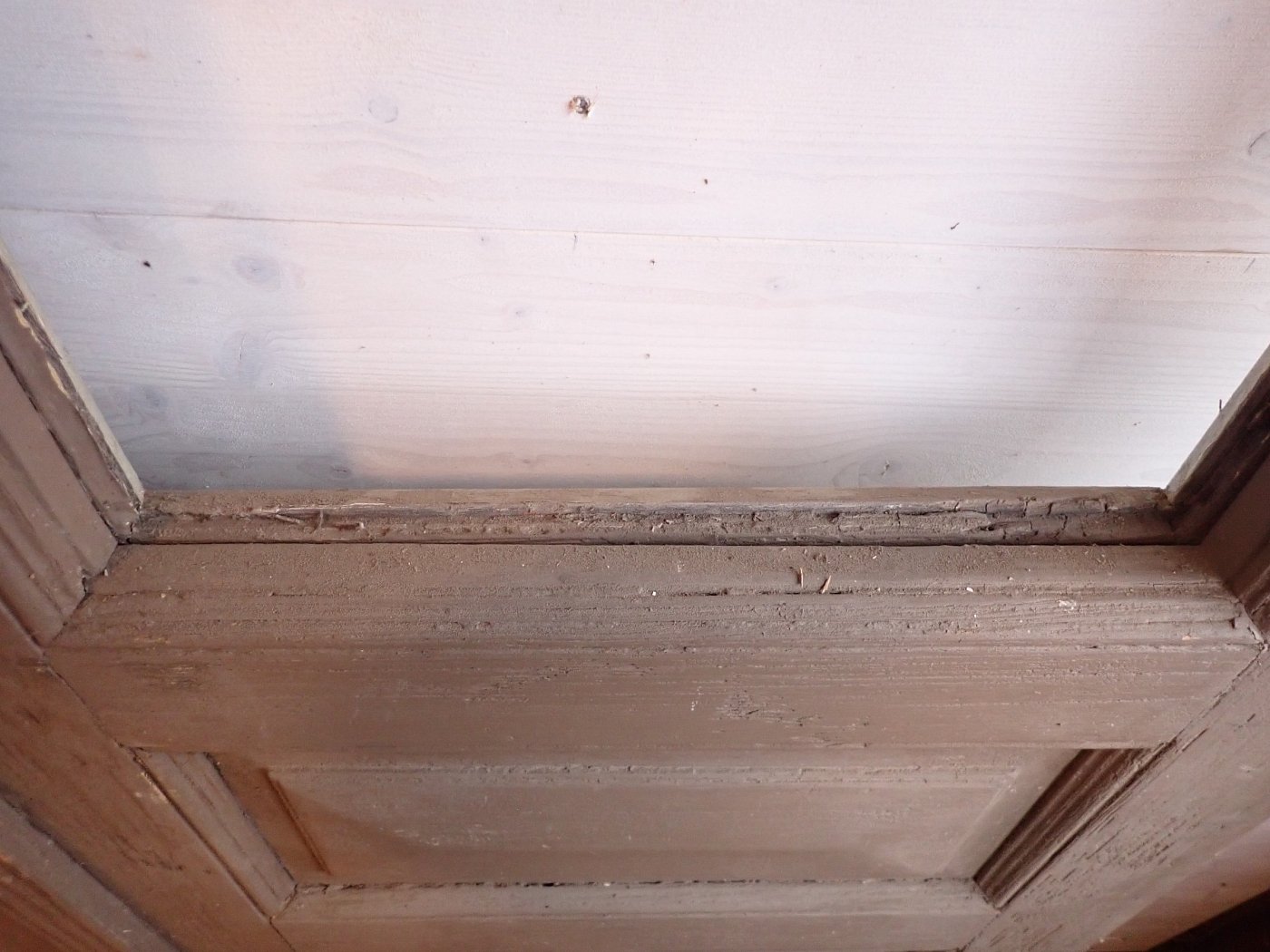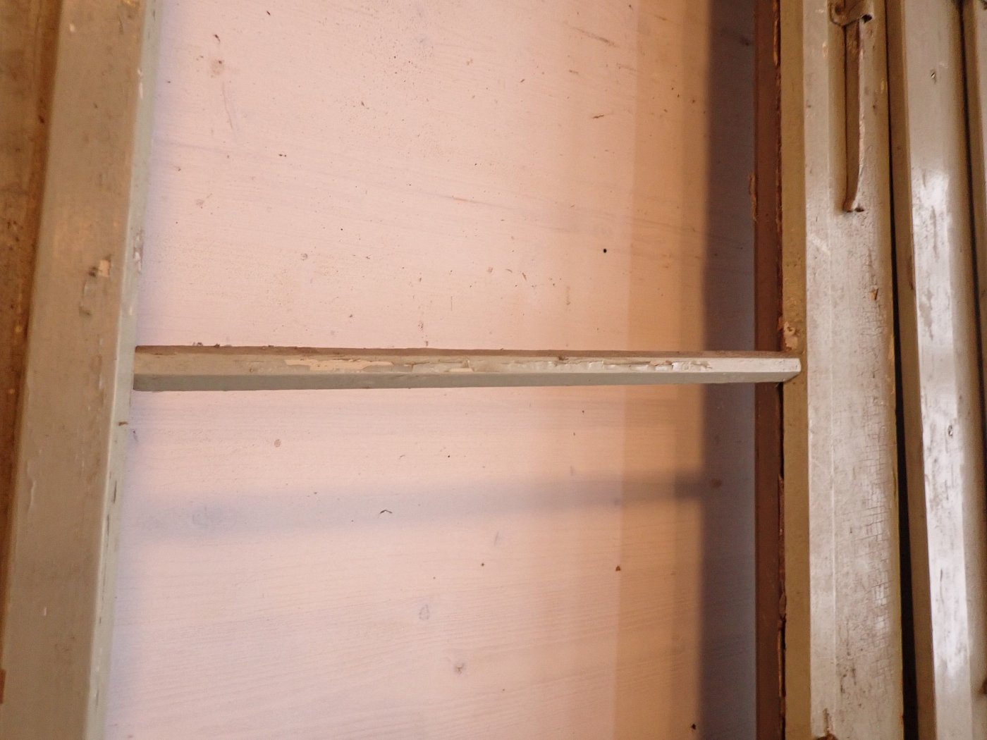 Allgemein befindet sich die Tür in einem soliden Zustand. Der Lack blättert ab, es sind kleine Macken auf der Oberfläche zu finden und am Türschild befidnet sich ein größeres Loch, weil vermutlich mal ein anderes Schloss eingebaut war.