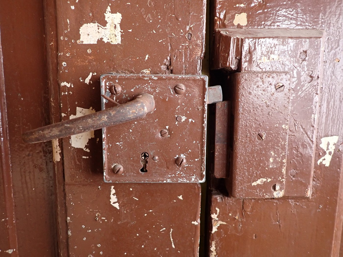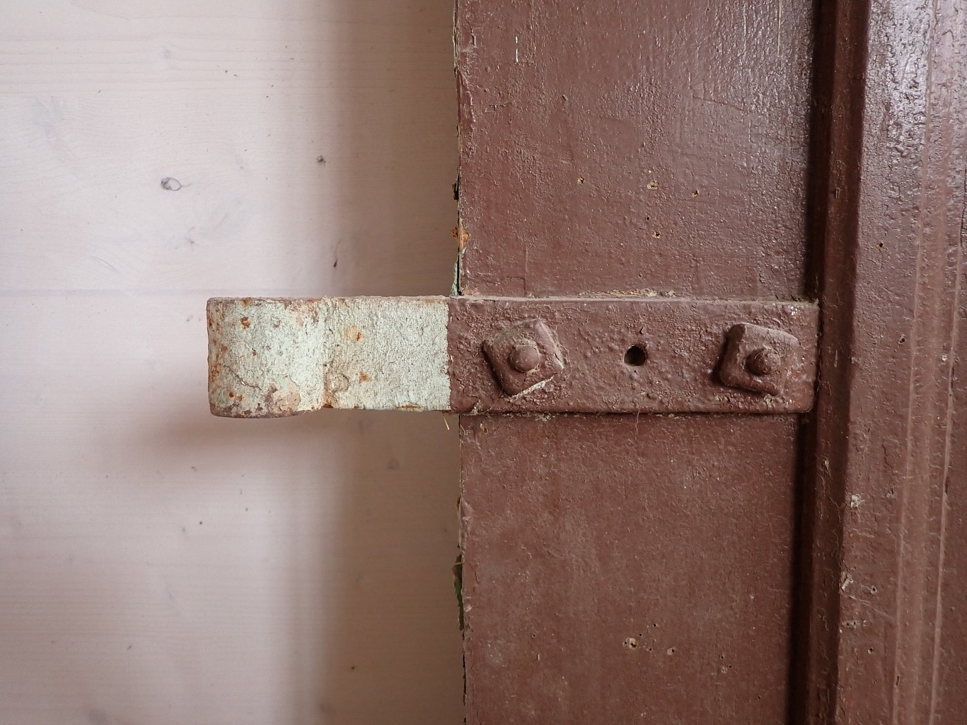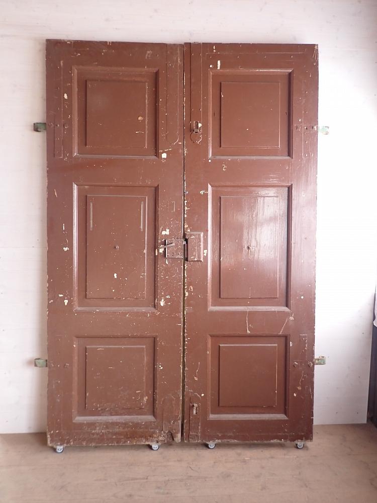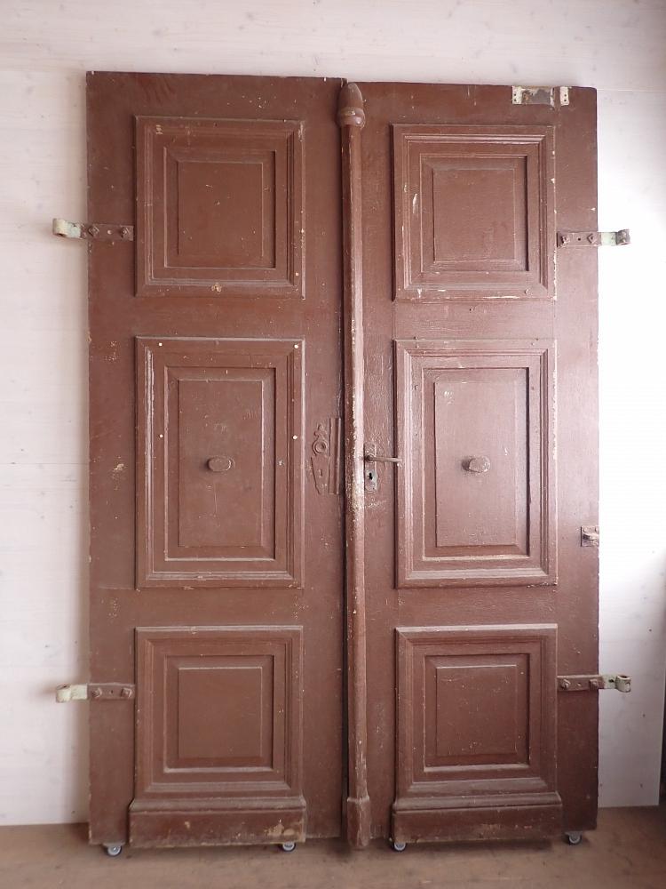 Die zweiflügelige Haustür ist aus Weichholz gefertigt und ist mit schlichten Kassettenfüllungen gestaltet. Sie besitzt Türklinken und Schloss sowie Schubriegel die sich vertikal verschließen lassen.