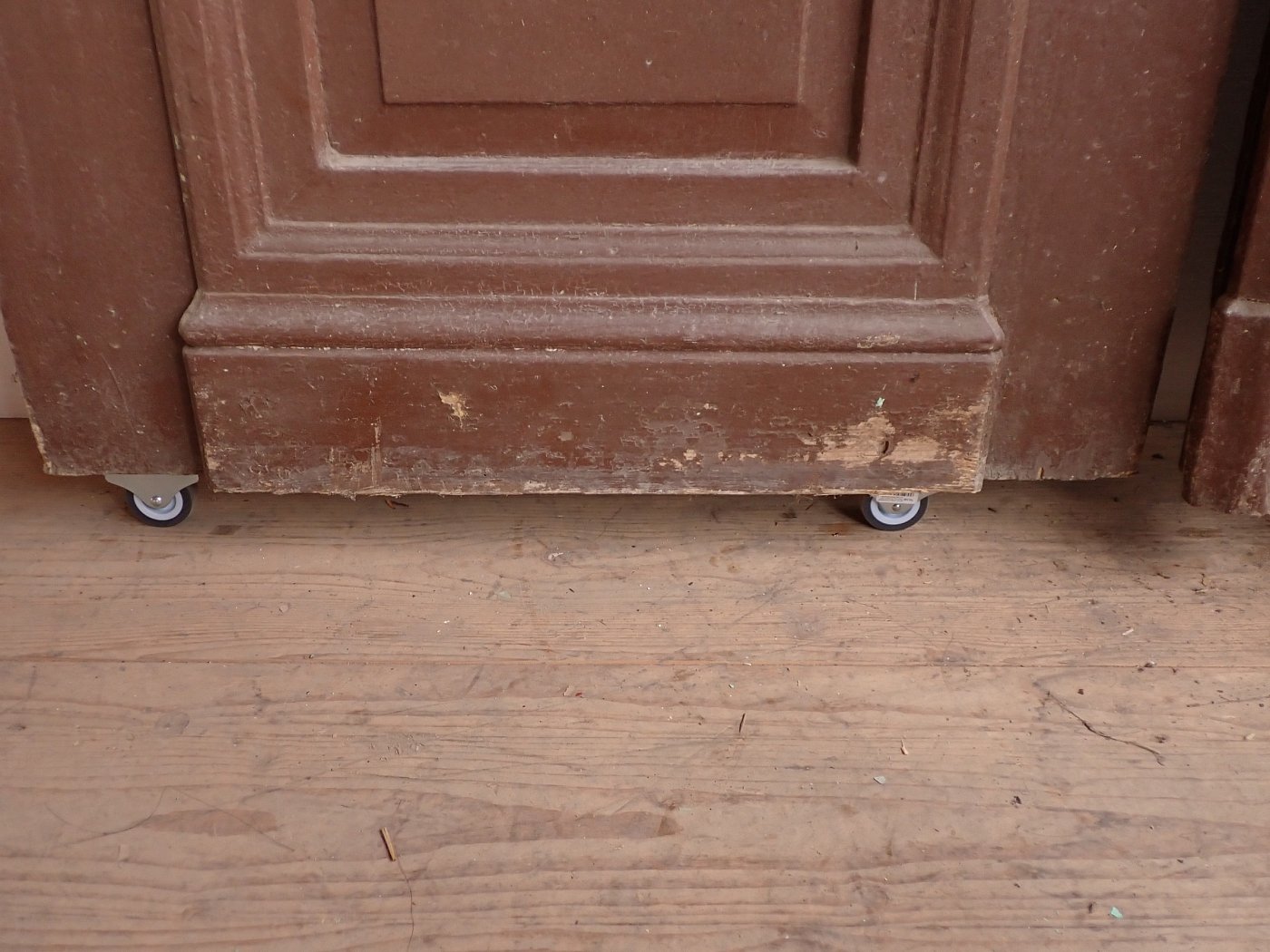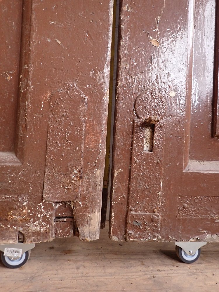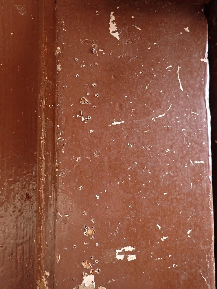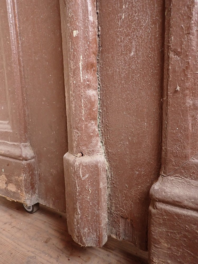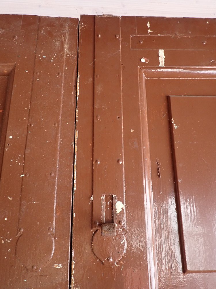 Die Tür ist in einem soliden Zustand. Der abblätternde Lack lässt sich mit ablaugen entfernen, sodass die Tür neu gestaltet werden kann. Es sind Spuren eines Wurmbefalls zu erkennen, welcher sich durch eine thermische Behandlung entfernen lässt.