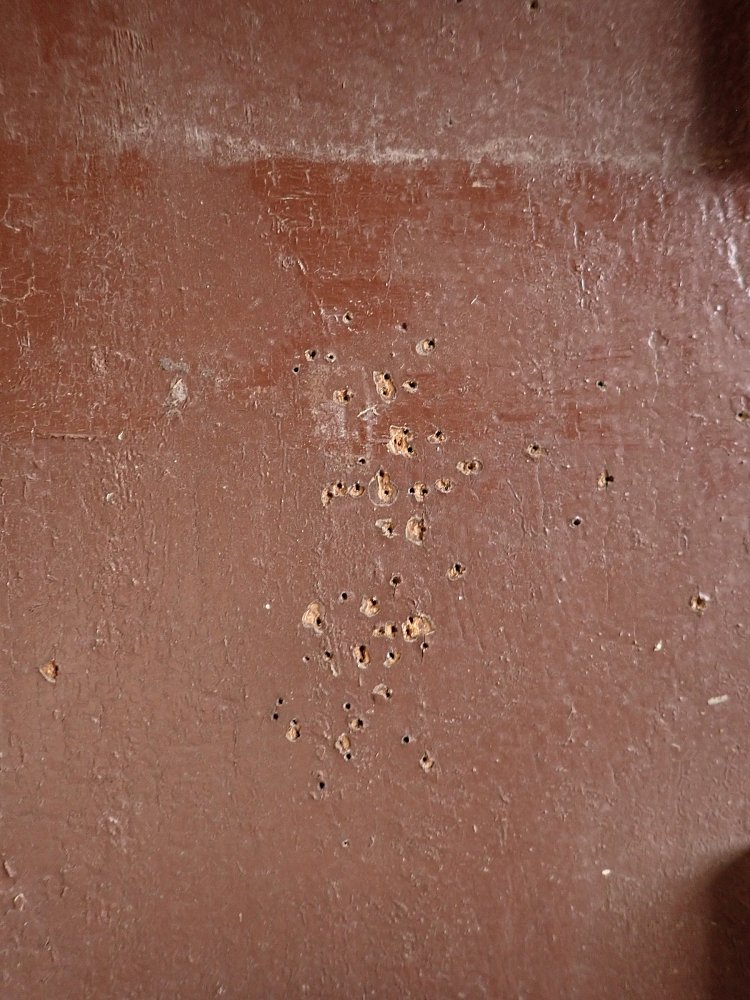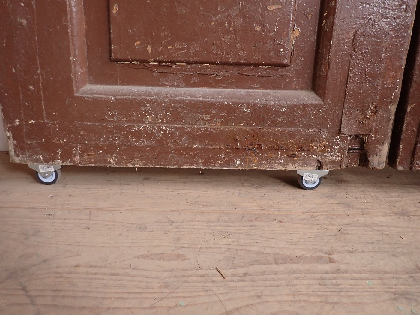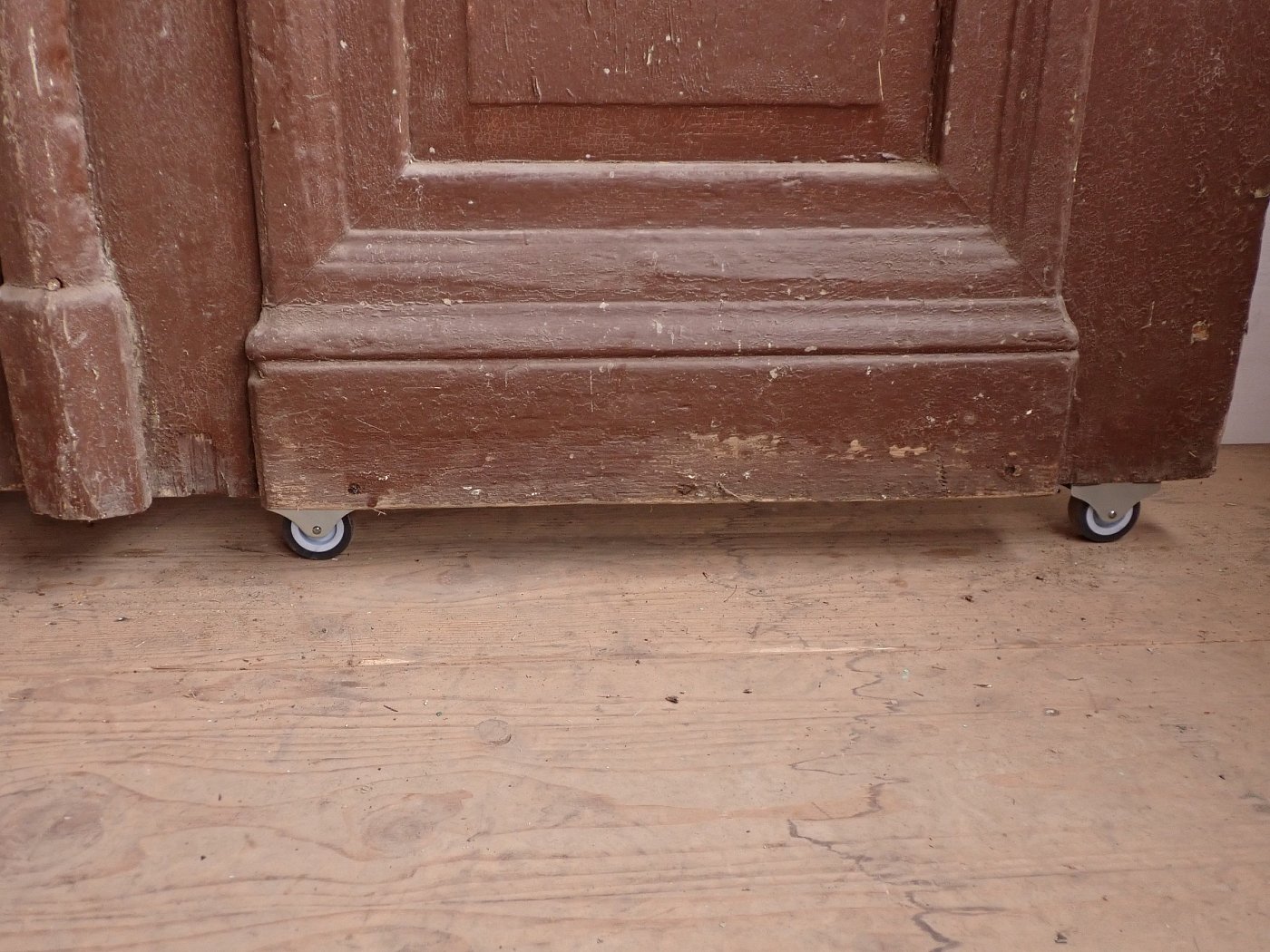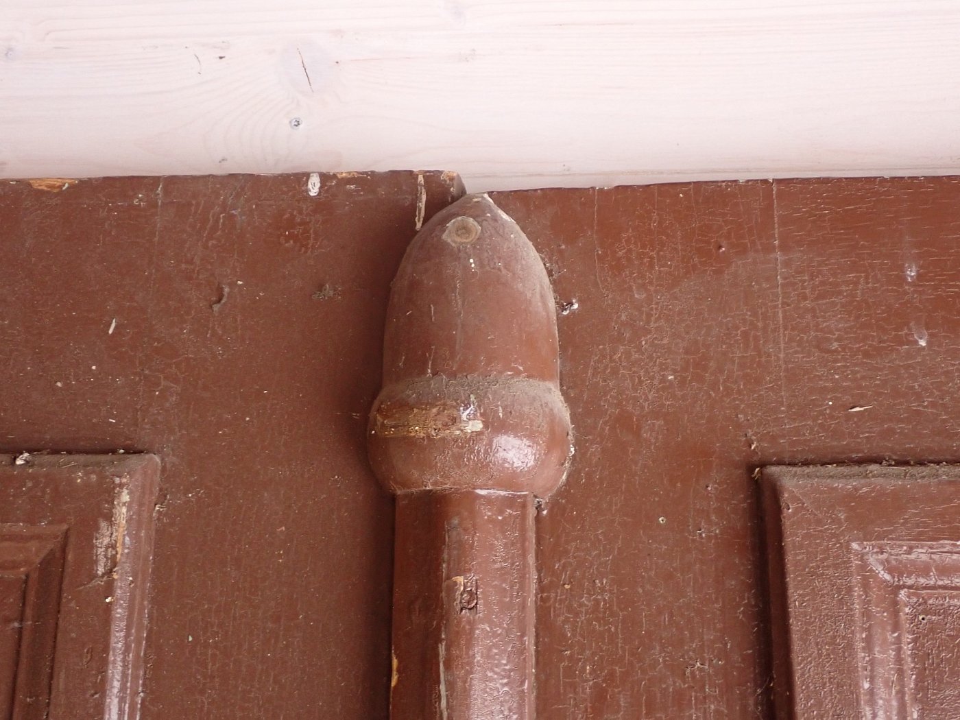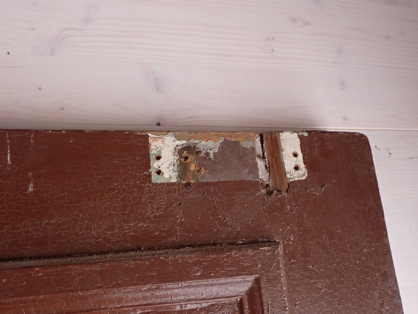 Die Tür ist in einem soliden Zustand. Der abblätternde Lack lässt sich mit ablaugen entfernen, sodass die Tür neu gestaltet werden kann. Es sind Spuren eines Wurmbefalls zu erkennen, welcher sich durch eine thermische Behandlung entfernen lässt.