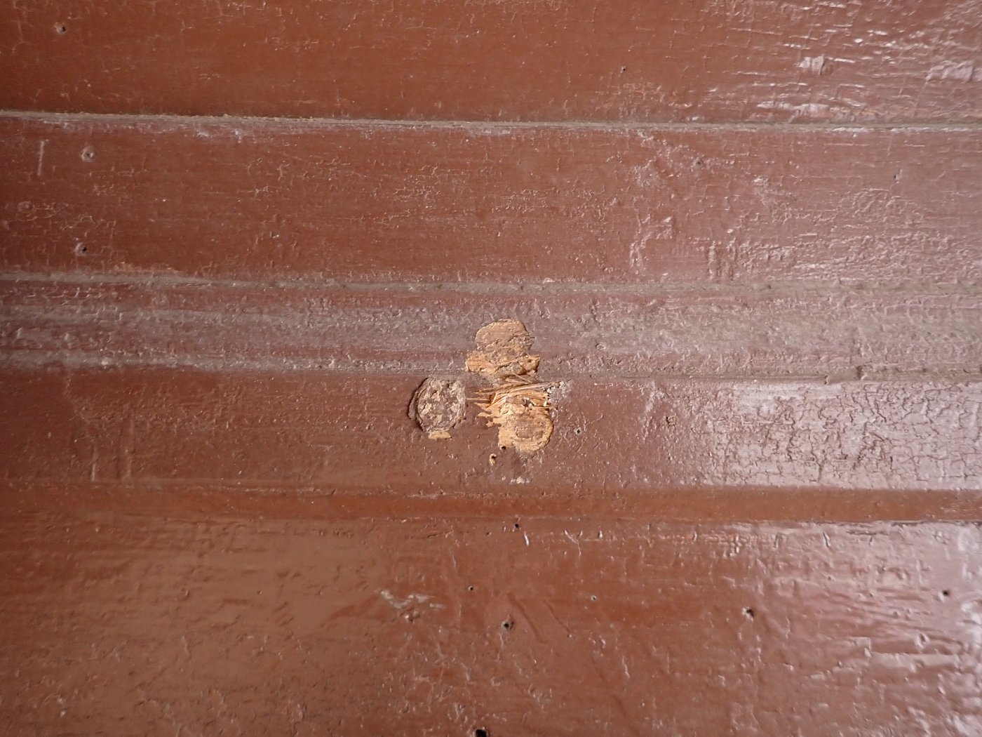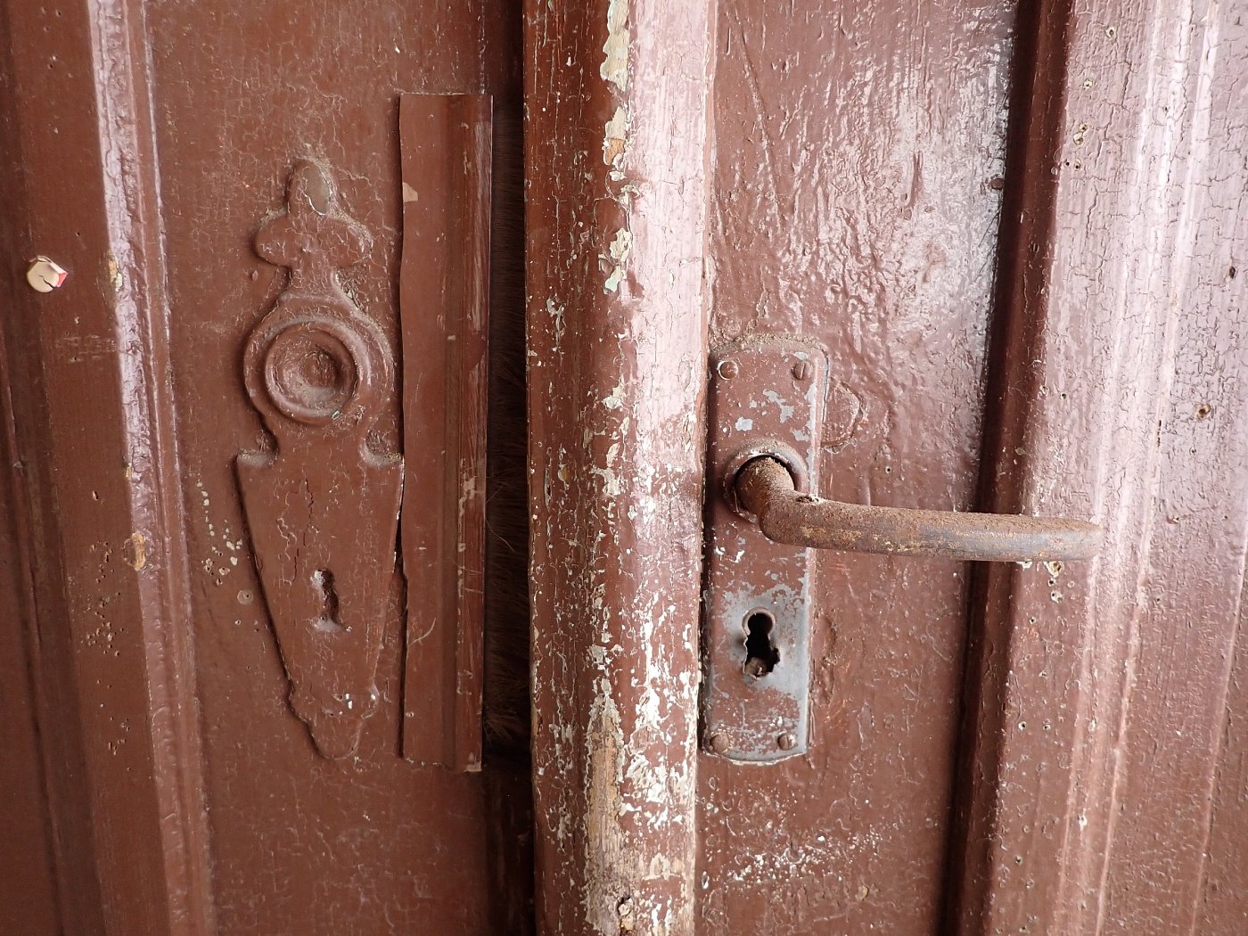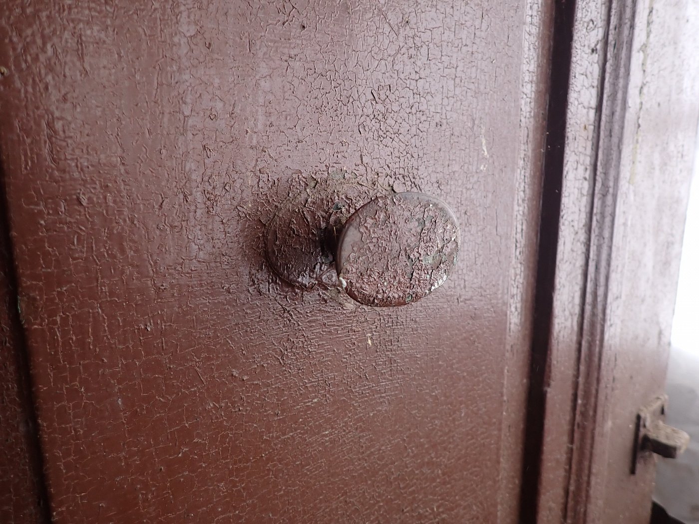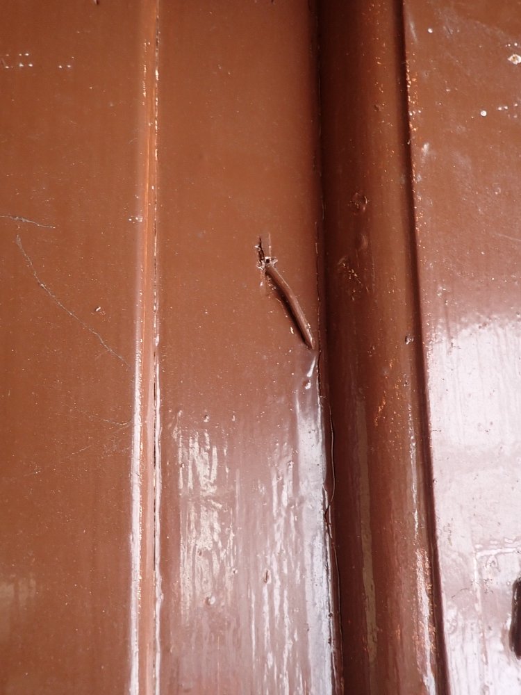 Die Tür ist in einem soliden Zustand. Der abblätternde Lack lässt sich mit ablaugen entfernen, sodass die Tür neu gestaltet werden kann. Es sind Spuren eines Wurmbefalls zu erkennen, welcher sich durch eine thermische Behandlung entfernen lässt.