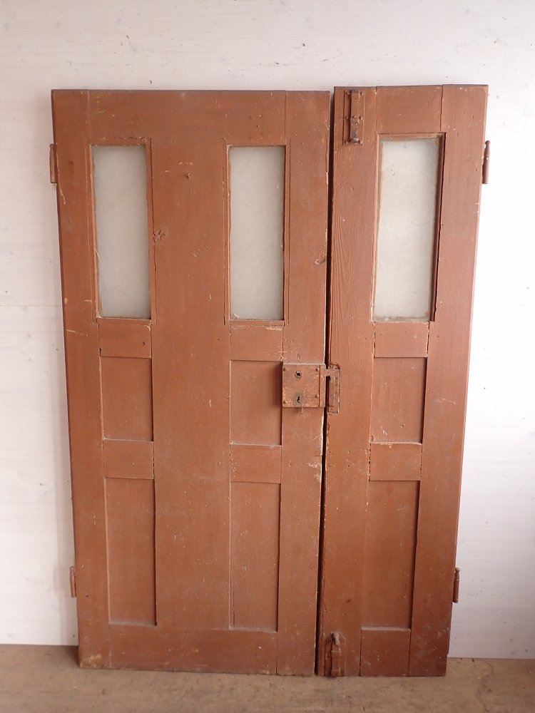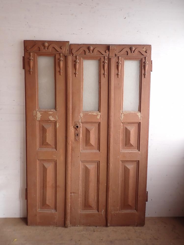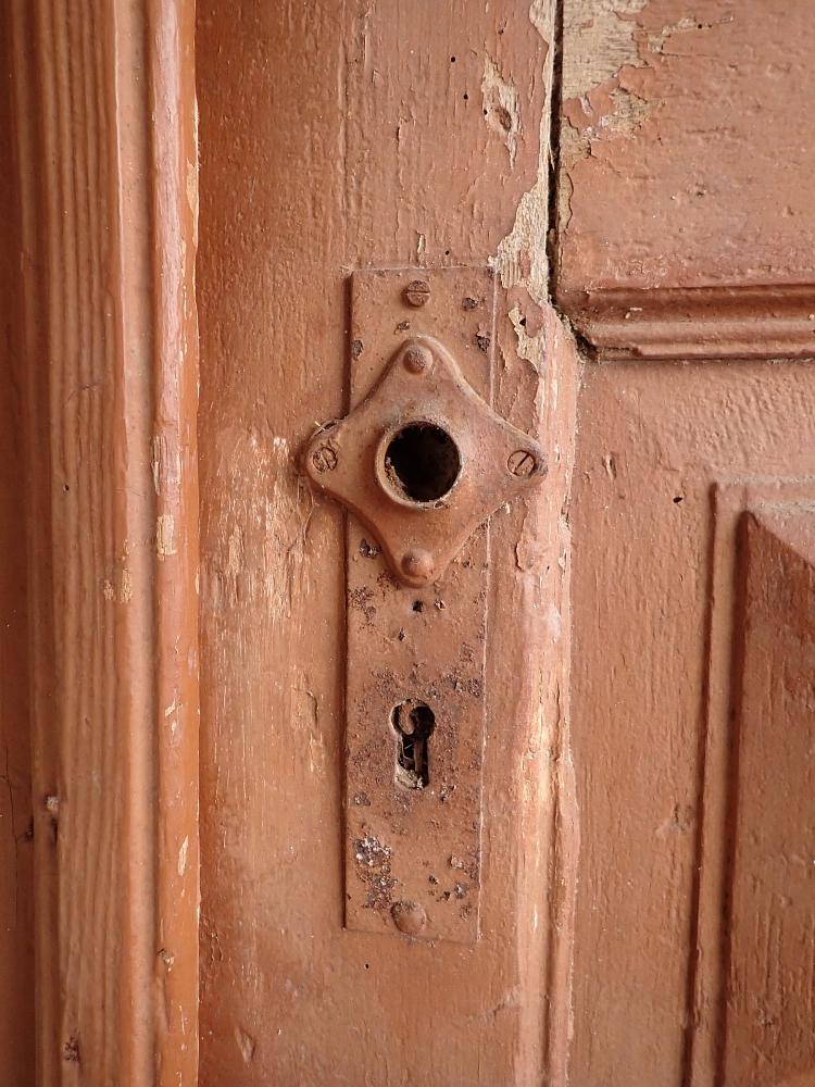Die 1,5 flügelige Haustür ist aus Weichholz gefertigt und ist mit neun Füllungen gestaltet. In drei Spalten befinden sich jeweils die Glasfüllungen im oberen Bereich mit klarem Strukturglas. In der Mitte und im unteren Bereich sind Holzfüllungen mit herausschauenden Elementen zu finden. Die Tür besitzt dekorative Schnitzereien und ist mit Kastenschloss und Riegel zum Verschließen ausgestattet. Die Klinken fehlen leider und müssten ersetzt werden, aber da lässt sich bestimmt etwas Passendes in unserem Türzubehör finden.