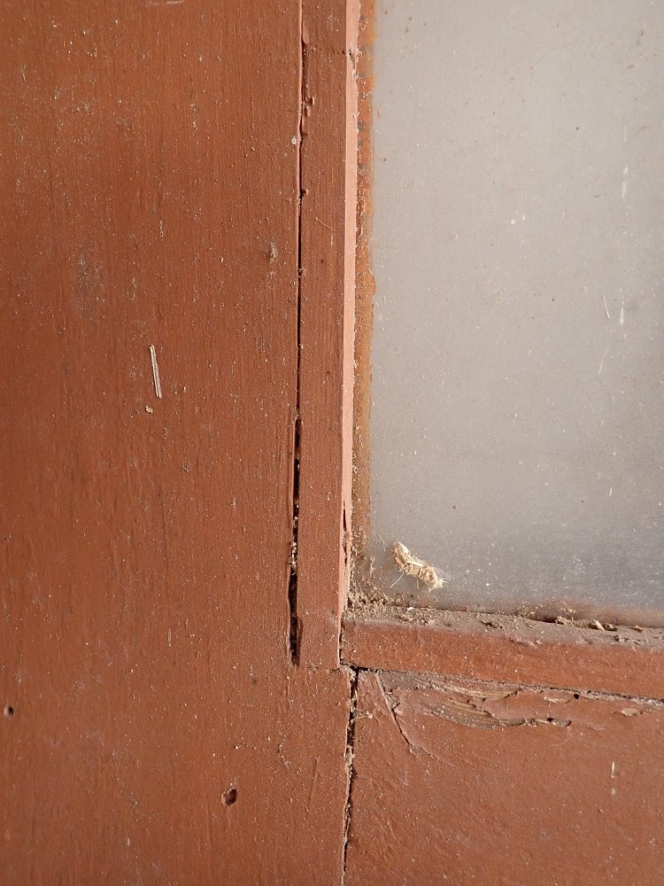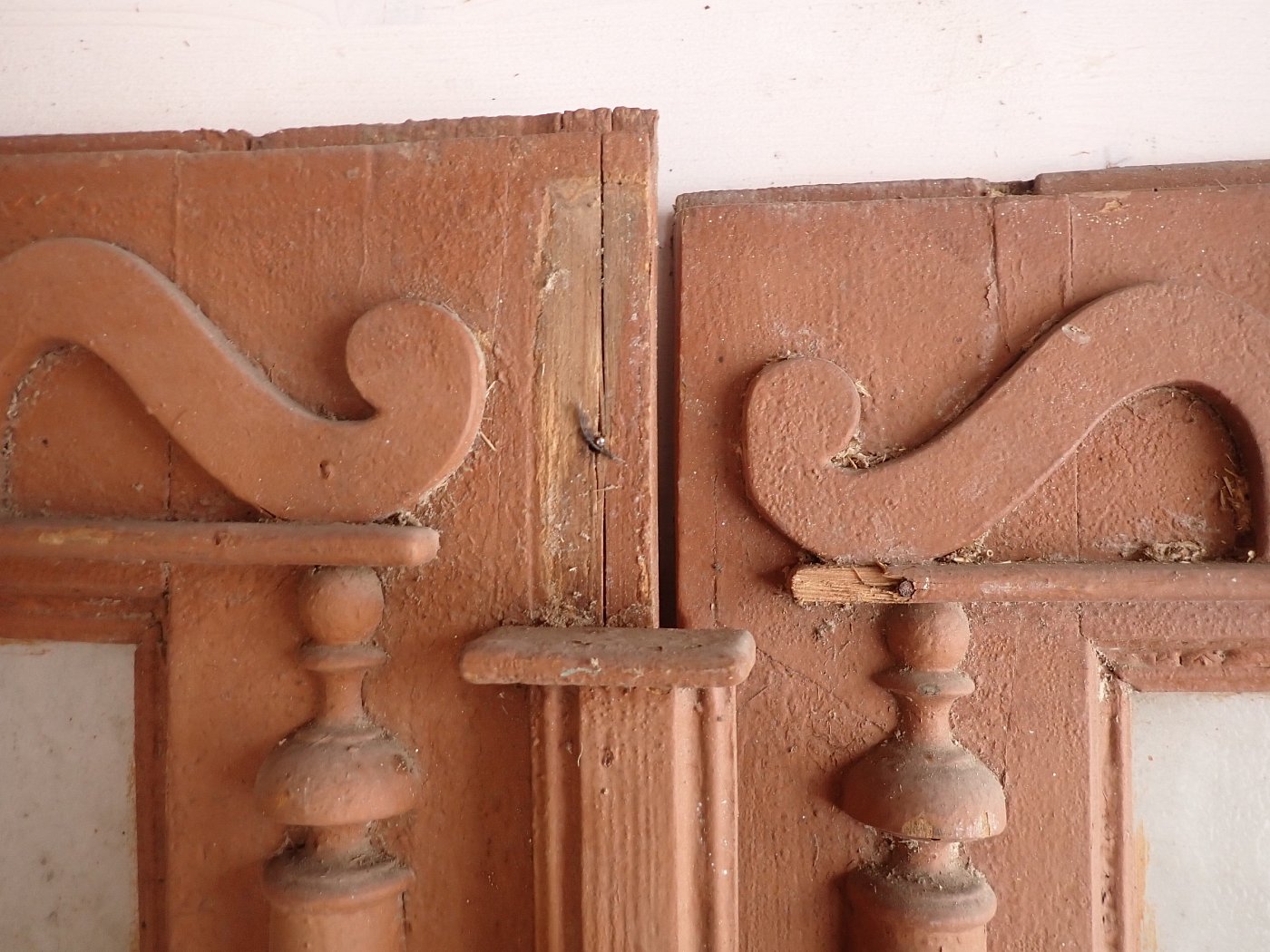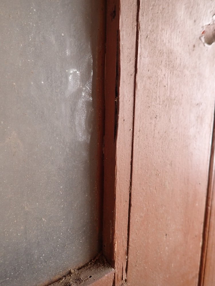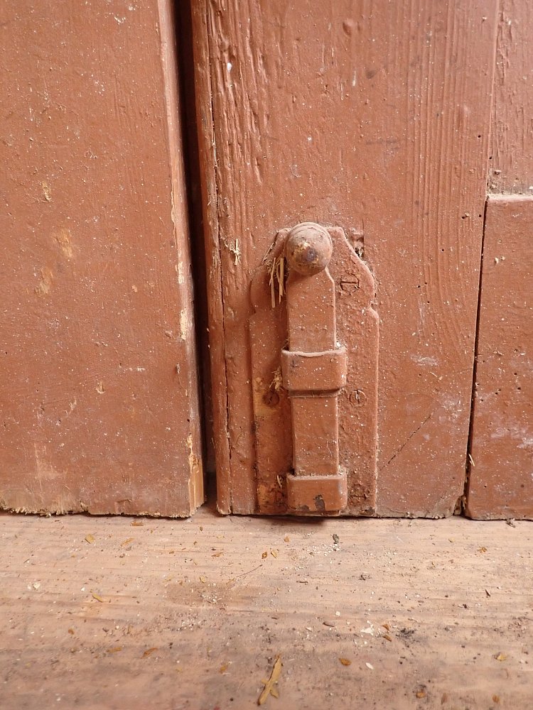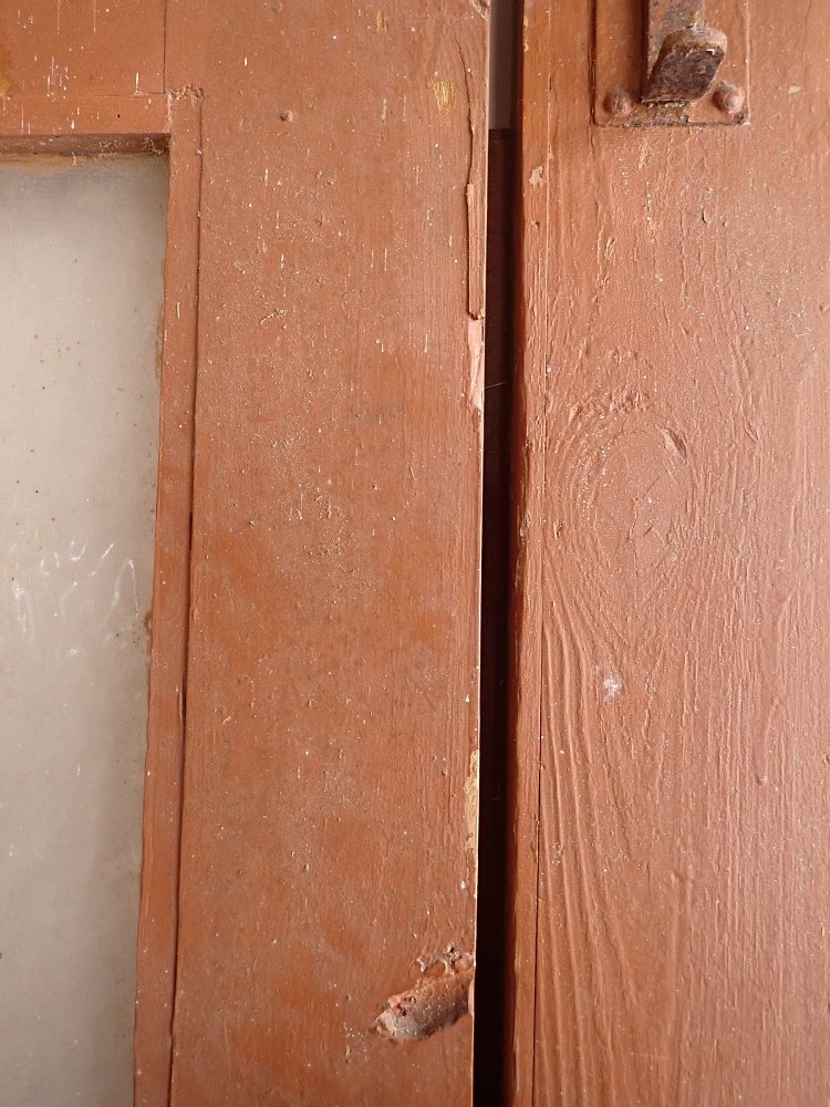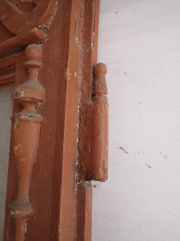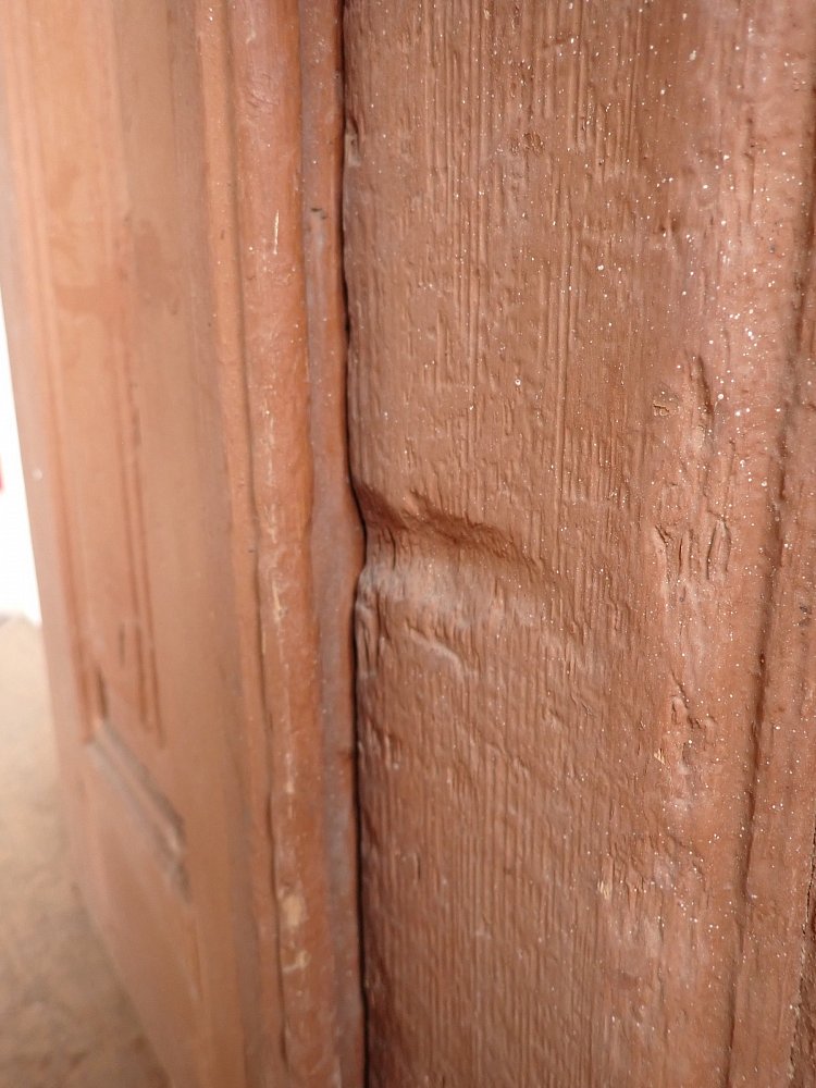 Die Tür weist altersbedingte Gebrauchsspuren auf. Macken in der Oberfläche, kleine fehlende Stückchen in den Schnitzereien und abblättender Lack. Außerdem sind Spuren eines Wurmbefalls erkennbar.