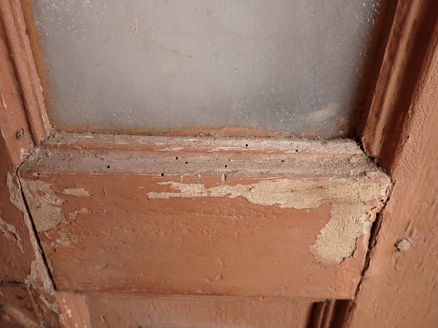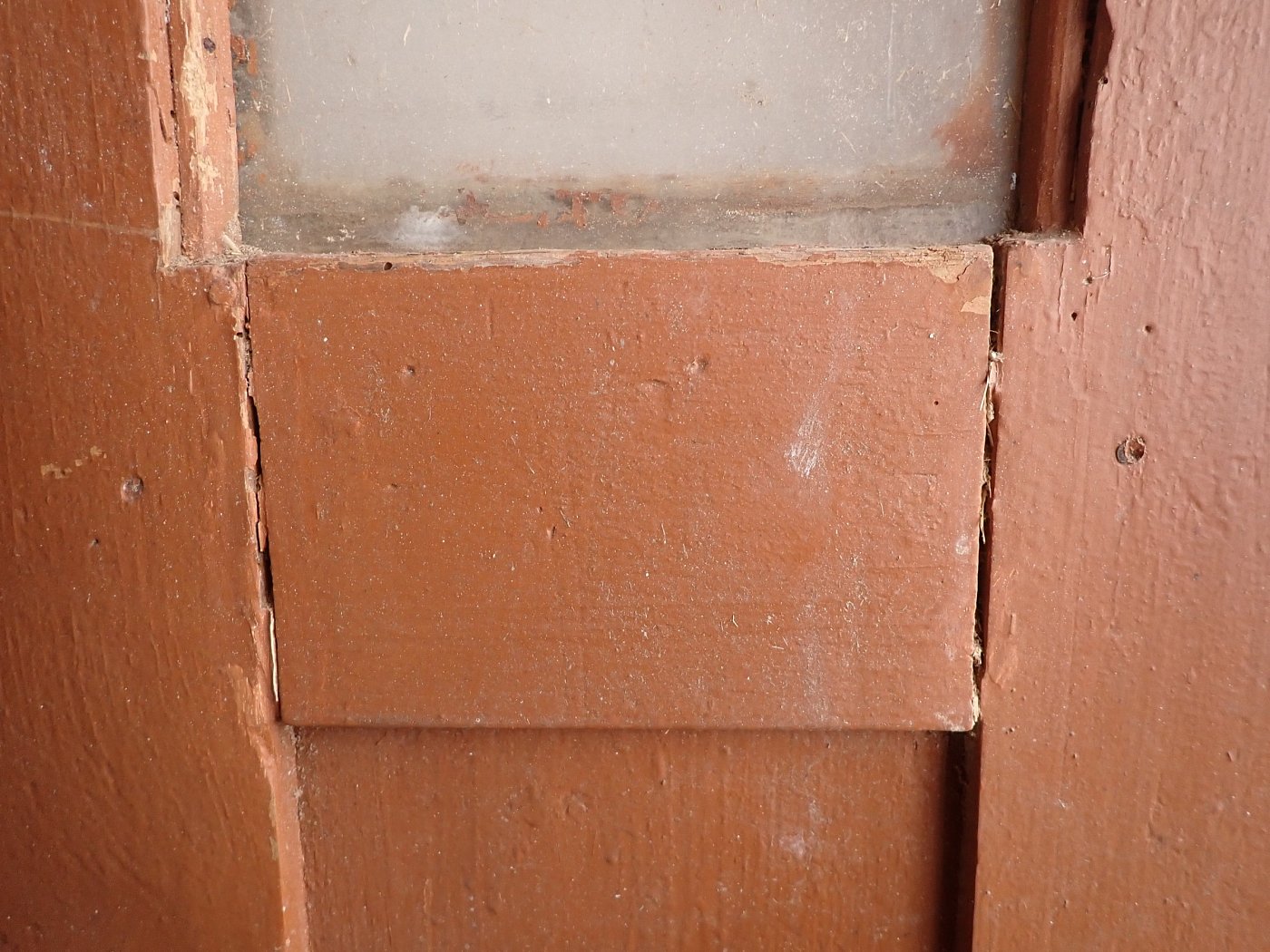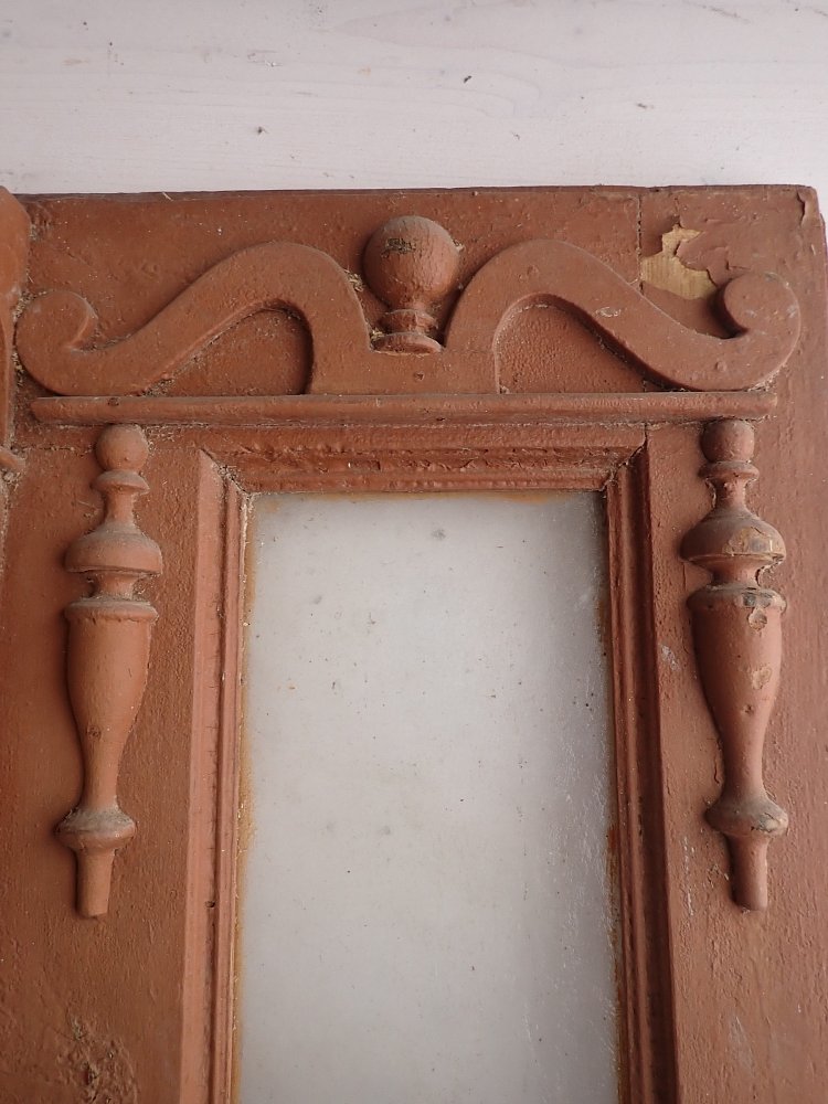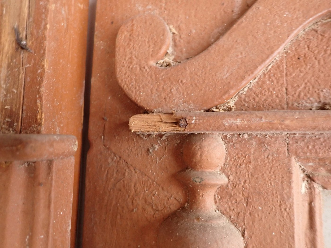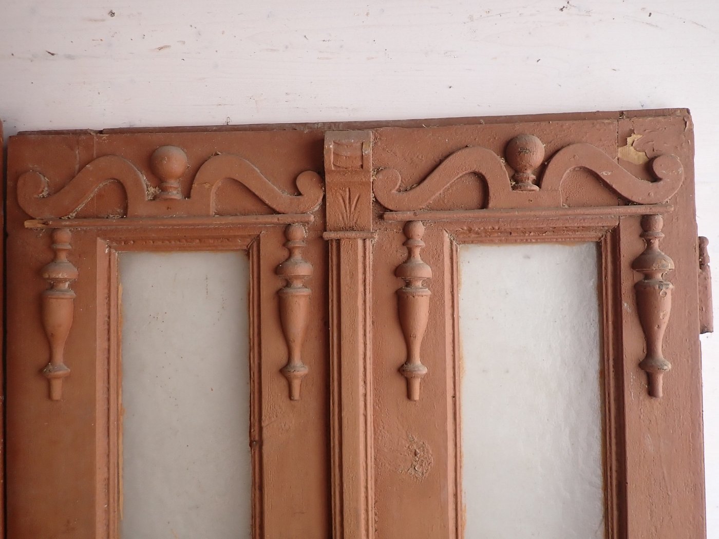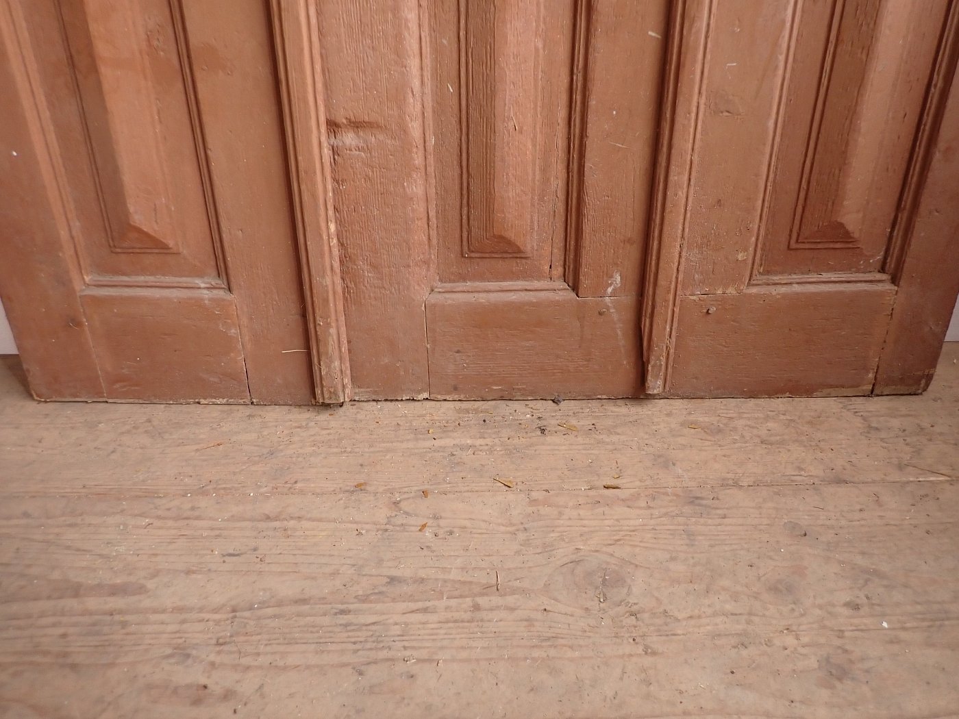Die Tür weist altersbedingte Gebrauchsspuren auf. Macken in der Oberfläche, kleine fehlende Stückchen in den Schnitzereien und abblättender Lack. Außerdem sind Spuren eines Wurmbefalls erkennbar.