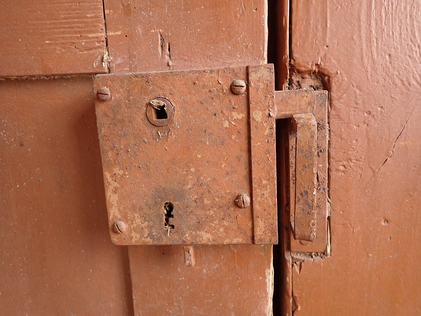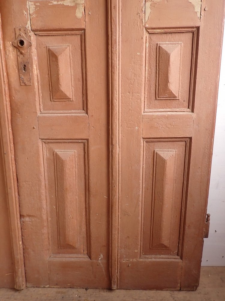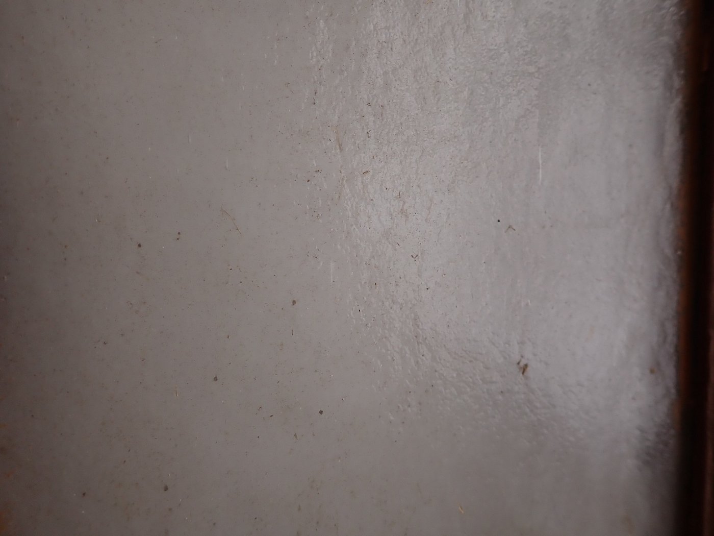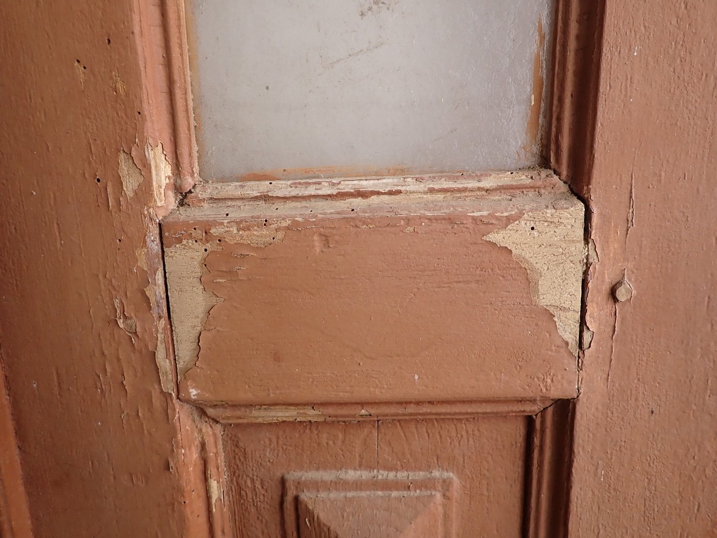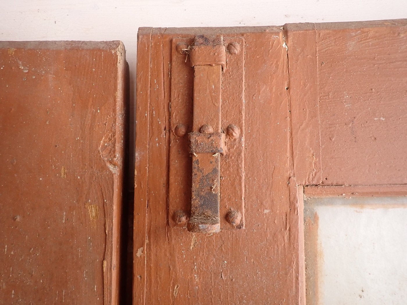 Die Tür weist altersbedingte Gebrauchsspuren auf. Macken in der Oberfläche, kleine fehlende Stückchen in den Schnitzereien und abblättender Lack. Außerdem sind Spuren eines Wurmbefalls erkennbar.