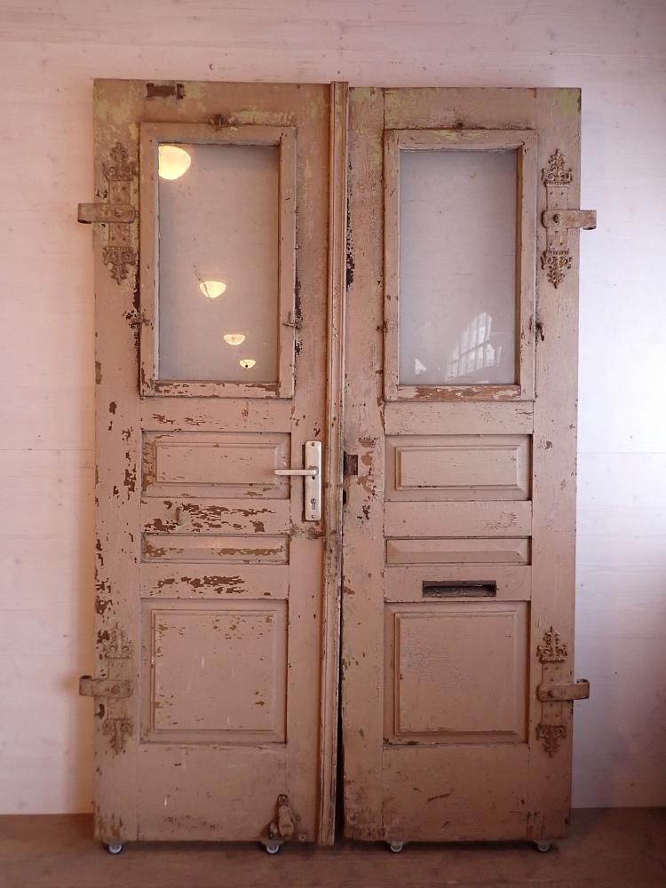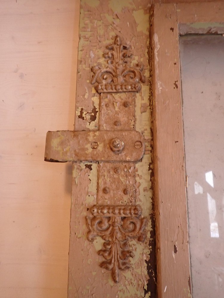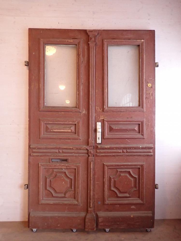 Die zweiflügelige Haustür ist aus Weichholz gefertigt und verfügt über zwei große Glasfensterfelder im oberen Bereich sowie profilierte Kassettenfüllungen im unteren Bereich. Sie besitzt Türklinke und Griff sowie einen Briefkastenschlitz und zwei Fenster, die mit Fensterriegeln verschließbar sind, allerdings fehlen an einem der Fenster zwei der Riegel. Die Türbänder sind verzierte handgeschmiedene Eisenbänder.