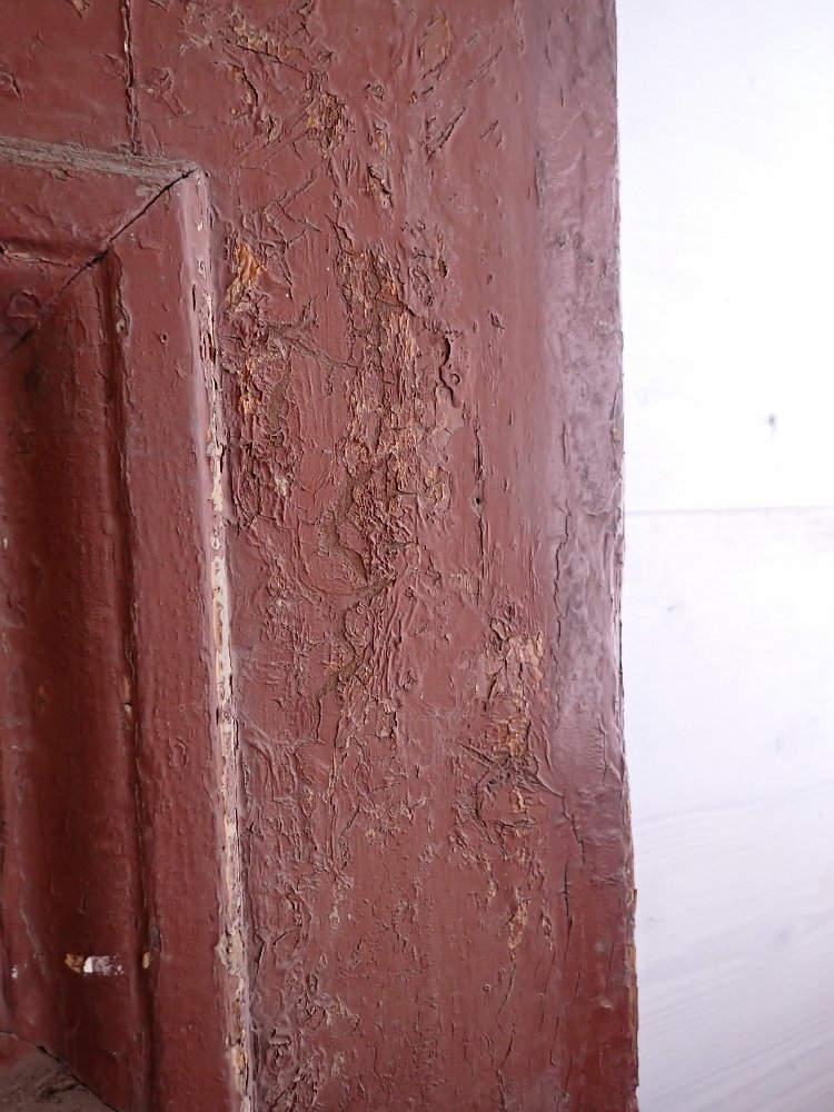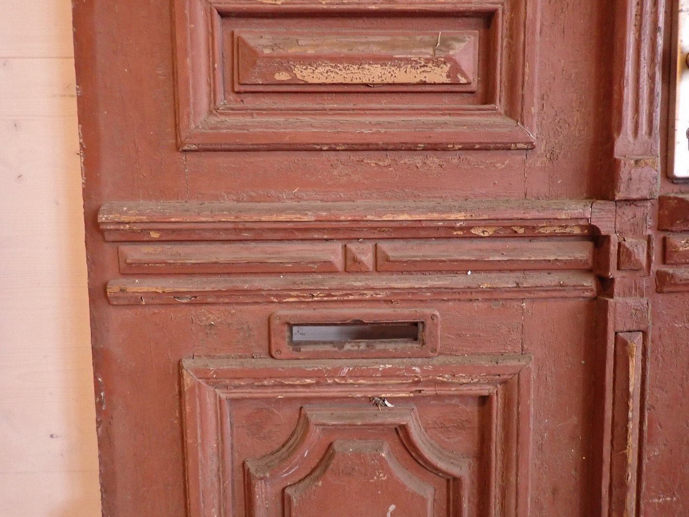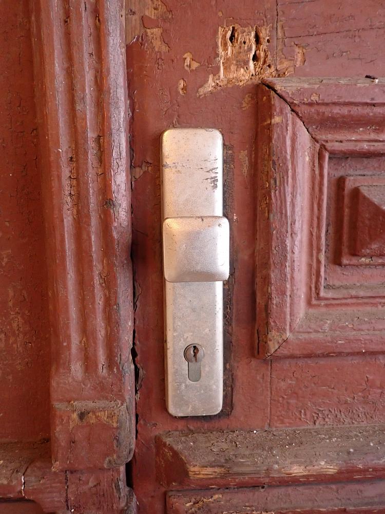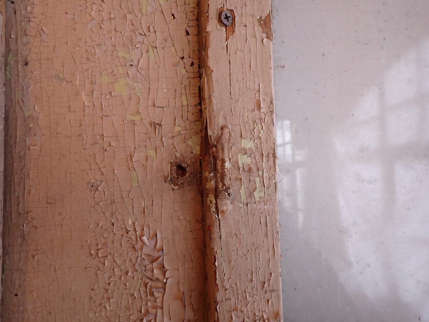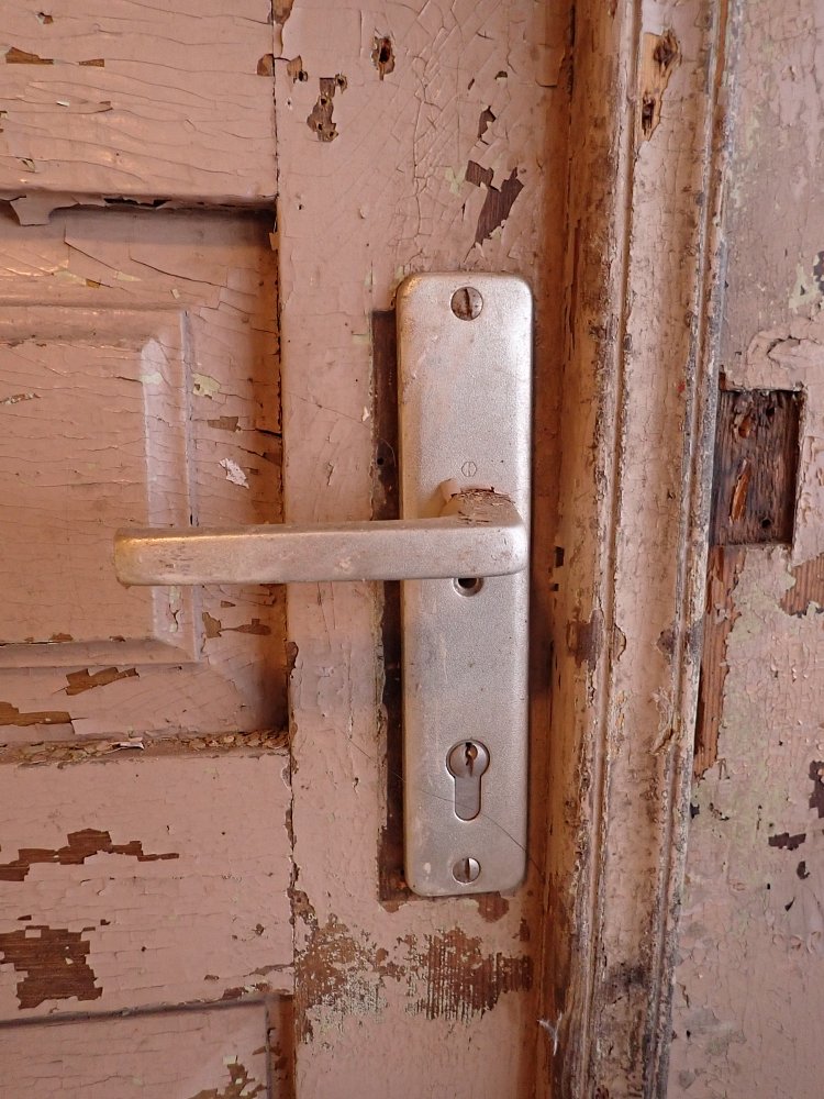 Die Tür befindet sich in einem soliden Zustand. Sie weist Gebrauchsspuren wie abblätternder Lack sowie Macken in der Obefläche des Holzes auf. Außerdem sind die Fugen des Fensters spröde und ist an manchen Stellen bereits weggefallen.