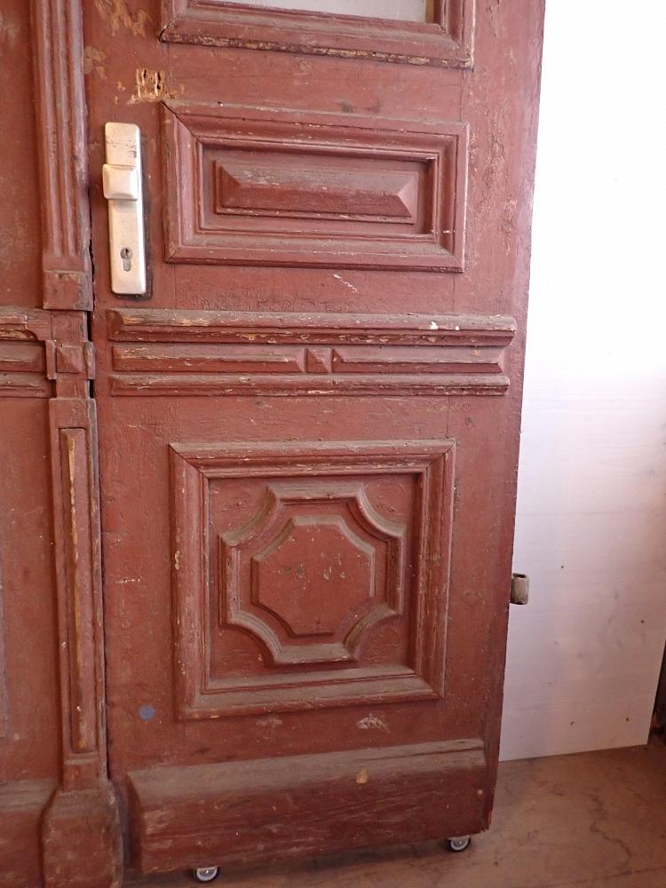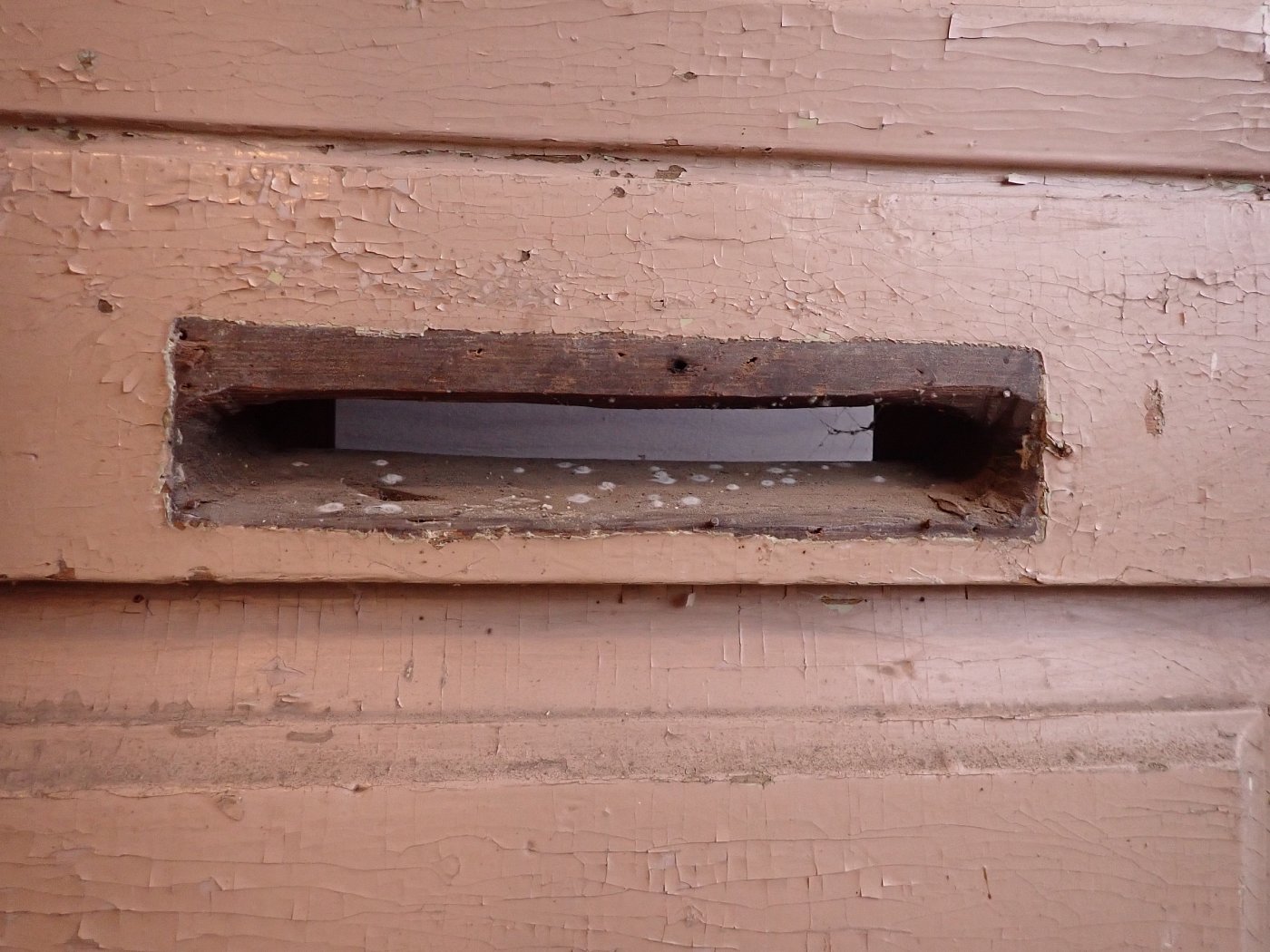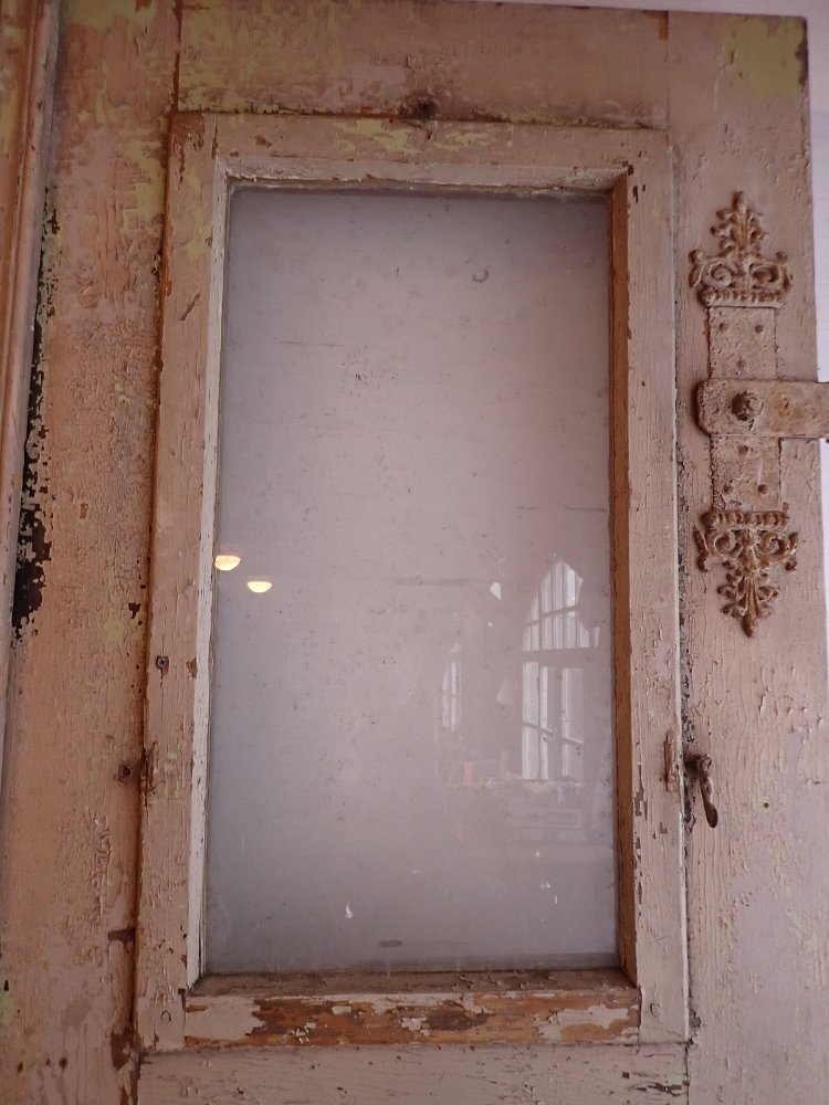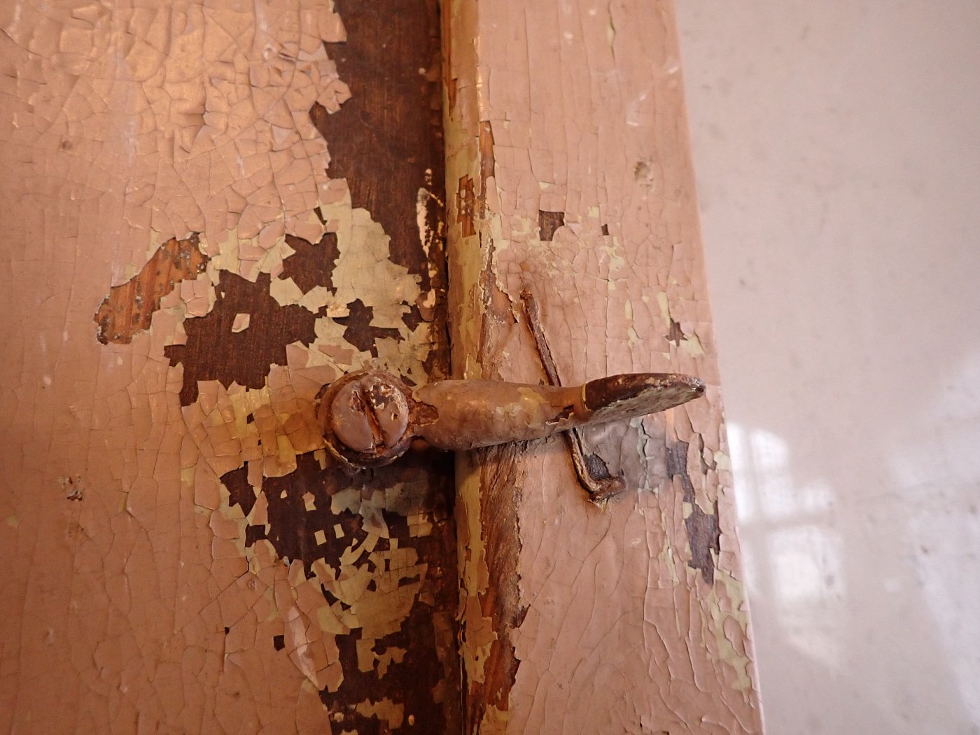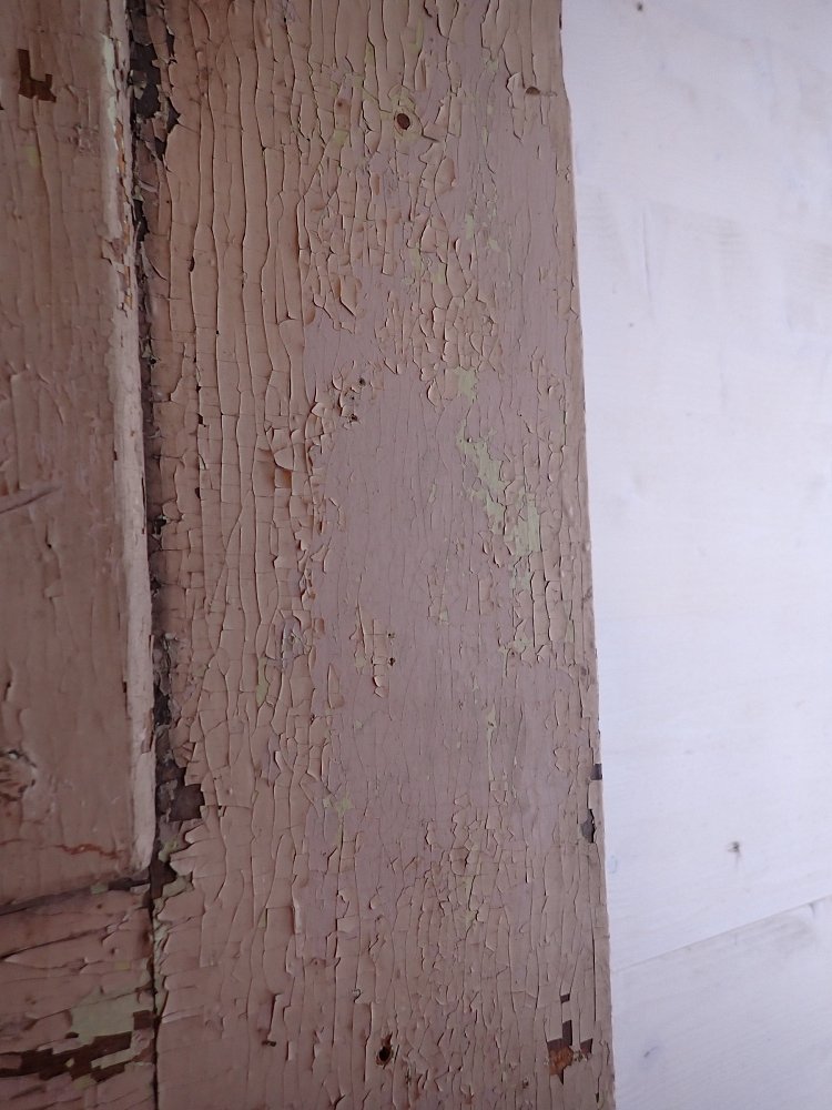 Die Tür befindet sich in einem soliden Zustand. Sie weist Gebrauchsspuren wie abblätternder Lack sowie Macken in der Obefläche des Holzes auf. Außerdem sind die Fugen des Fensters spröde und ist an manchen Stellen bereits weggefallen.