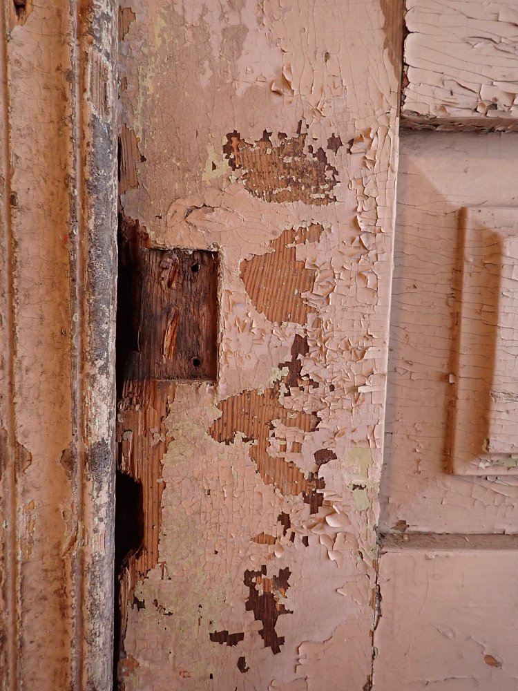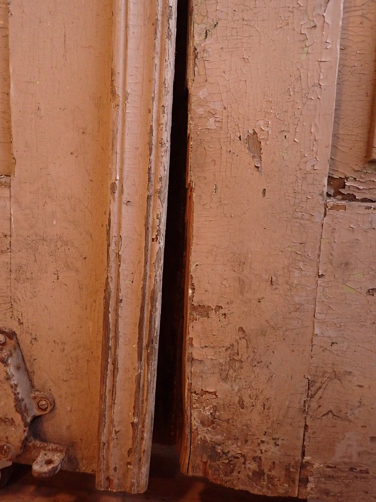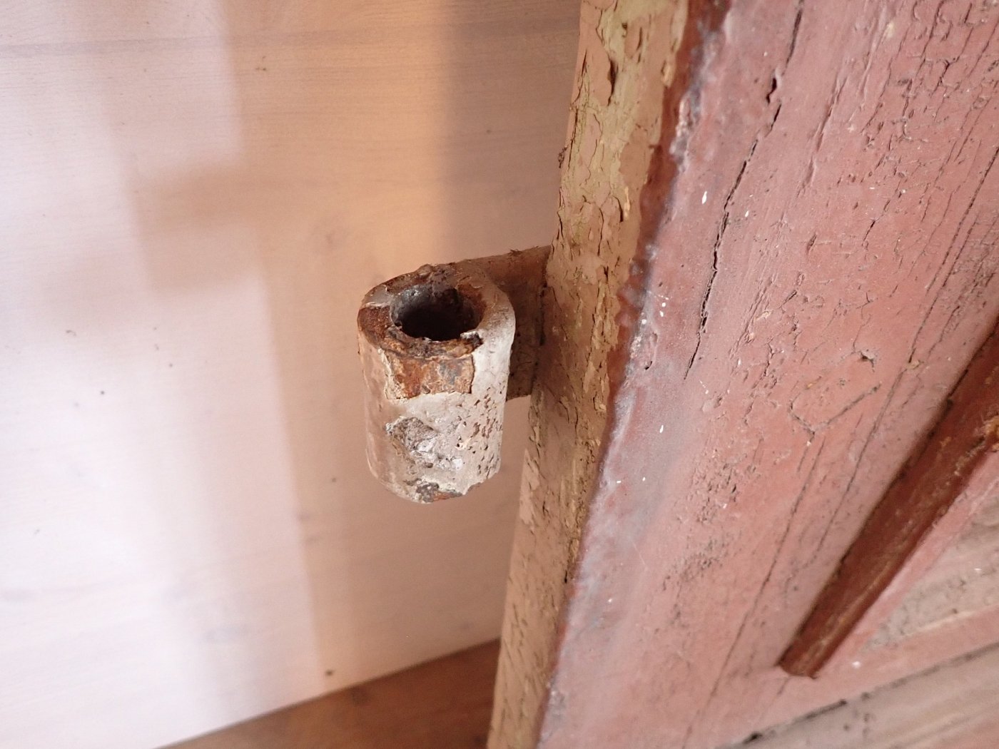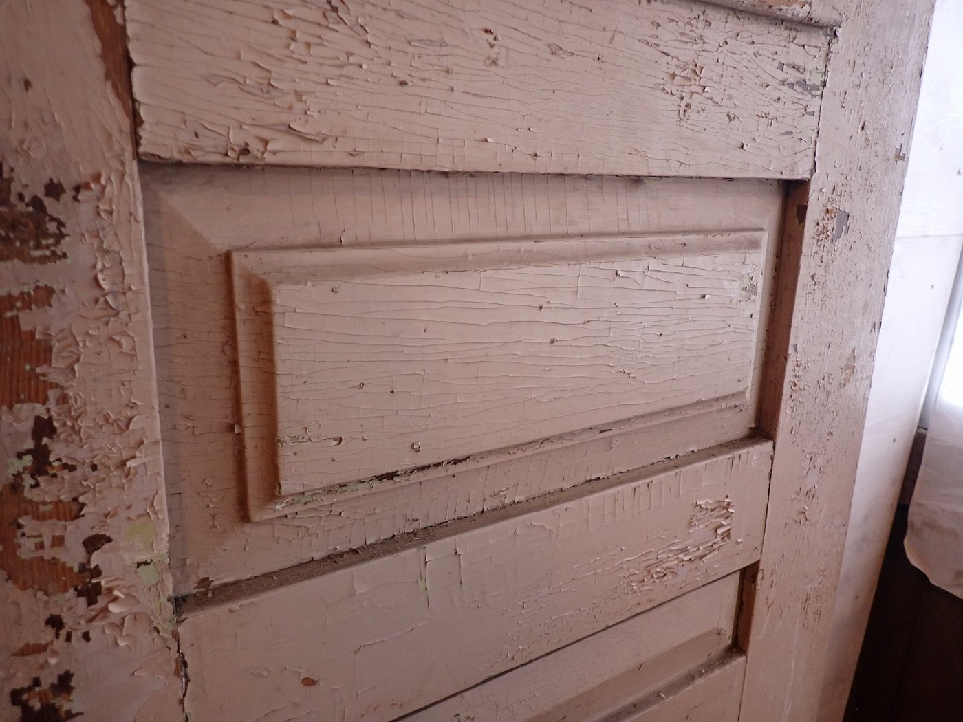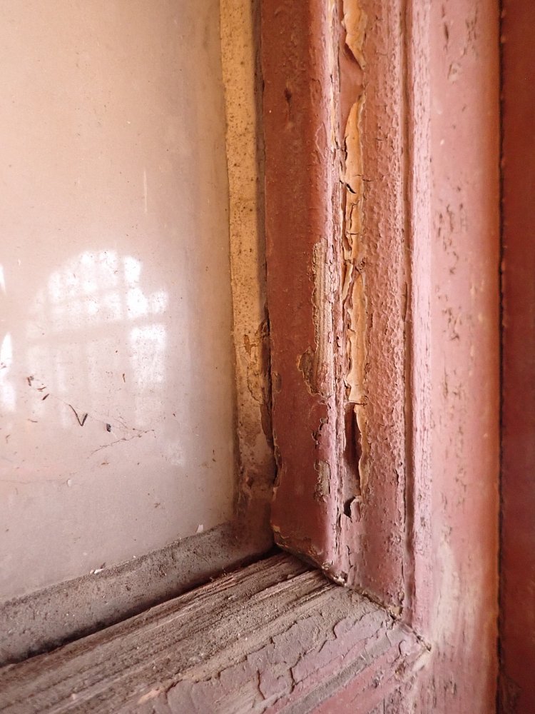 Die Tür befindet sich in einem soliden Zustand. Sie weist Gebrauchsspuren wie abblätternder Lack sowie Macken in der Obefläche des Holzes auf. Außerdem sind die Fugen des Fensters spröde und ist an manchen Stellen bereits weggefallen.