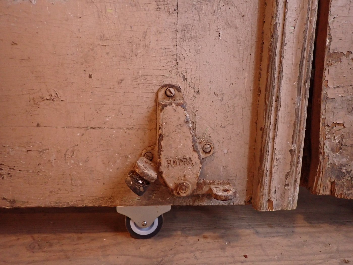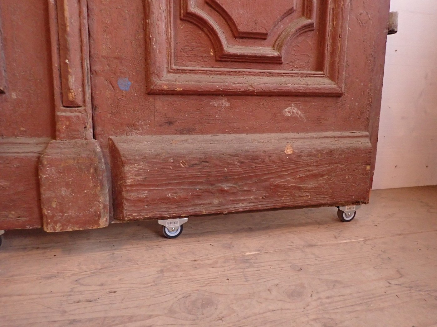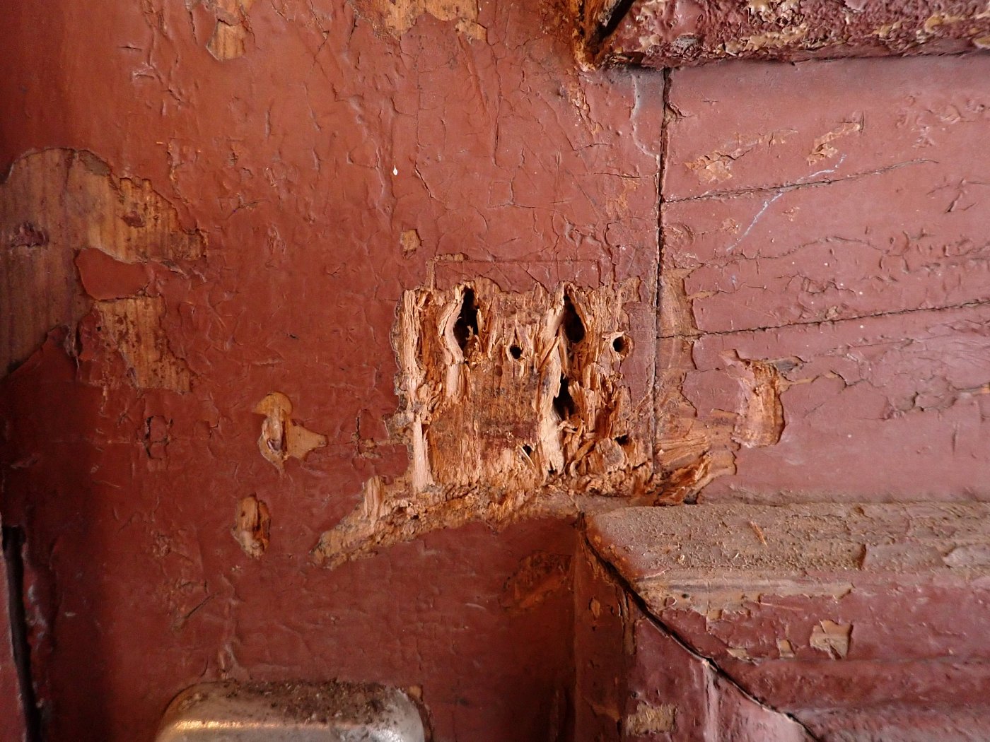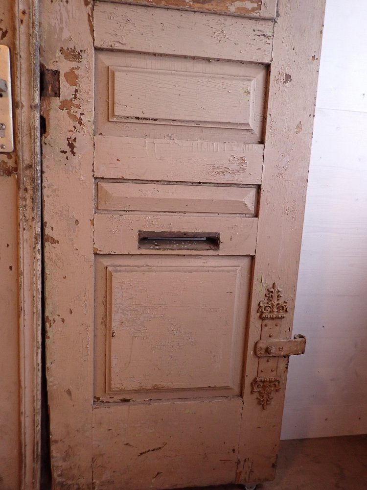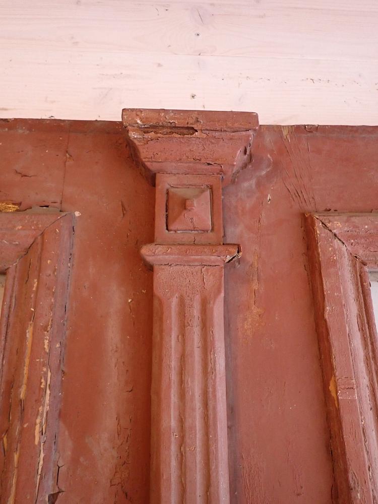 Die Tür befindet sich in einem soliden Zustand. Sie weist Gebrauchsspuren wie abblätternder Lack sowie Macken in der Obefläche des Holzes auf. Außerdem sind die Fugen des Fensters spröde und ist an manchen Stellen bereits weggefallen.