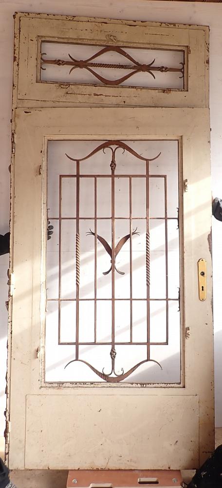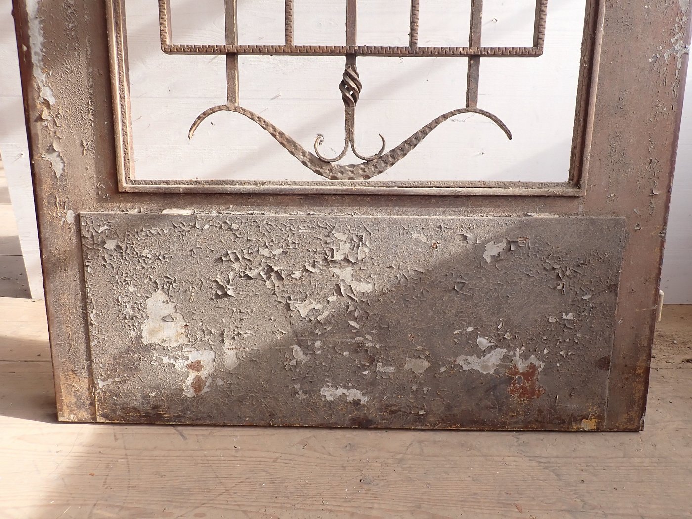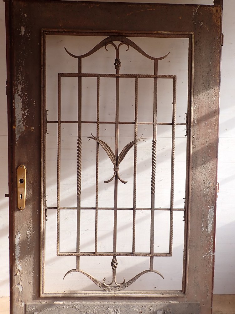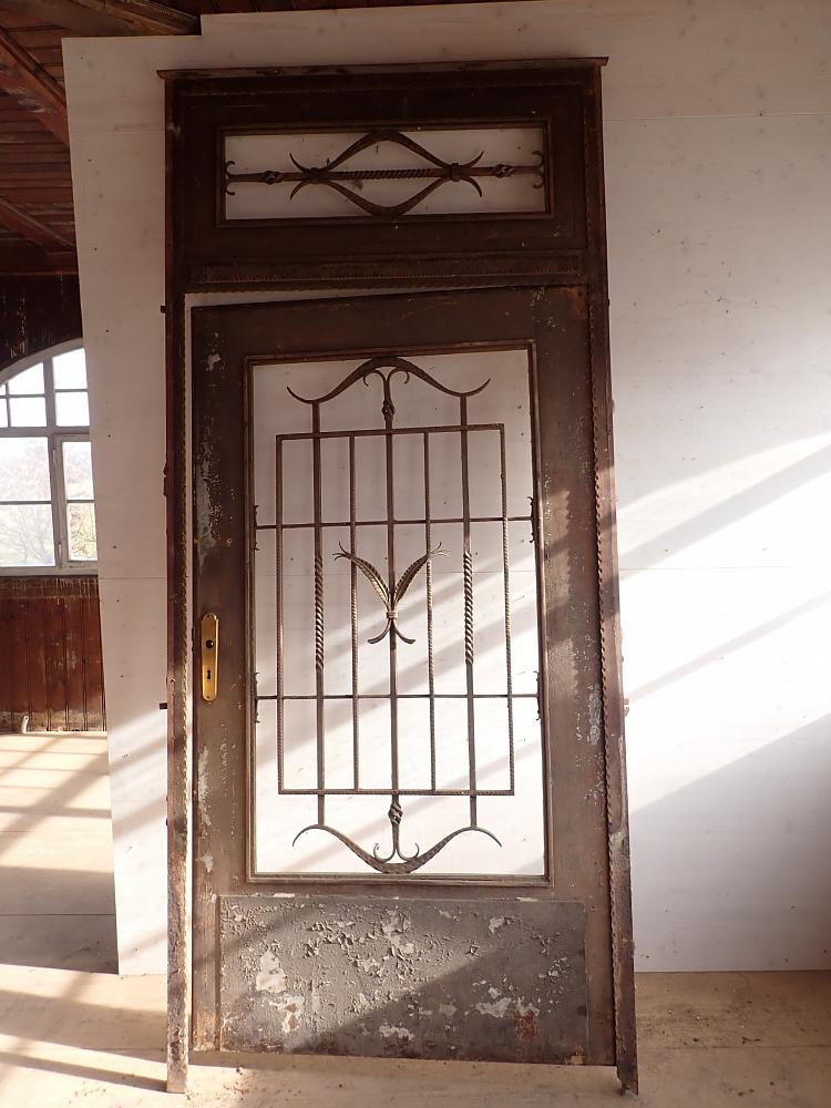 Die Tür aus Schmiedeeisen besitzt einen dekorativen Gittereinsatz mit gedrehten Stäben und floralen Motiven in der Lichtöffnung. Die Öffnung besitzt einen Rahmen, der sich einhängen lässt, in dem vermutlich eine Glasscheibe eingesetzt war. Dieser Rahmen ist vorhanden, aber ohne Glas.