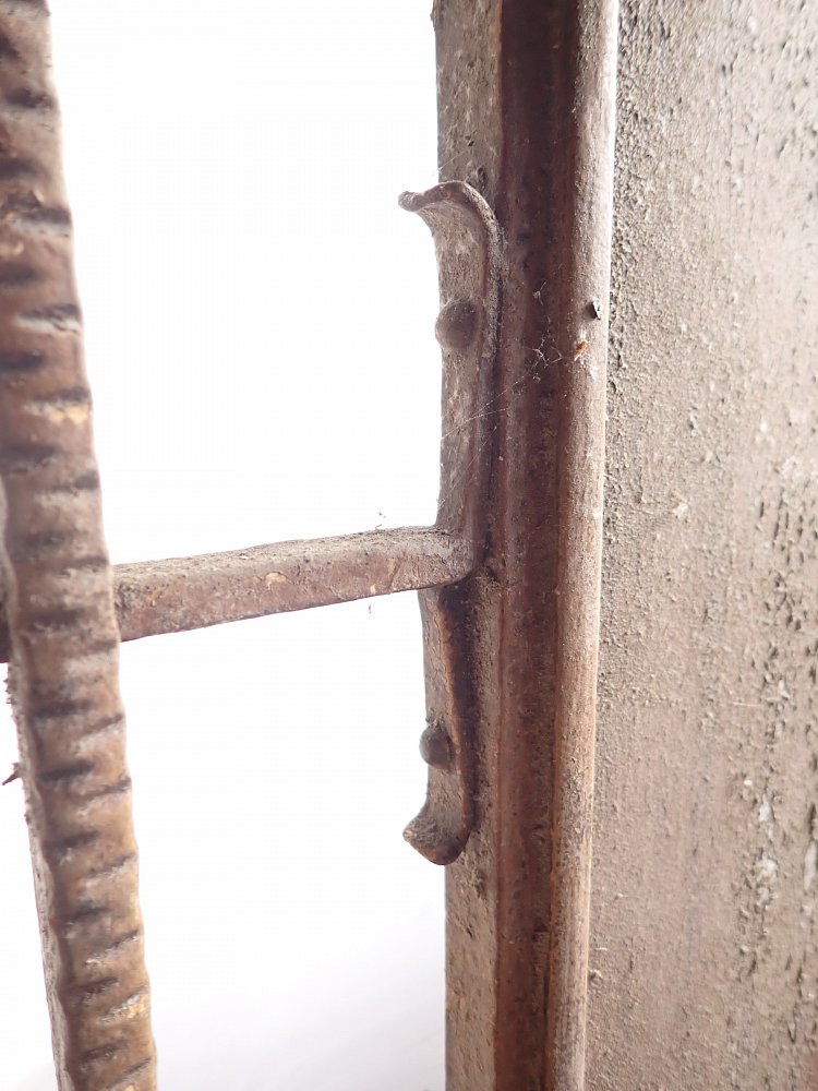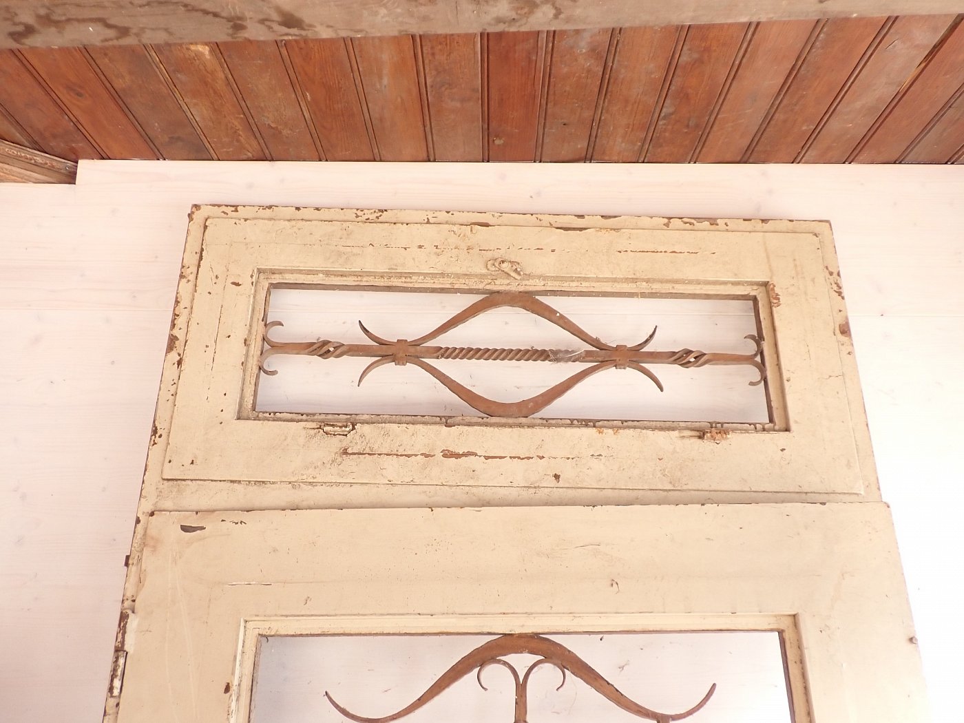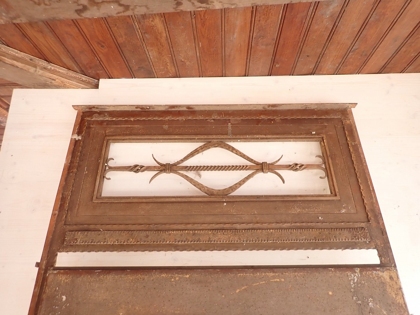 Die Tür aus Schmiedeeisen besitzt einen dekorativen Gittereinsatz mit gedrehten Stäben und floralen Motiven in der Lichtöffnung. Die Öffnung besitzt einen Rahmen, der sich einhängen lässt, in dem vermutlich eine Glasscheibe eingesetzt war. Dieser Rahmen ist vorhanden, aber ohne Glas.