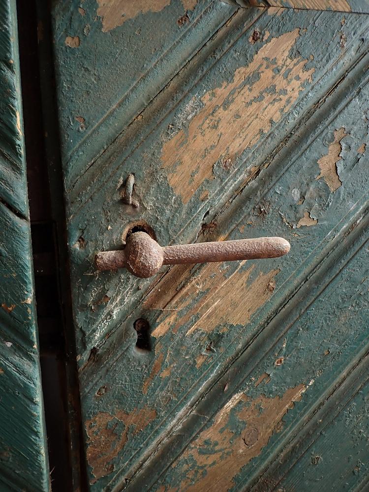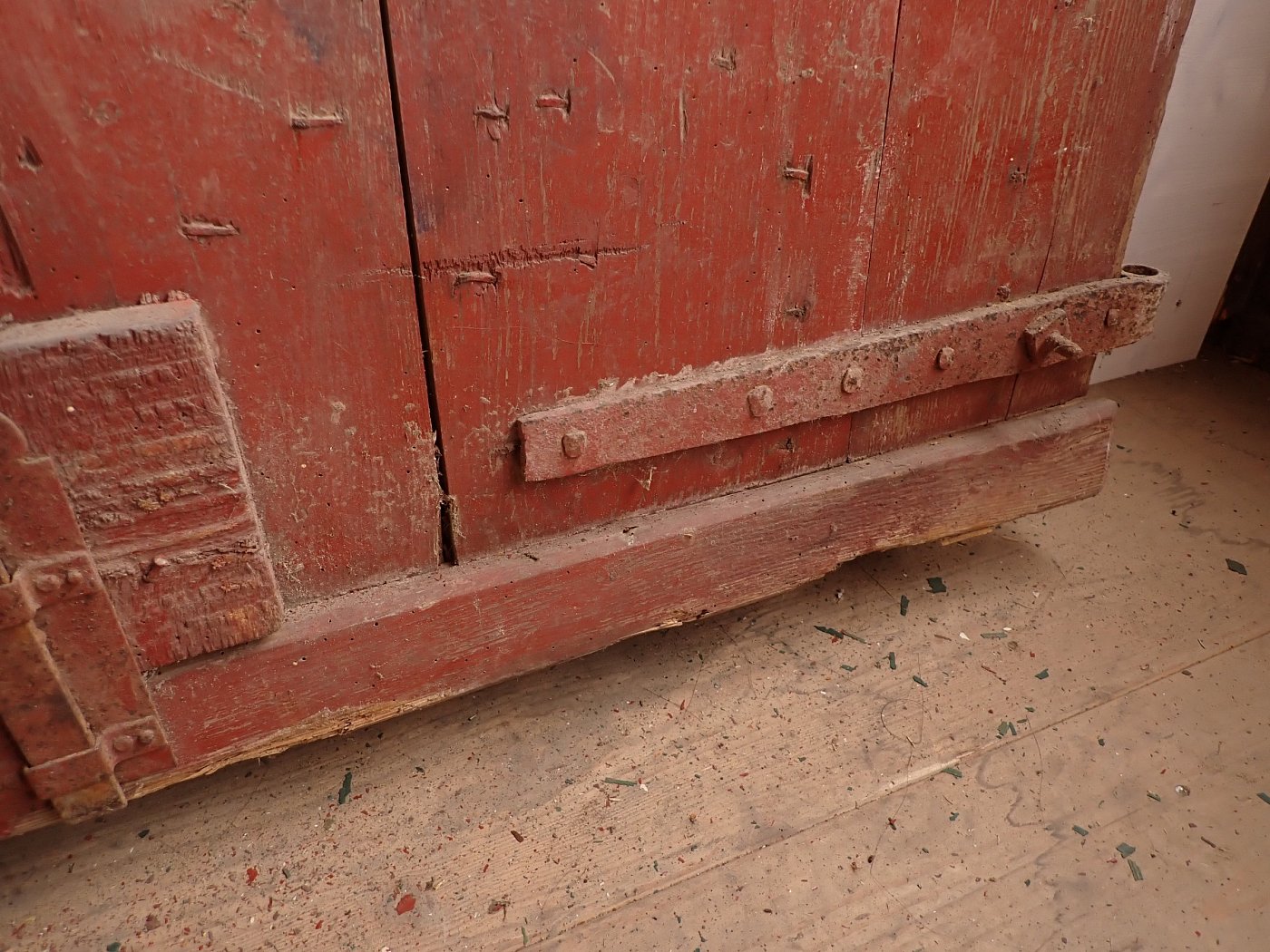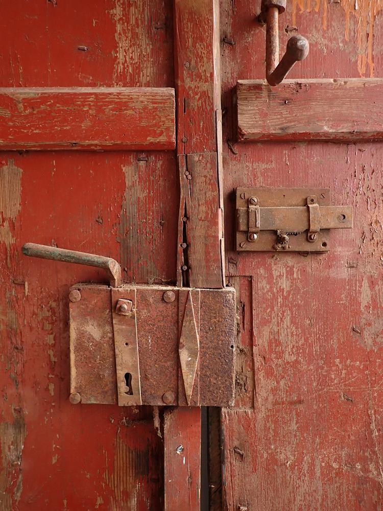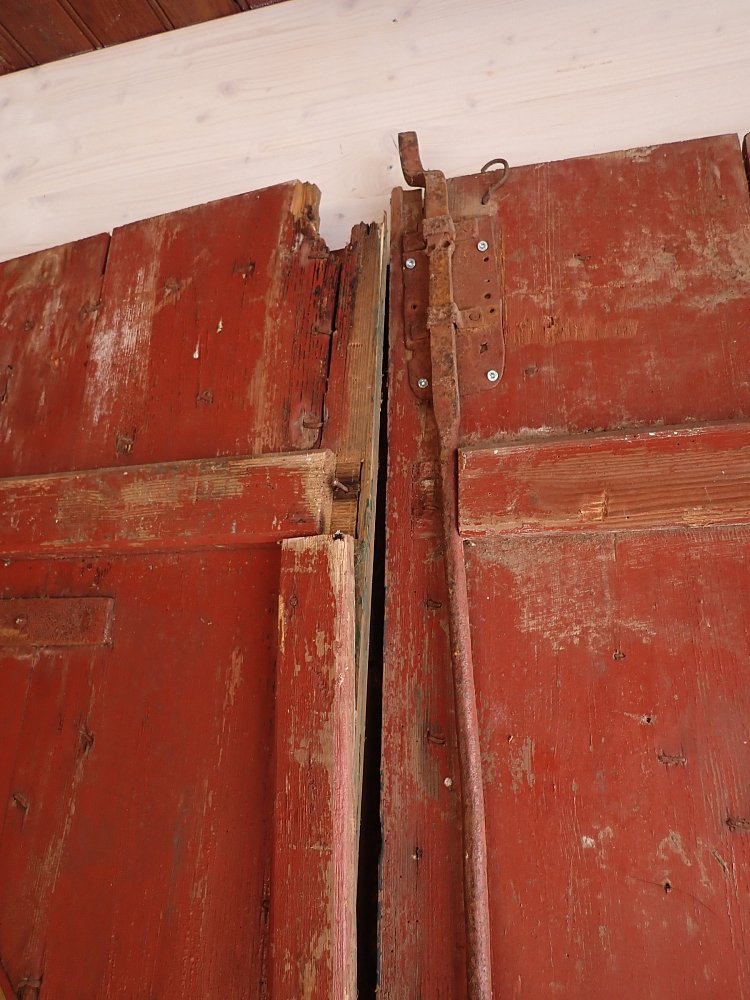 Ausgestattet ist das große Tor mit geschmiedeten Winkelbändern, einem Kastenschloss mit Eisendrückern und drei verschiedenen Schubriegeln.