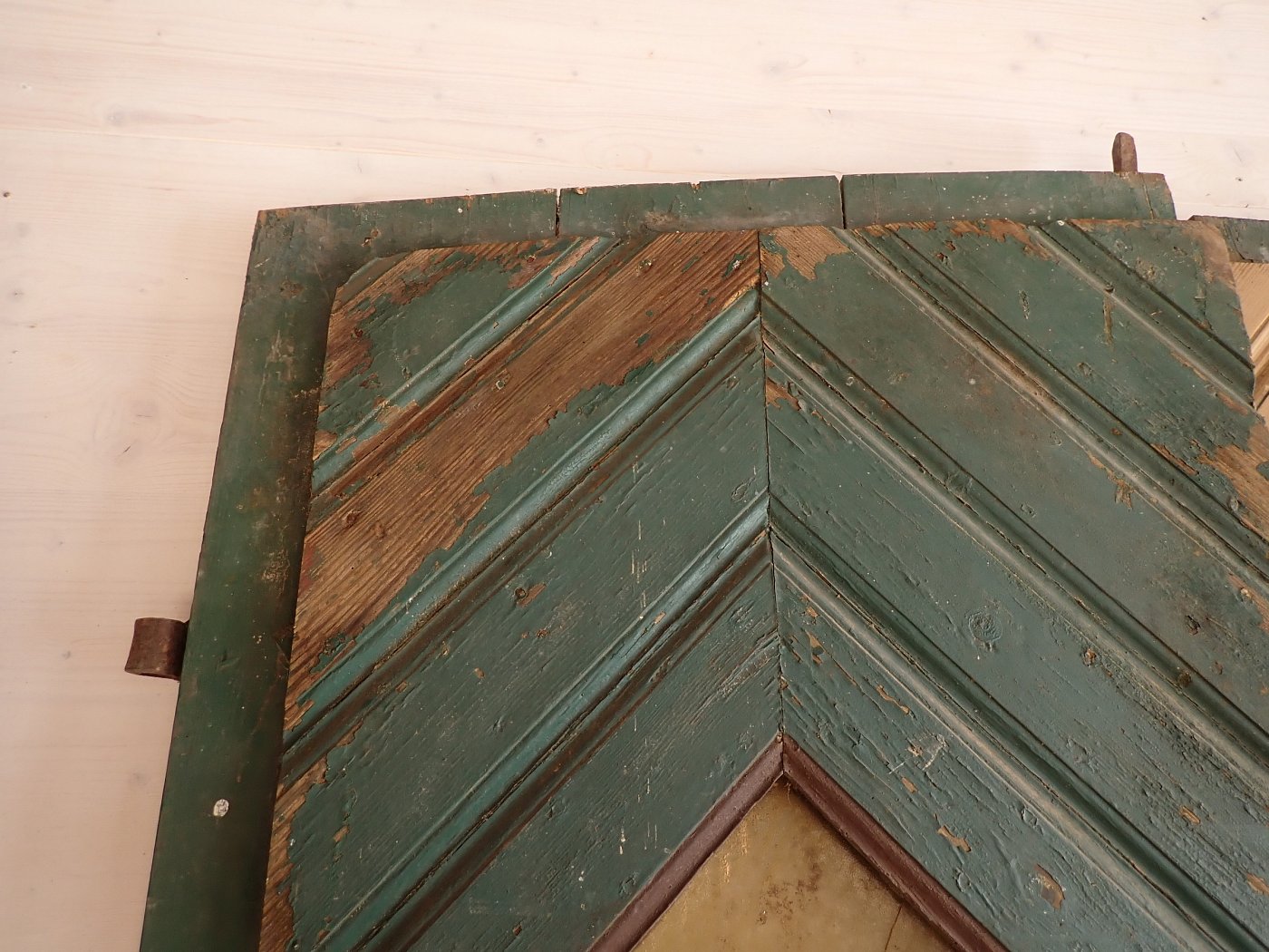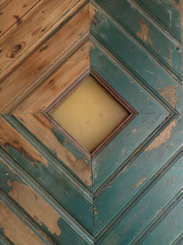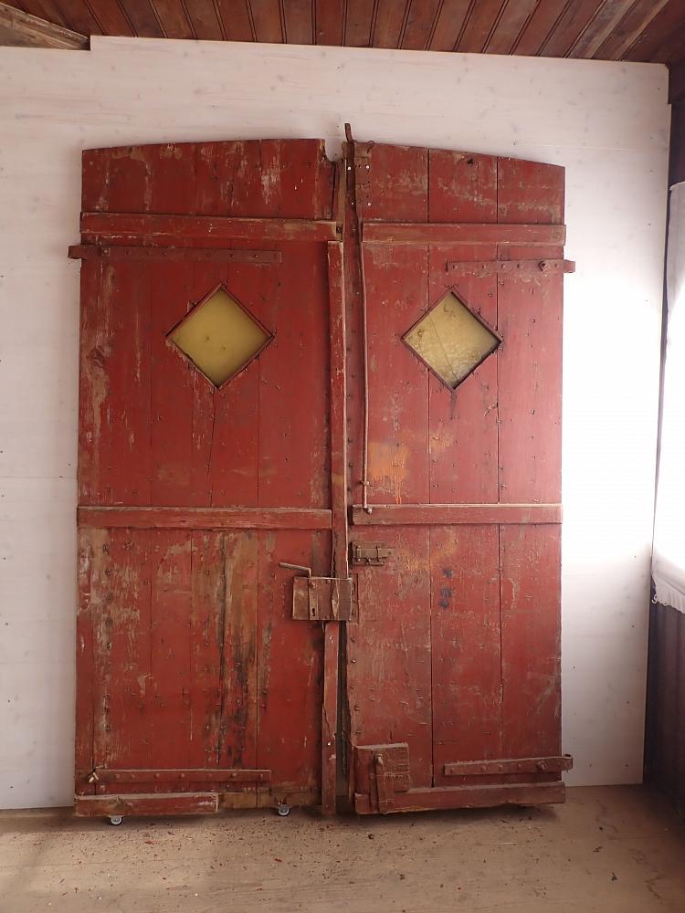 Die beiden Flügel sind auf der Innenseite ganz schlicht als Brettertüren gearbeitet. Die Außenseite ist dagegen deutlich schmuckvoller, mit profilierten Hölzern in Rautenform gestaltet. Im oberen Drittel ist je Flügel ein kleines Fenster eingearbeitet.
