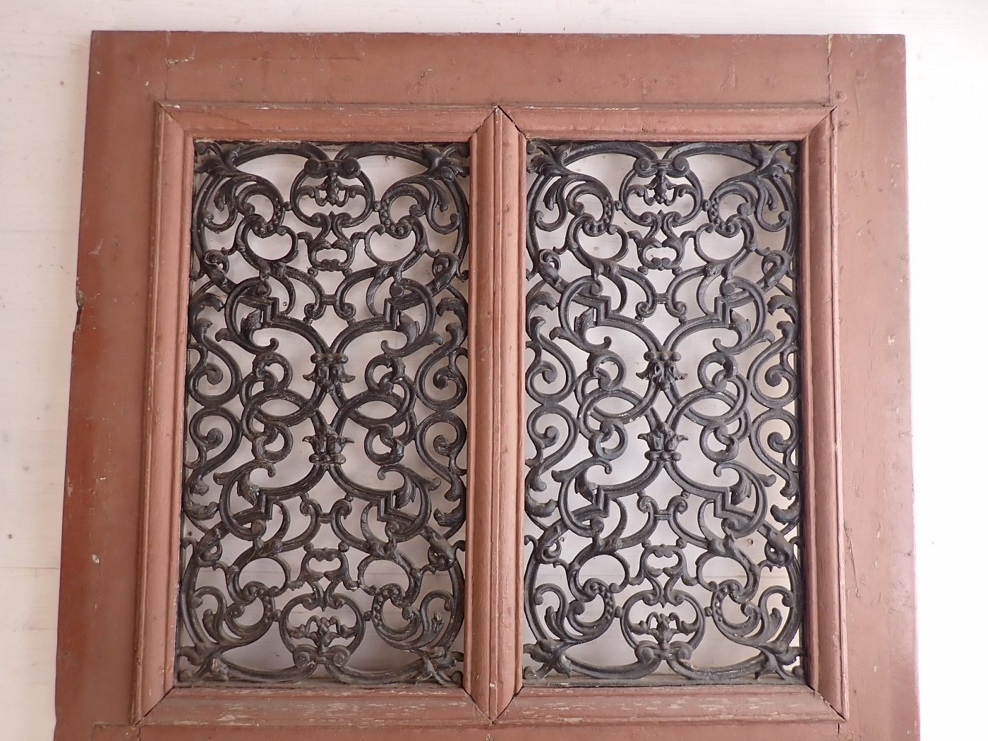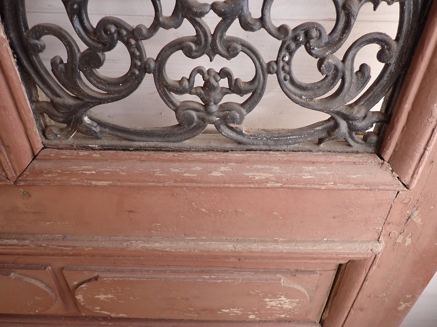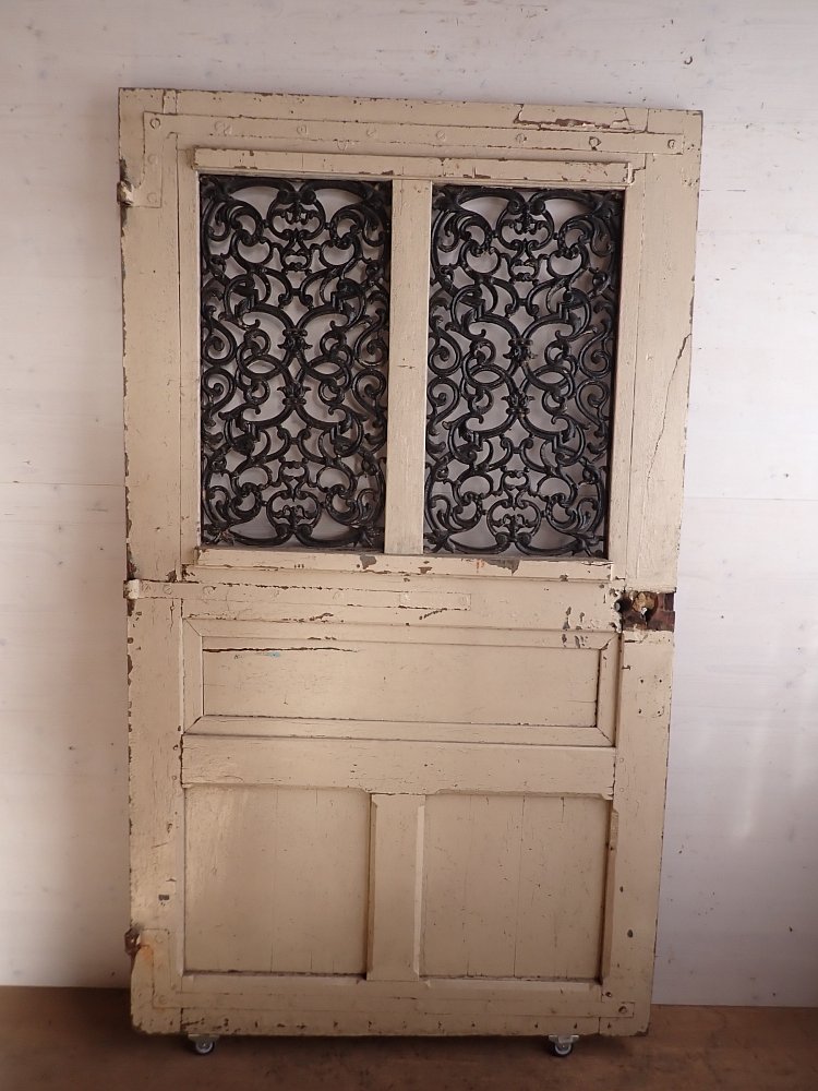 Die Tür ist aus Eiche gefertigt und mit beeindruckenden schmiedeeisernen Gittern gestaltet. Das massive, florale Muster liegt hinter zwei getrennten Scheiben. Diese fehlen leider, was wiederum die Möglichkeit für die Umsetzung eigener Ideen und Wünsche sein kann. Ansonsten ist die Tür mit dekorativen Füllungen ausgestattet. An der Tür fehlen die Klinken und das Schloss. Aber da lässt sich bestimmt etwas Passendes in unserem Türzubehör finden.