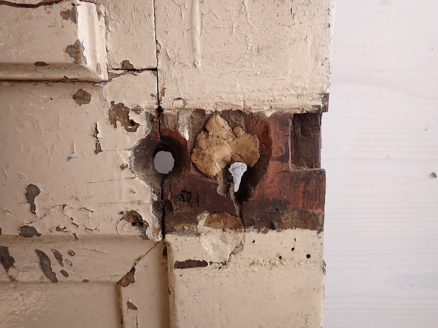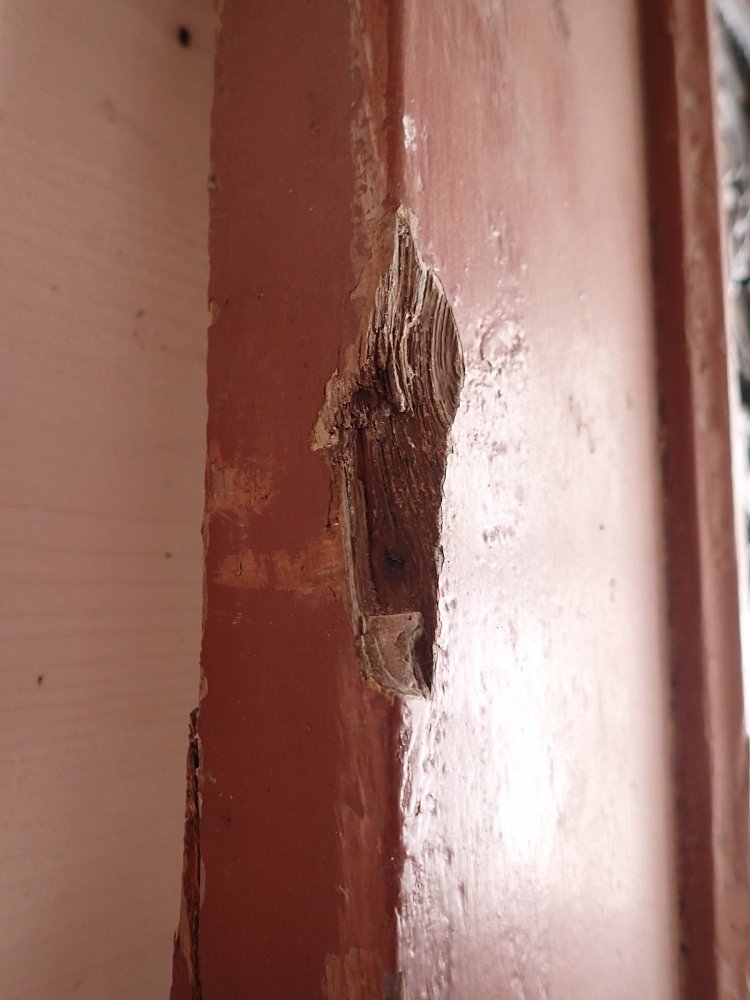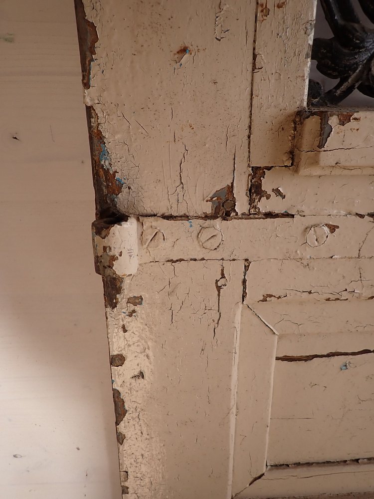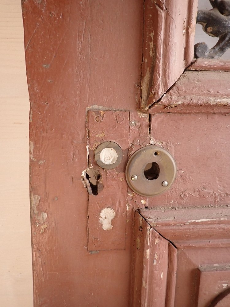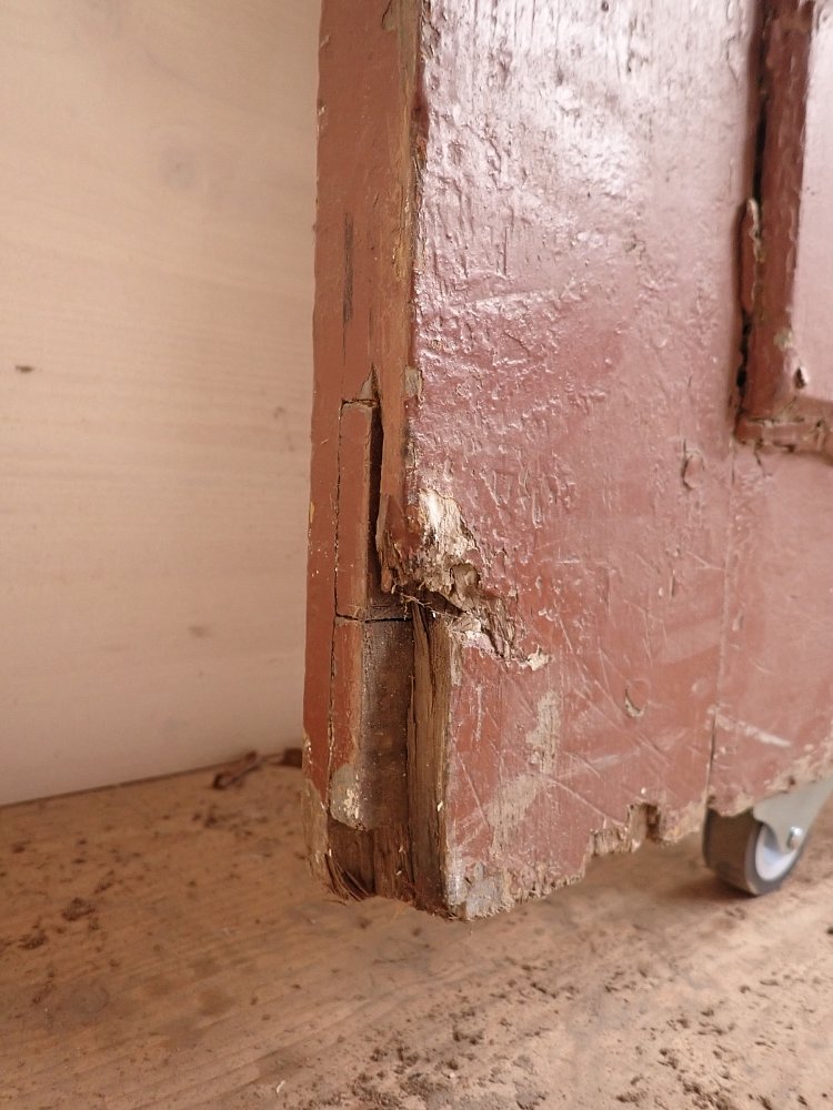 Die Tür befindet sich in einem altersbedingten Zustand. Der Lack blättert ab und das Holz arbeitet bereits am Spaltmaß und vergrößert diese. Außerdem sind die Kanten und Ecken bereits brüchig und weisen deshalb abgebrochene Stückchen auf.