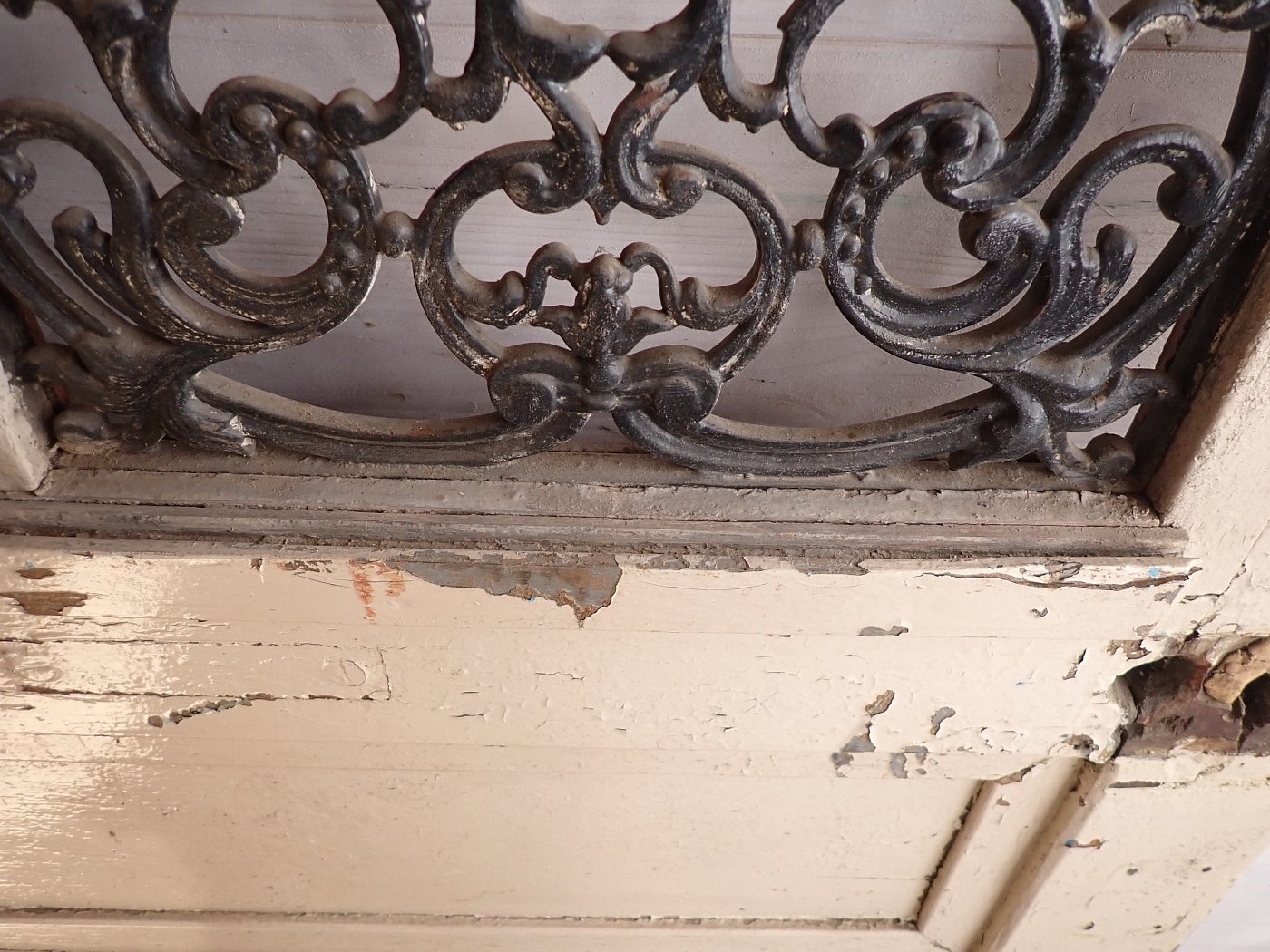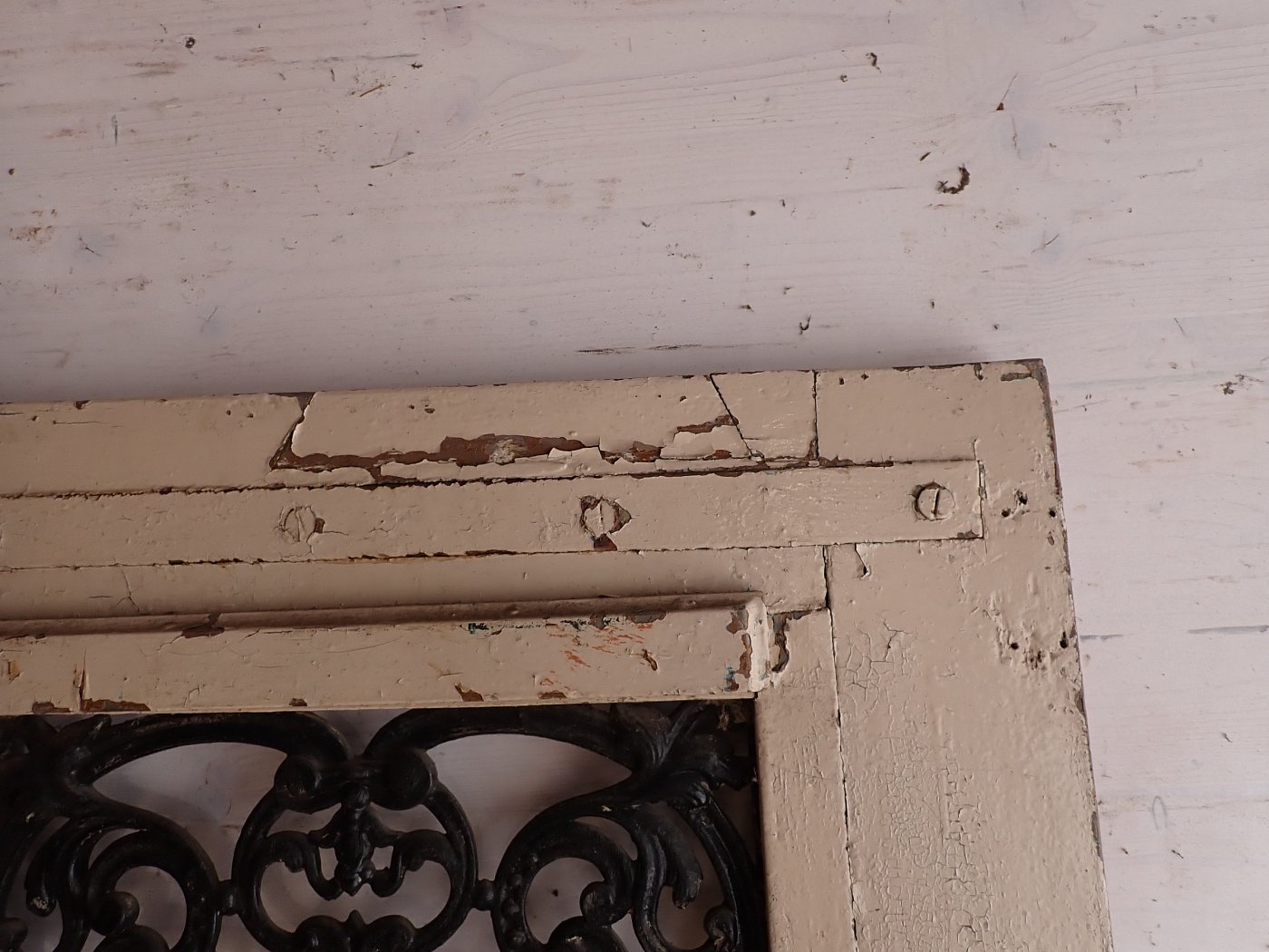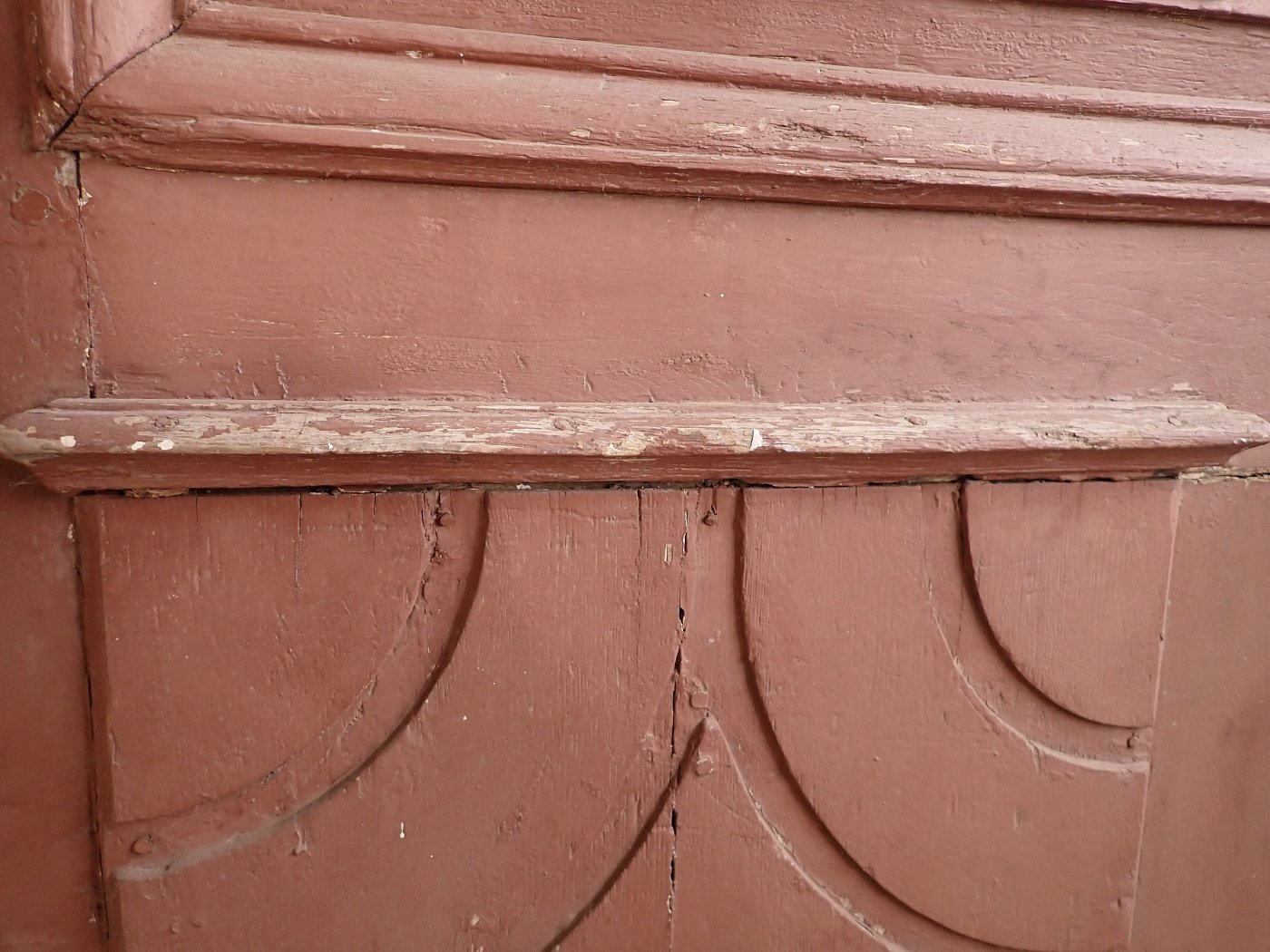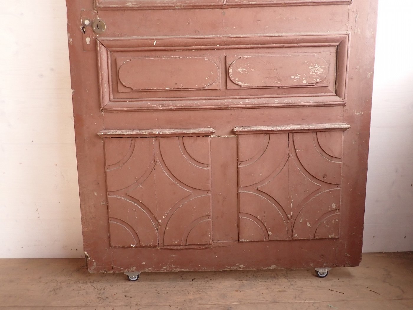Die Tür befindet sich in einem altersbedingten Zustand. Der Lack blättert ab und das Holz arbeitet bereits am Spaltmaß und vergrößert diese. Außerdem sind die Kanten und Ecken bereits brüchig und weisen deshalb abgebrochene Stückchen auf.