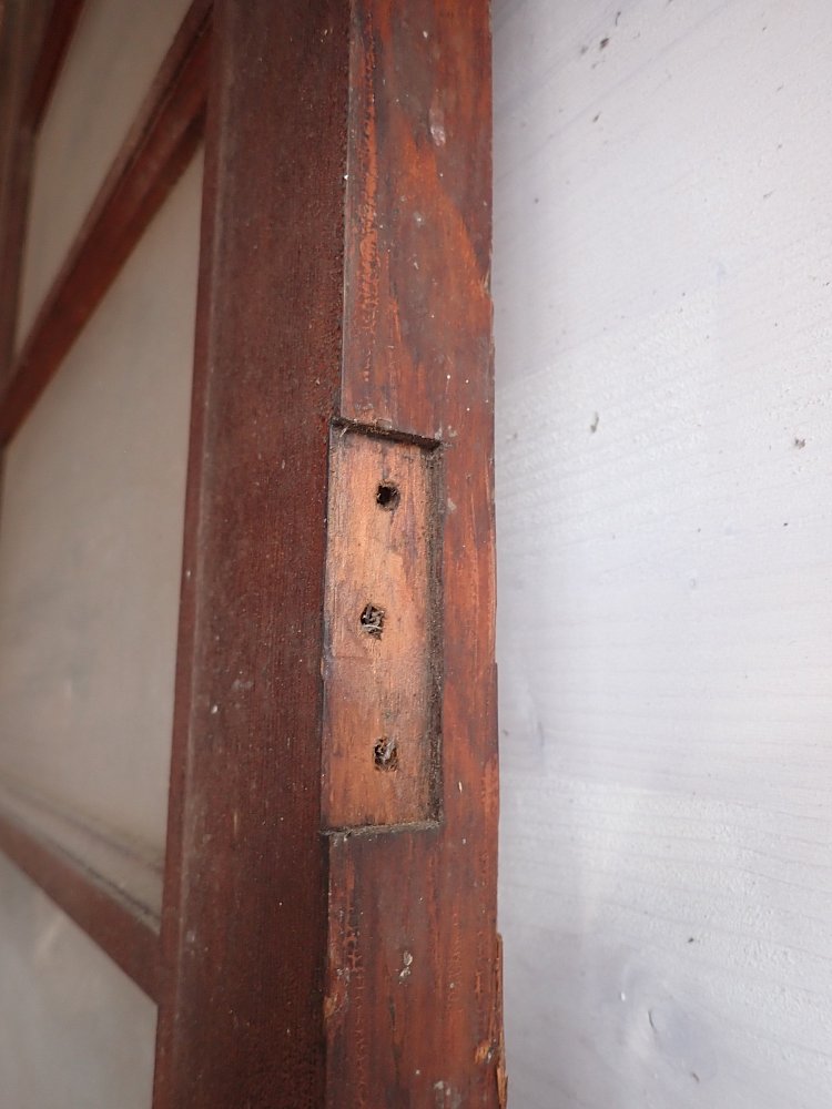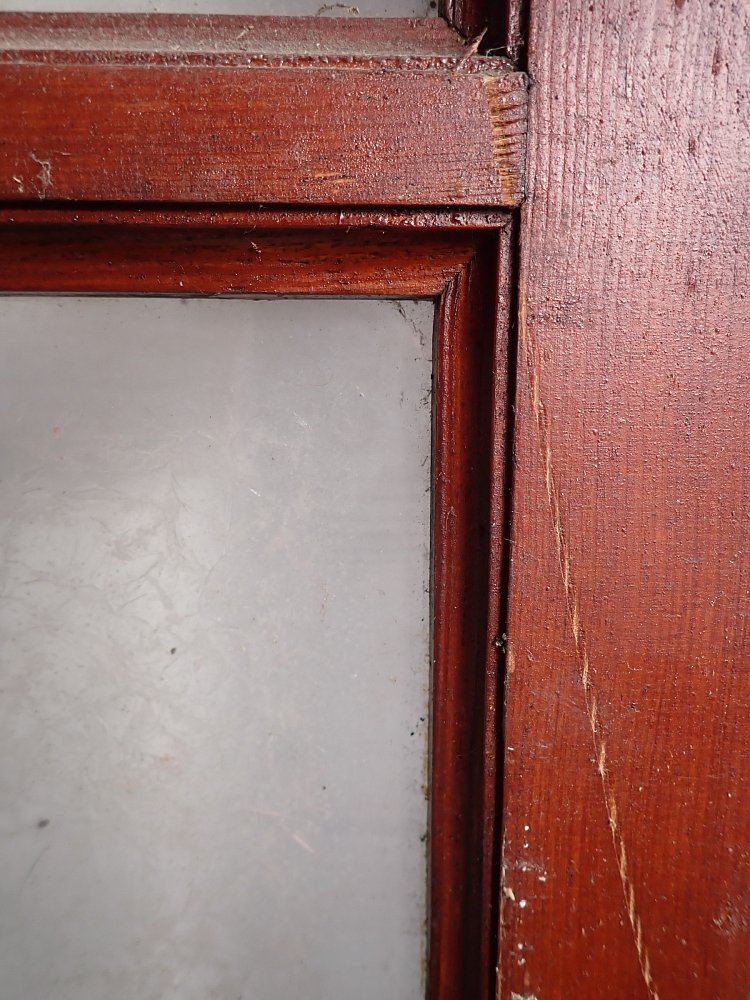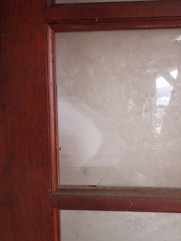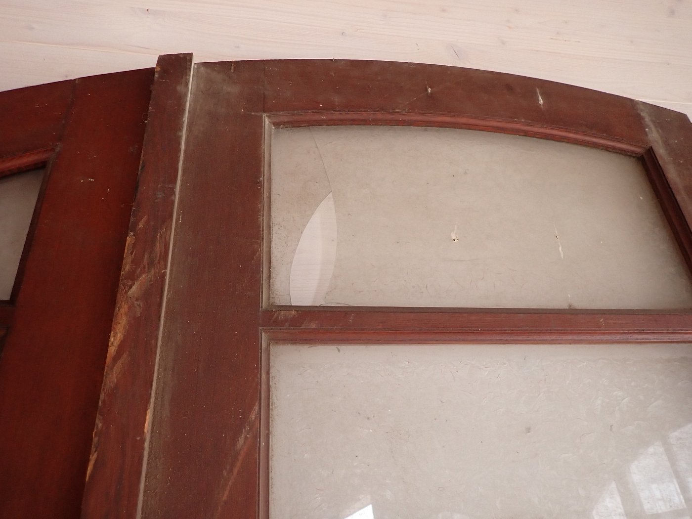 Leider sind einzelne Scheiben gesprungen, ansonsten befindet sich die Tür in einem sehr guten Zustand und wartet nur auf einen repräsentativen Einbauplatz.