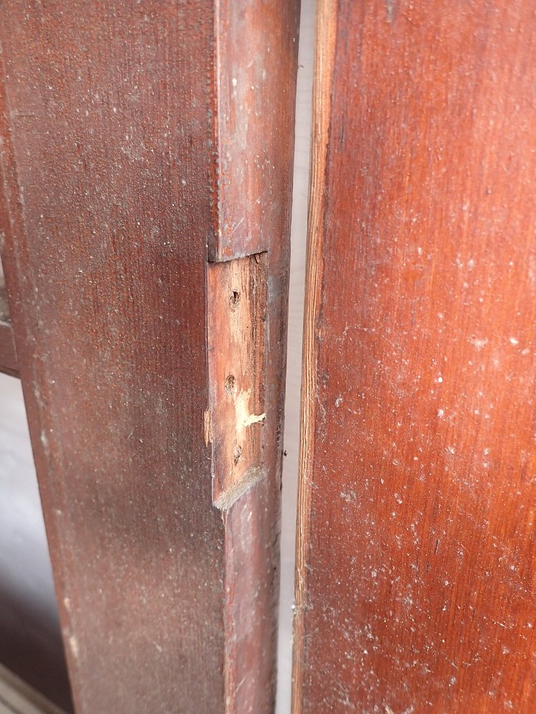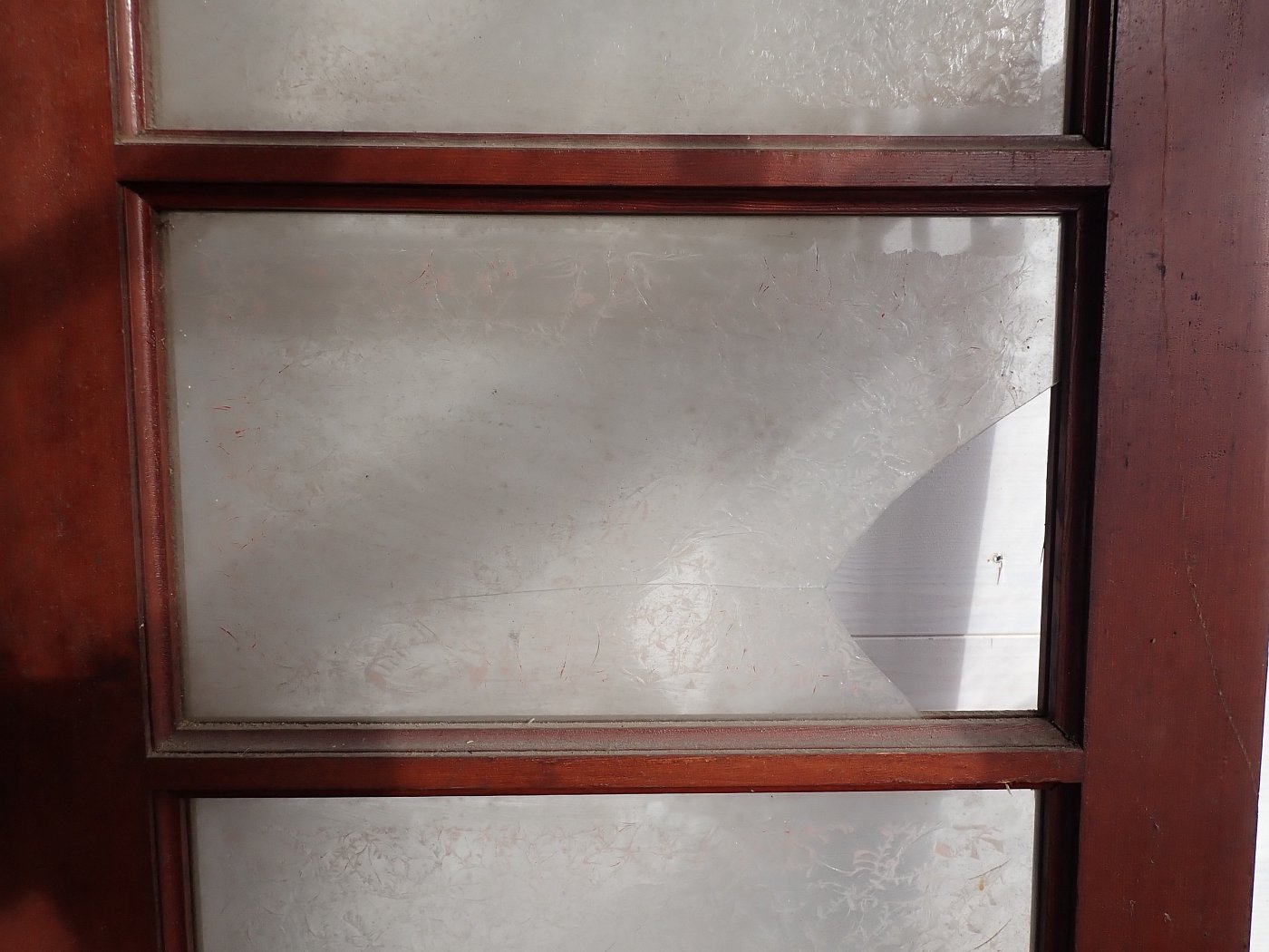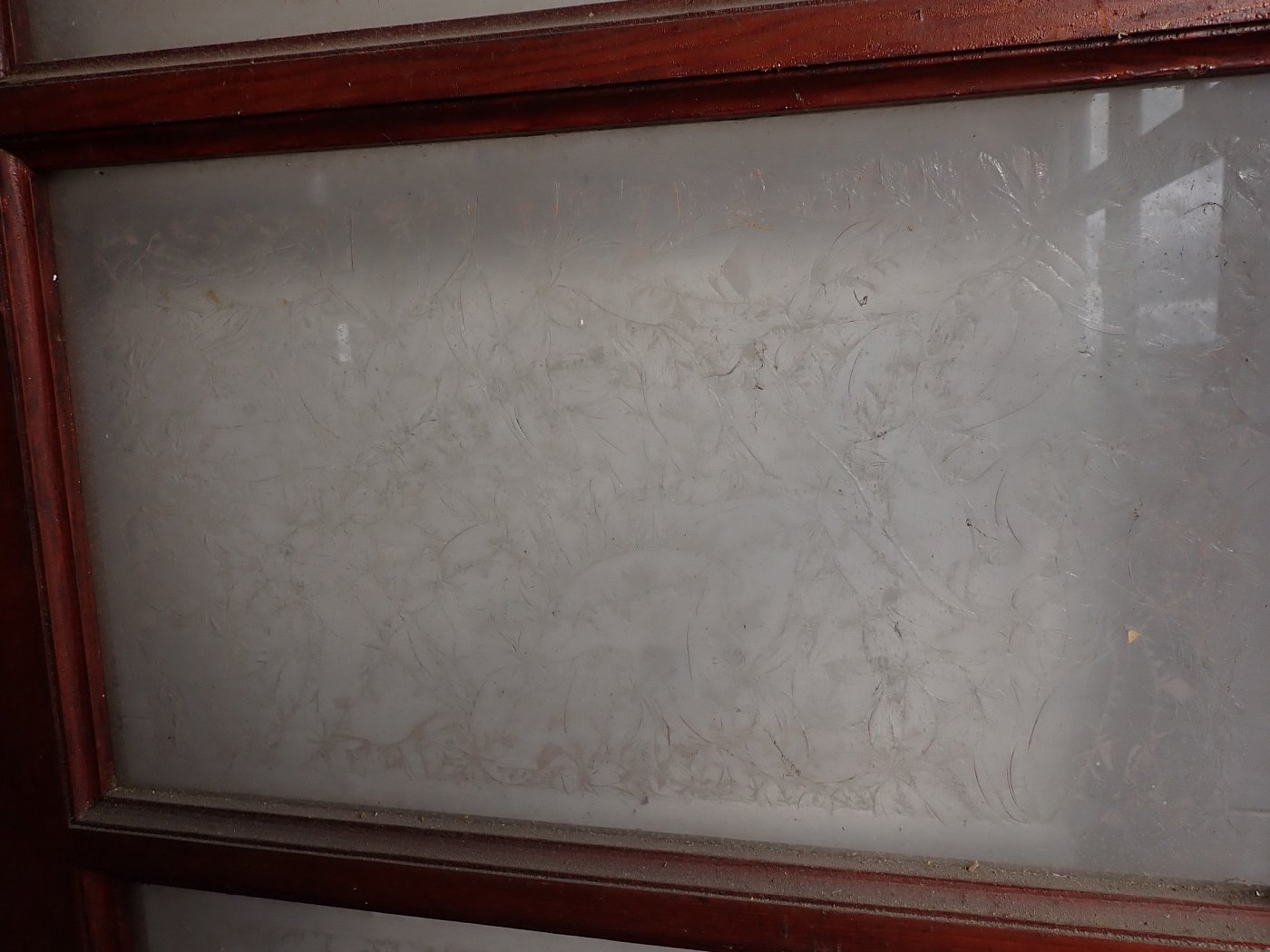 Leider sind einzelne Scheiben gesprungen, ansonsten befindet sich die Tür in einem sehr guten Zustand und wartet nur auf einen repräsentativen Einbauplatz.
