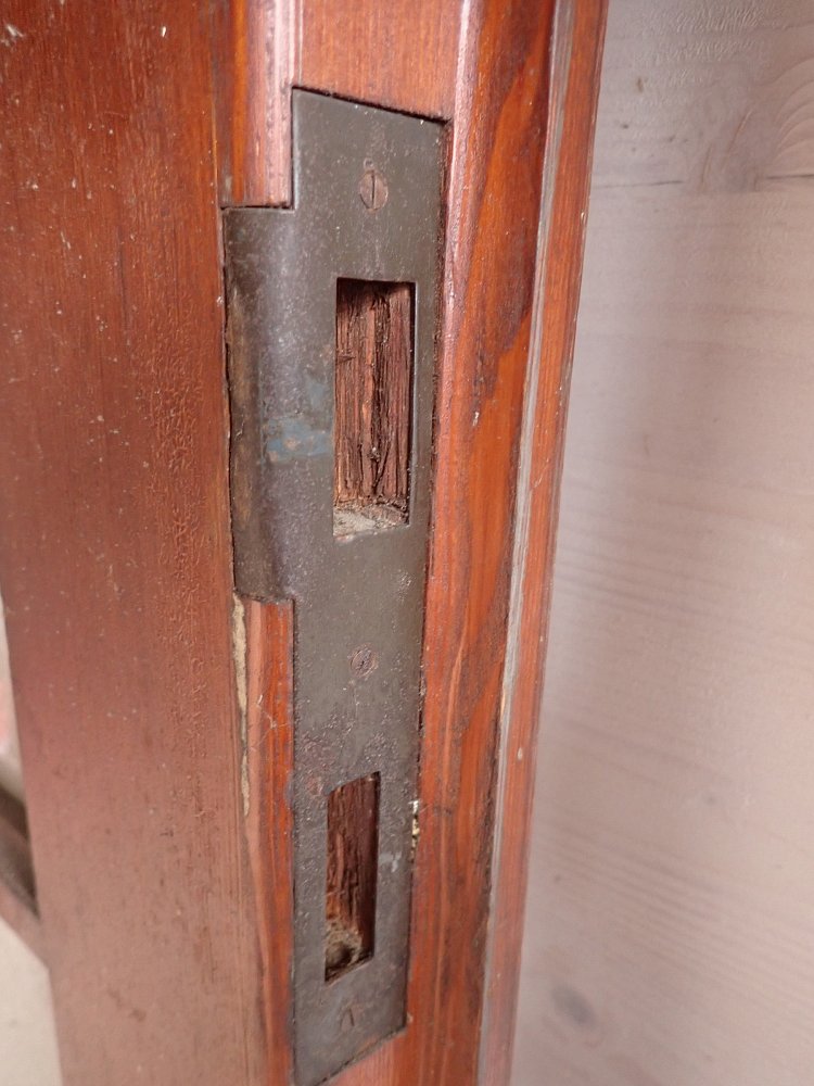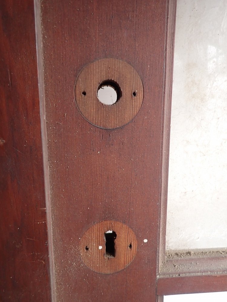Aktuell sind weder die Scharniere noch das Schloss oder eine Drückergarnitur vorhanden. Diese können bei einem Wiedereinbau auf die entsprechende Einbausituation angepasst werden.