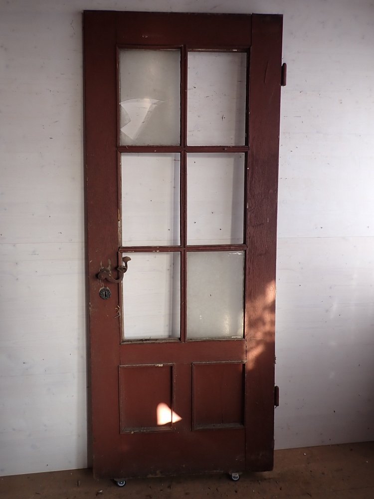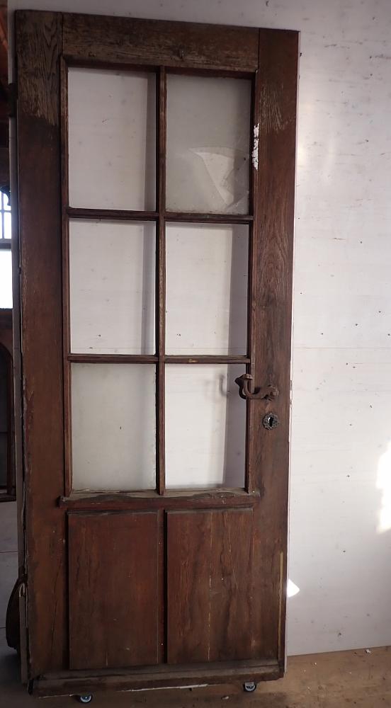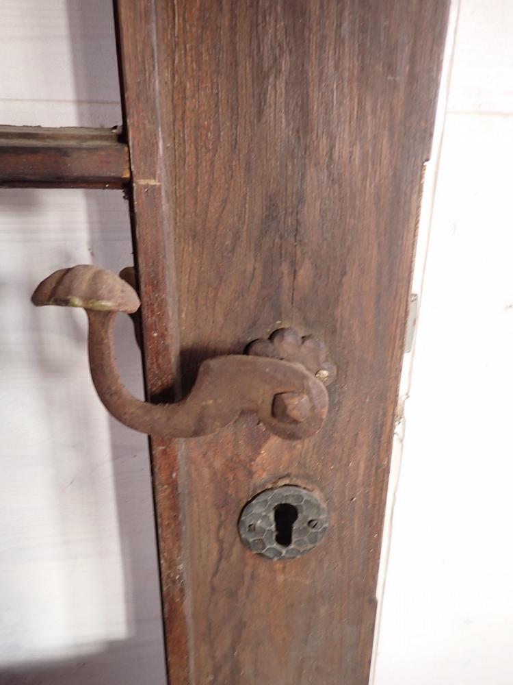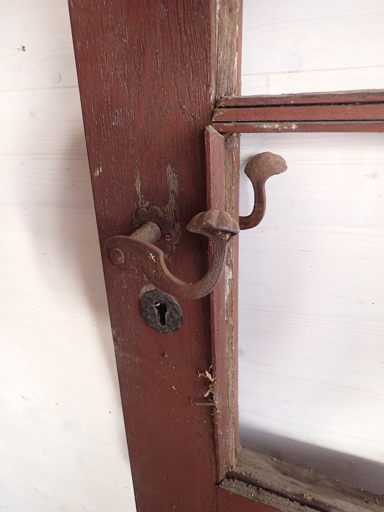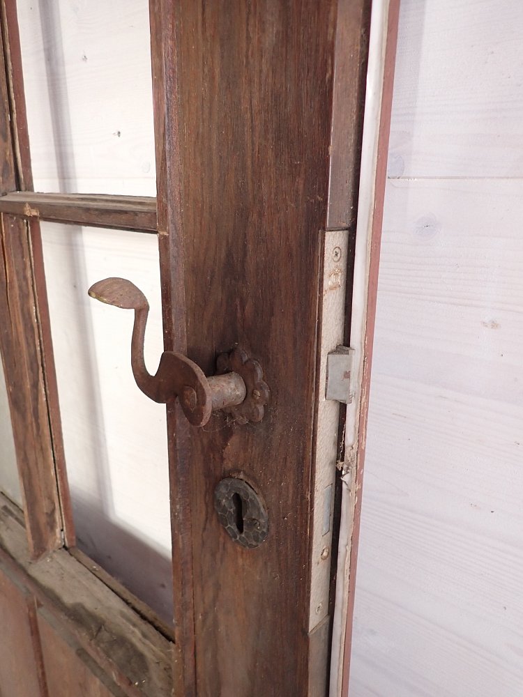 Die schmale aber hohe Tür hat im Fußbereich zwei Kassettenfüllungen und ist ansonsten mit einer durch Sprossen unterteilten Festverglasung gestaltet. Ausgestattet ist sie mit einer geschmiedeten Drückergarnitur, die durch den Transport und die Lagerung leider leicht verbogen ist.