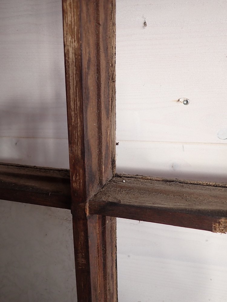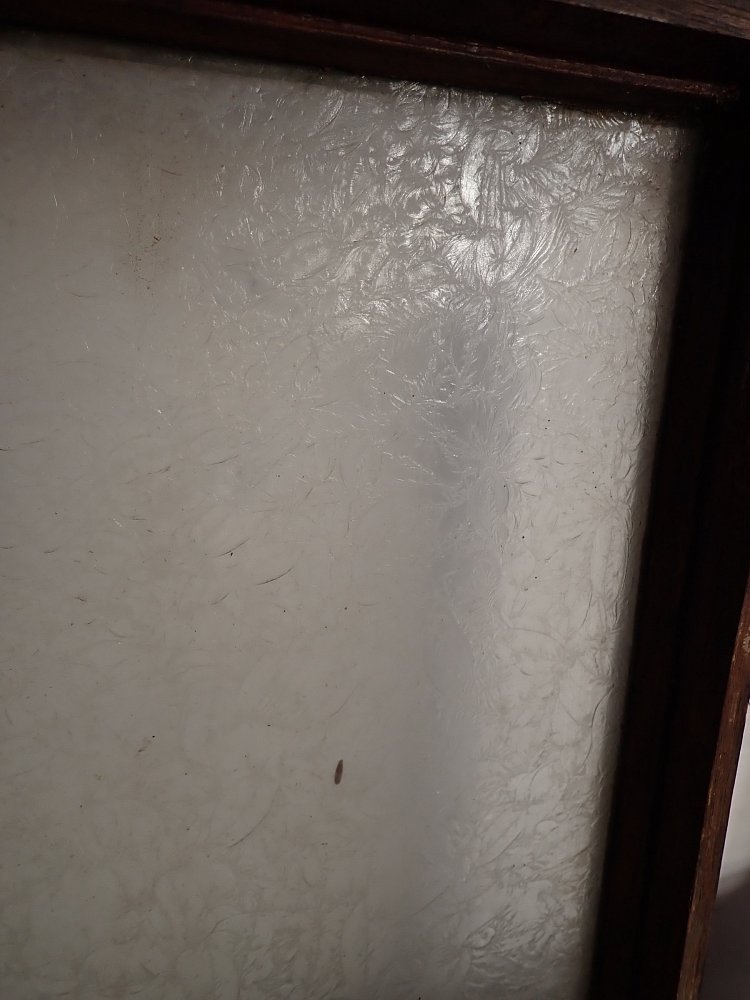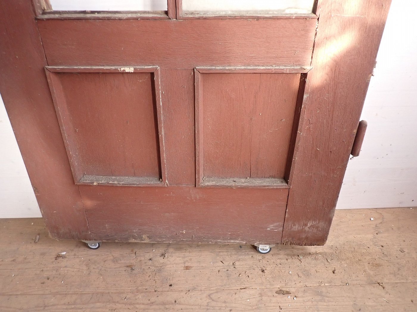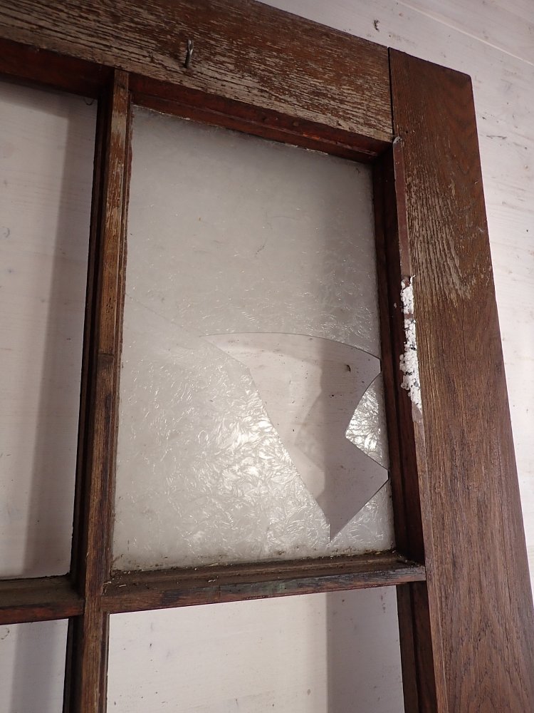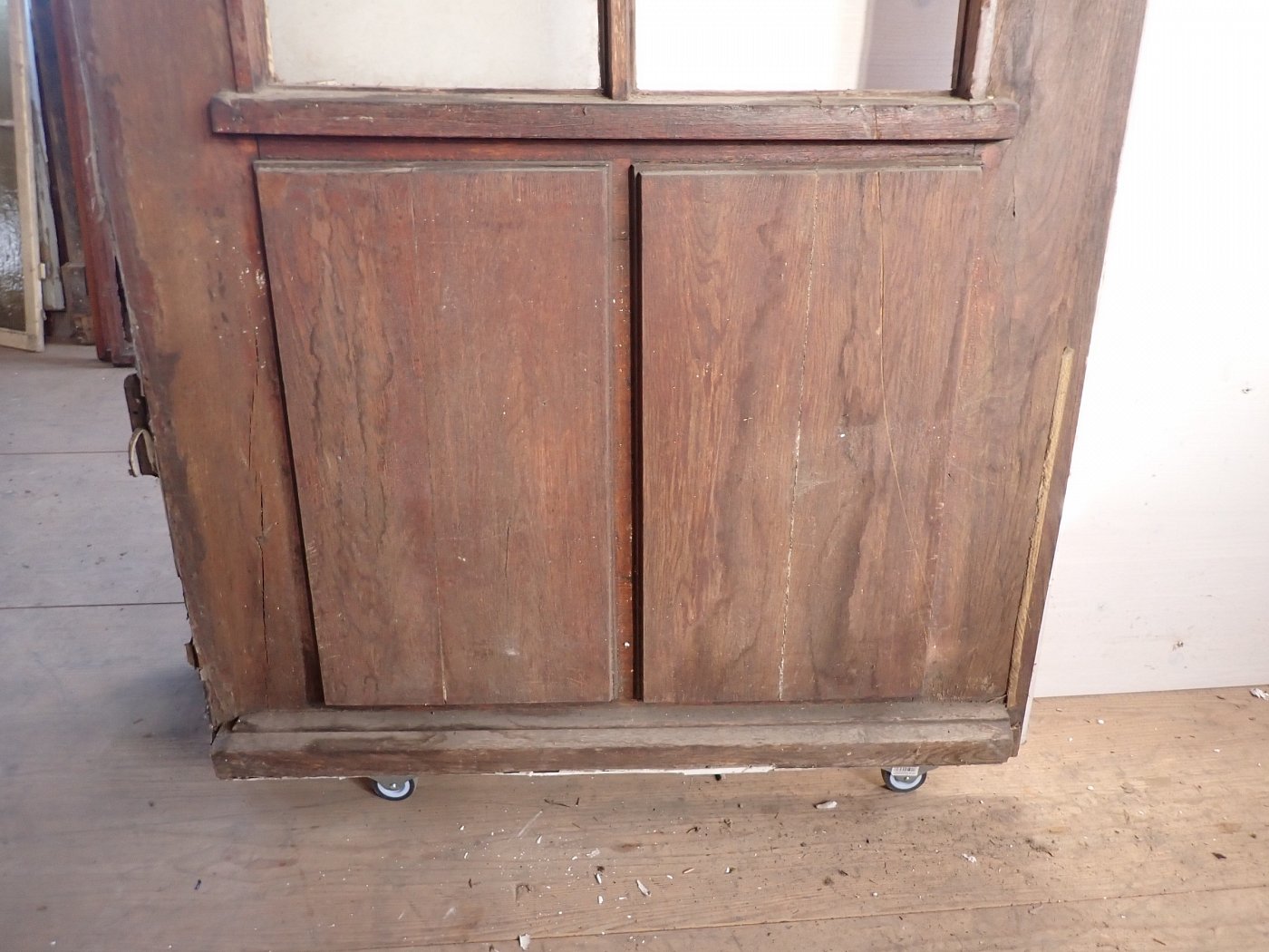 Die schmale aber hohe Tür hat im Fußbereich zwei Kassettenfüllungen und ist ansonsten mit einer durch Sprossen unterteilten Festverglasung gestaltet. Ausgestattet ist sie mit einer geschmiedeten Drückergarnitur, die durch den Transport und die Lagerung leider leicht verbogen ist.