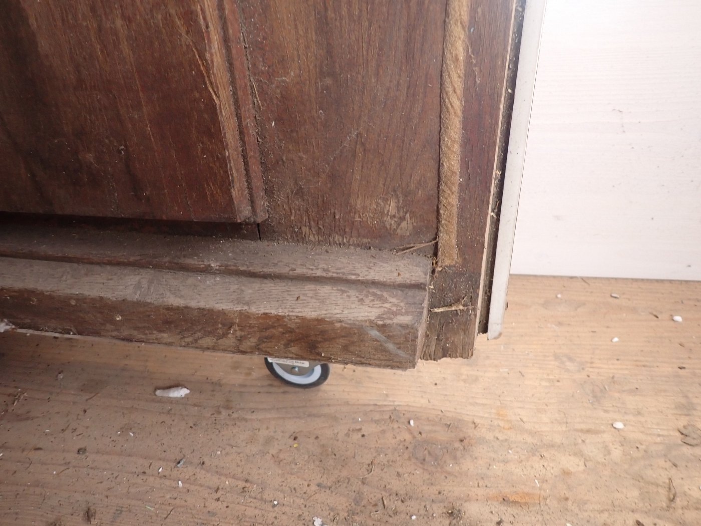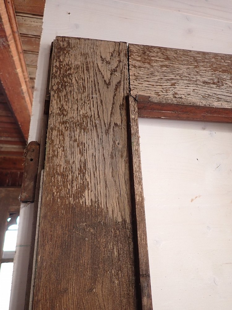 Auf der Türaußenseite ist die Eichentür wettergegerbt, die Innenseite ist in einem dunklen Rot gestrichen.