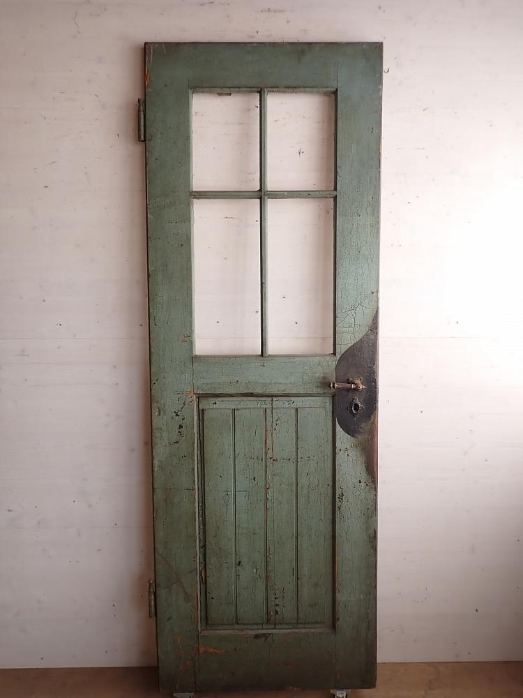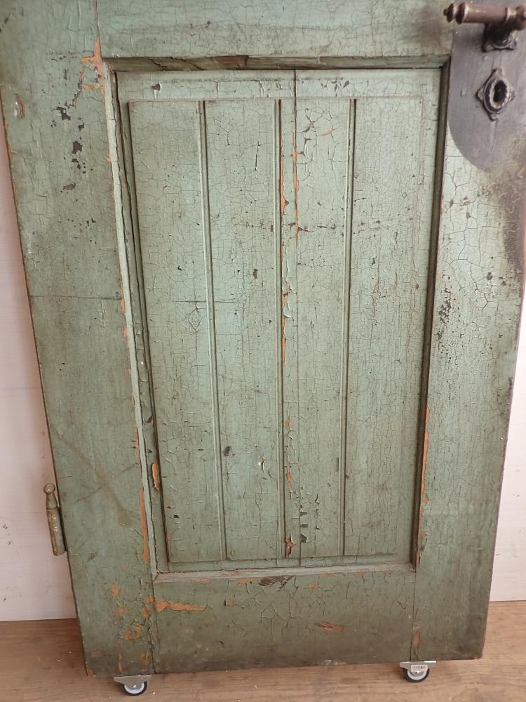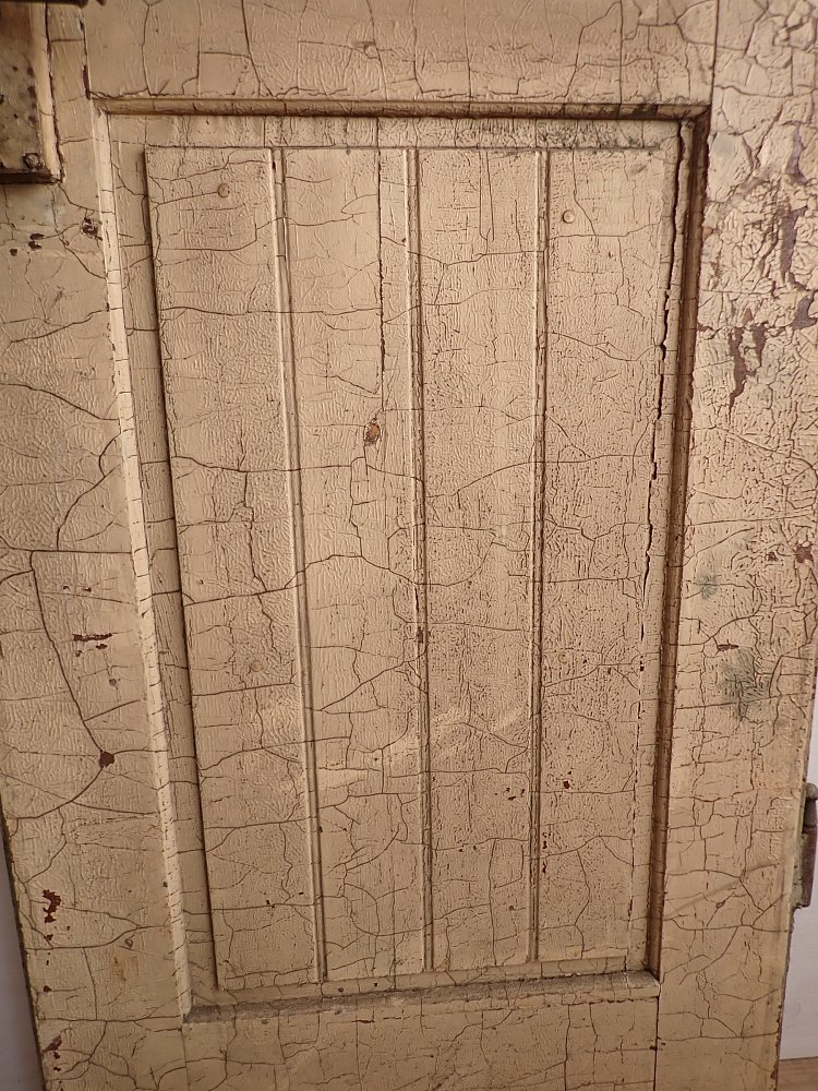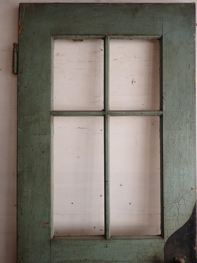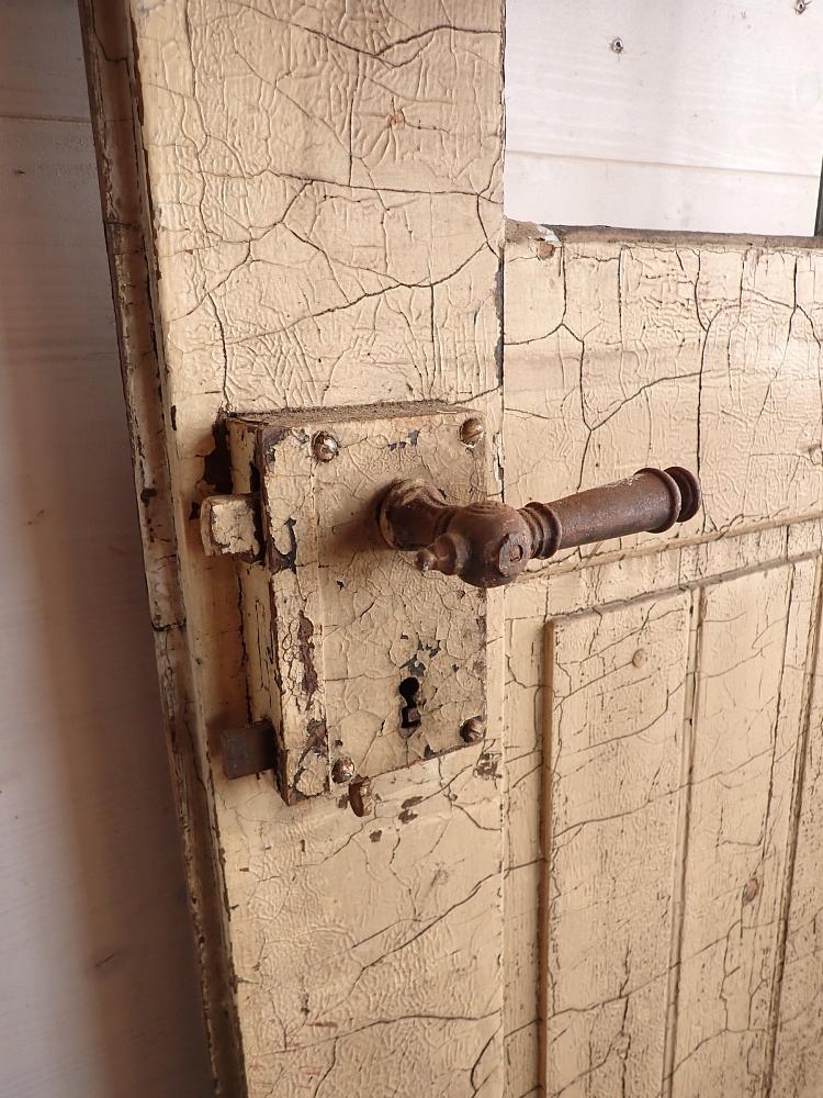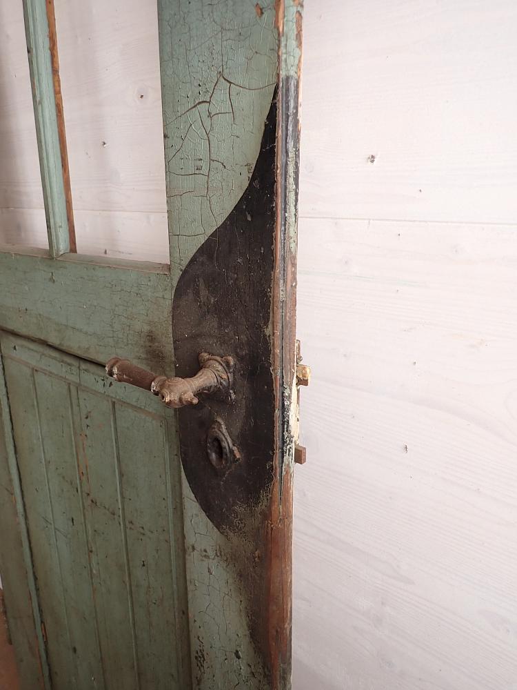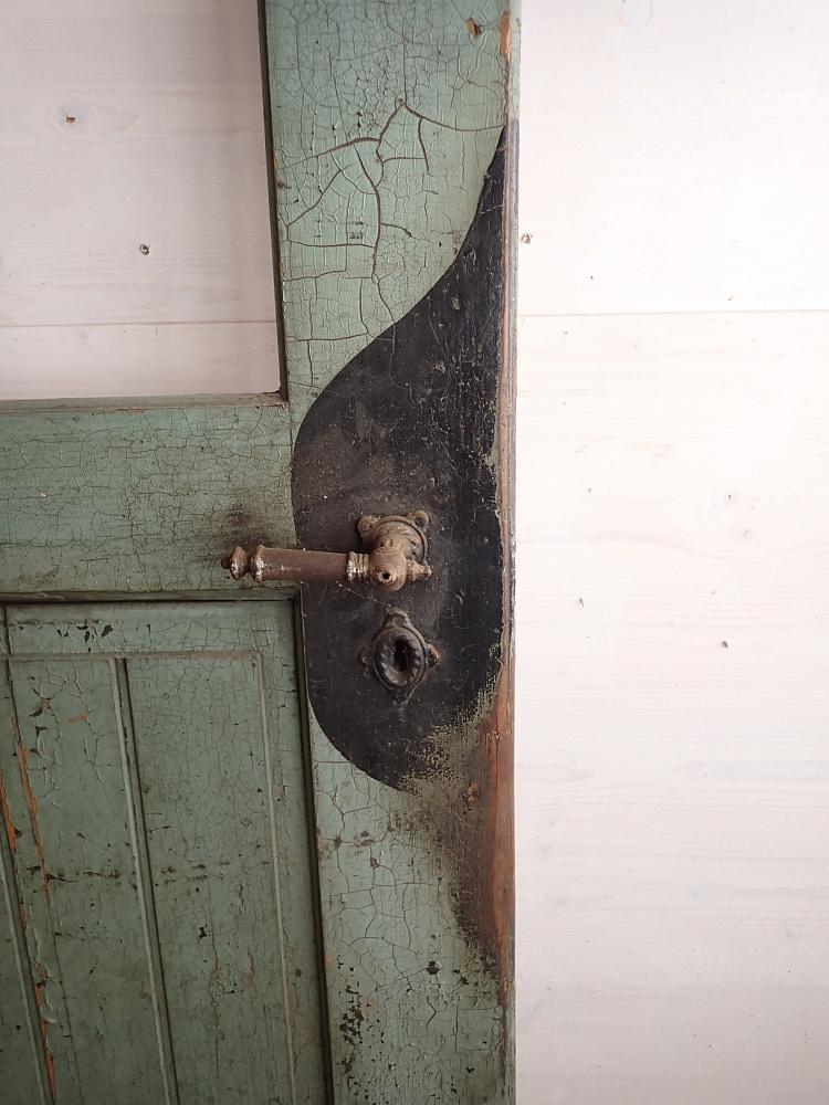 Insgesamt befindet sich die Tür in einem guten Bergezustand und auch das originale Kastenschloss mit passender Drückergarnitur ist noch vorhanden. Dennoch braucht sie vor einem Wiedereinbau wohl die eine oder andere Stunde Zuwendung, denn sowohl der grüne Lack auf der Außenseite als auch der weiße Lack auf der Innenseite haben ihre beste Zeit hinter sich und blättern ab.