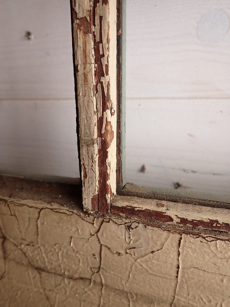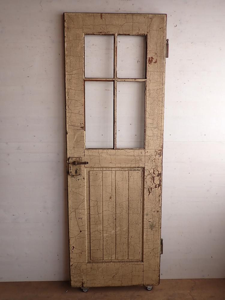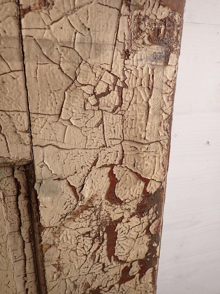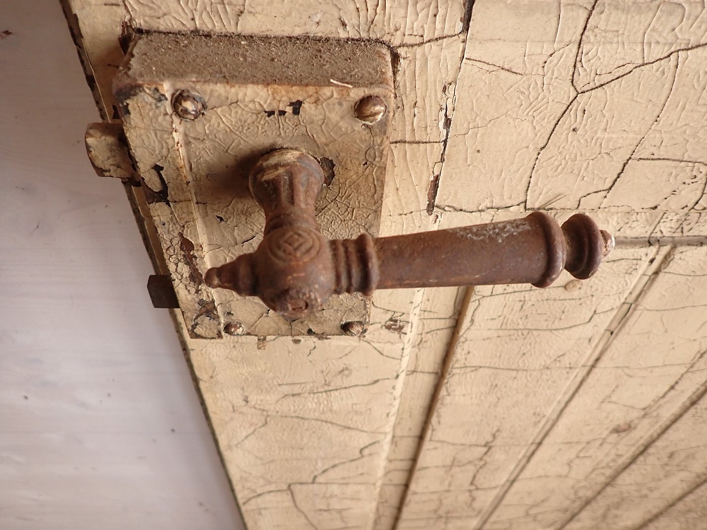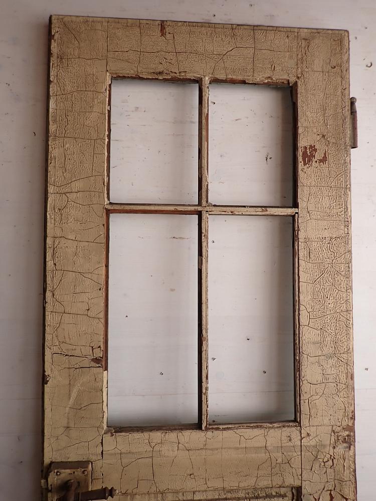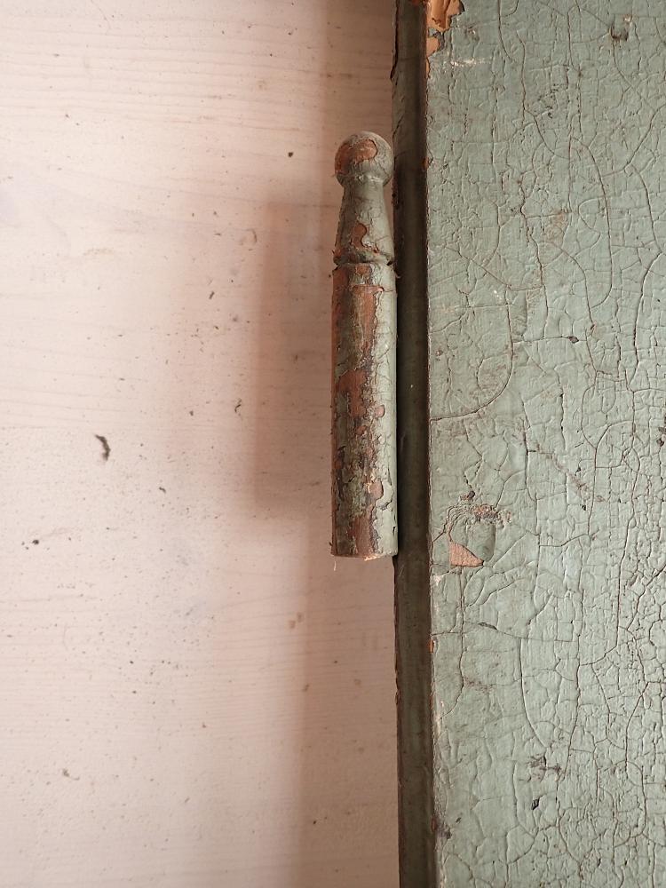 Insgesamt befindet sich die Tür in einem guten Bergezustand und auch das originale Kastenschloss mit passender Drückergarnitur ist noch vorhanden. Dennoch braucht sie vor einem Wiedereinbau wohl die eine oder andere Stunde Zuwendung, denn sowohl der grüne Lack auf der Außenseite als auch der weiße Lack auf der Innenseite haben ihre beste Zeit hinter sich und blättern ab.