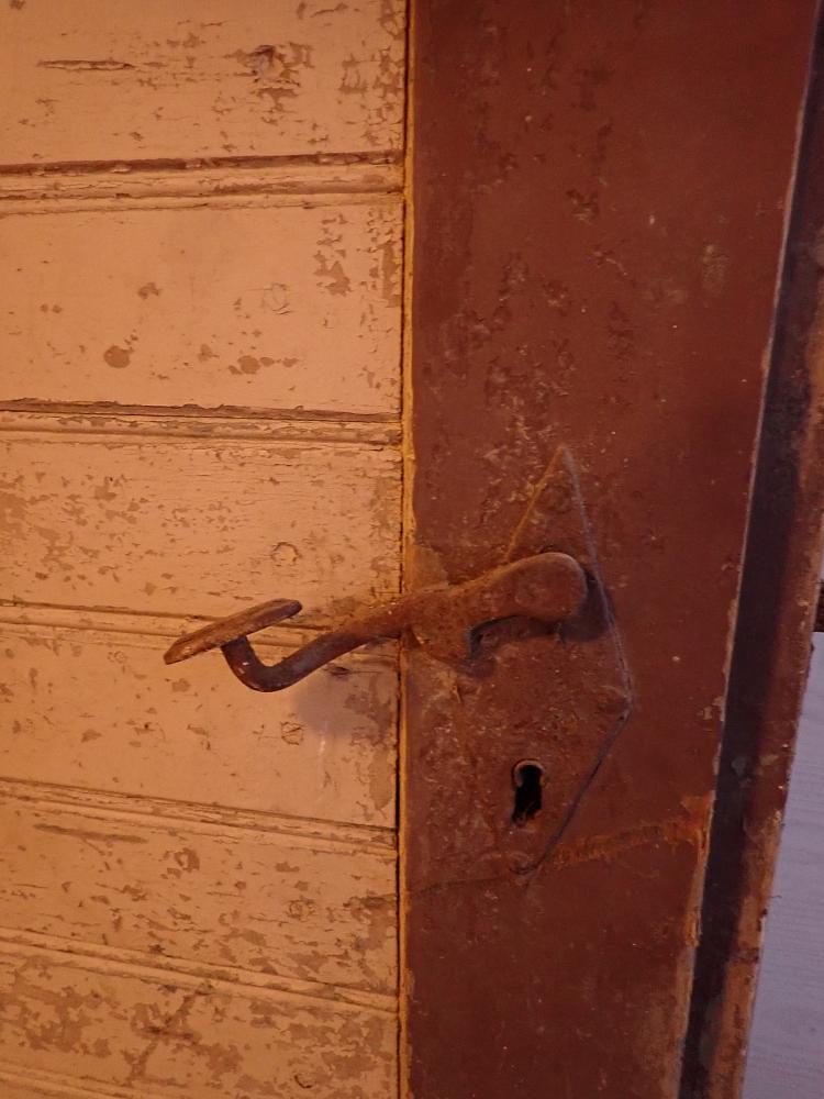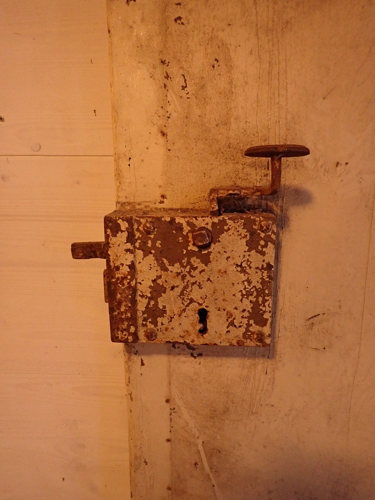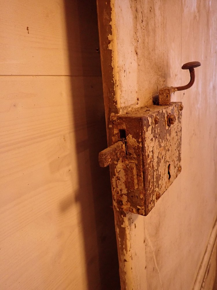Ausgestattet ist die Tür mit geschmiedeten Langbändern, einem klassischen Kastenschloss und einem einfachen Eisendrücker auf der Außenseite.