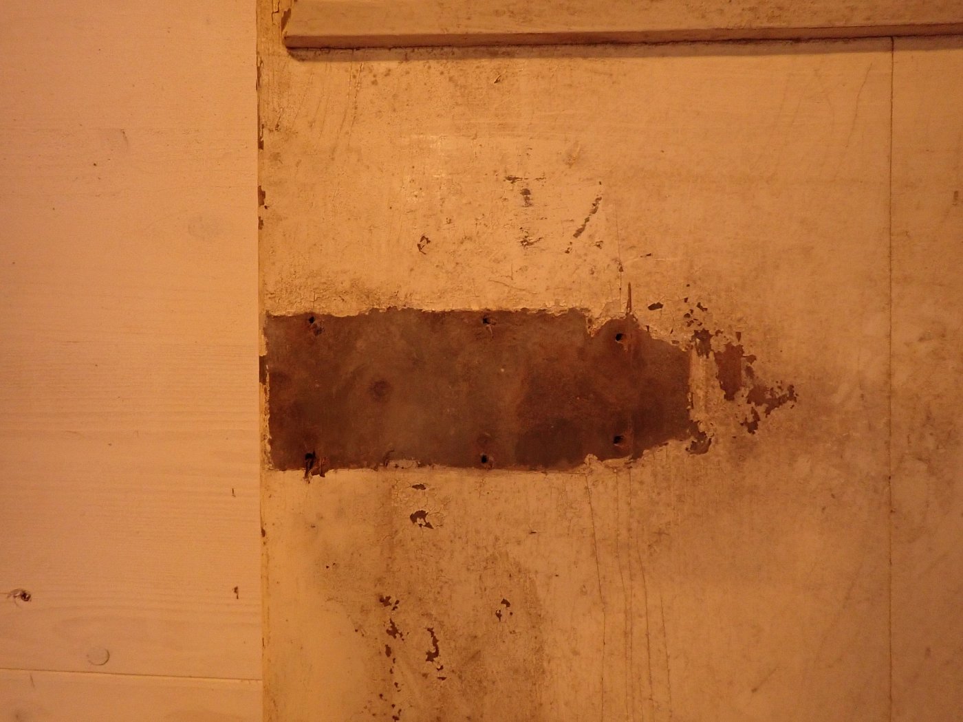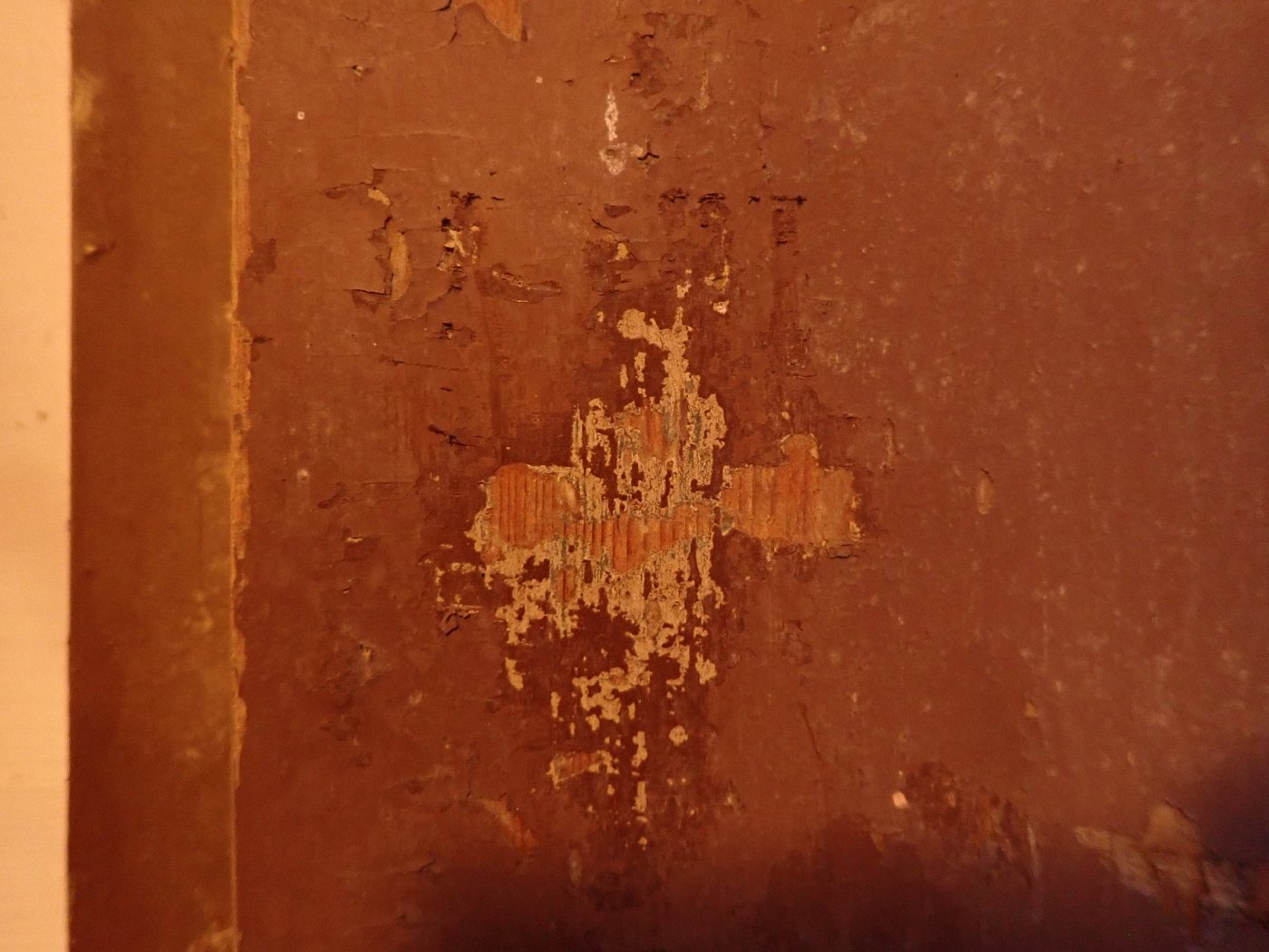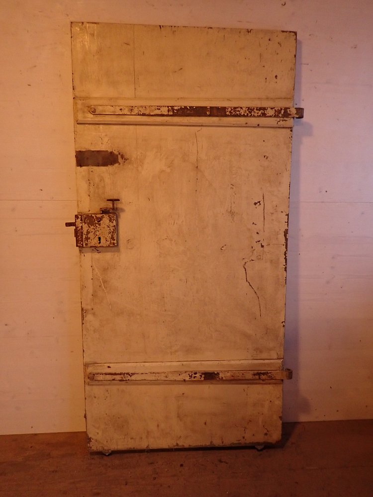 Insgesamt befindet sich die Tür in einem soliden Bergezustand, auch wenn der farbige Lack auf der Außenseite abbröselt und es an einigen Stellen alte Fraßspuren des Holzwurms gibt. Ob diese noch aktiv bewohnt sind, wissen wir nicht, können aber zur Sicherheit eine thermische Behandlung in der Trockenkammer empfehlen.