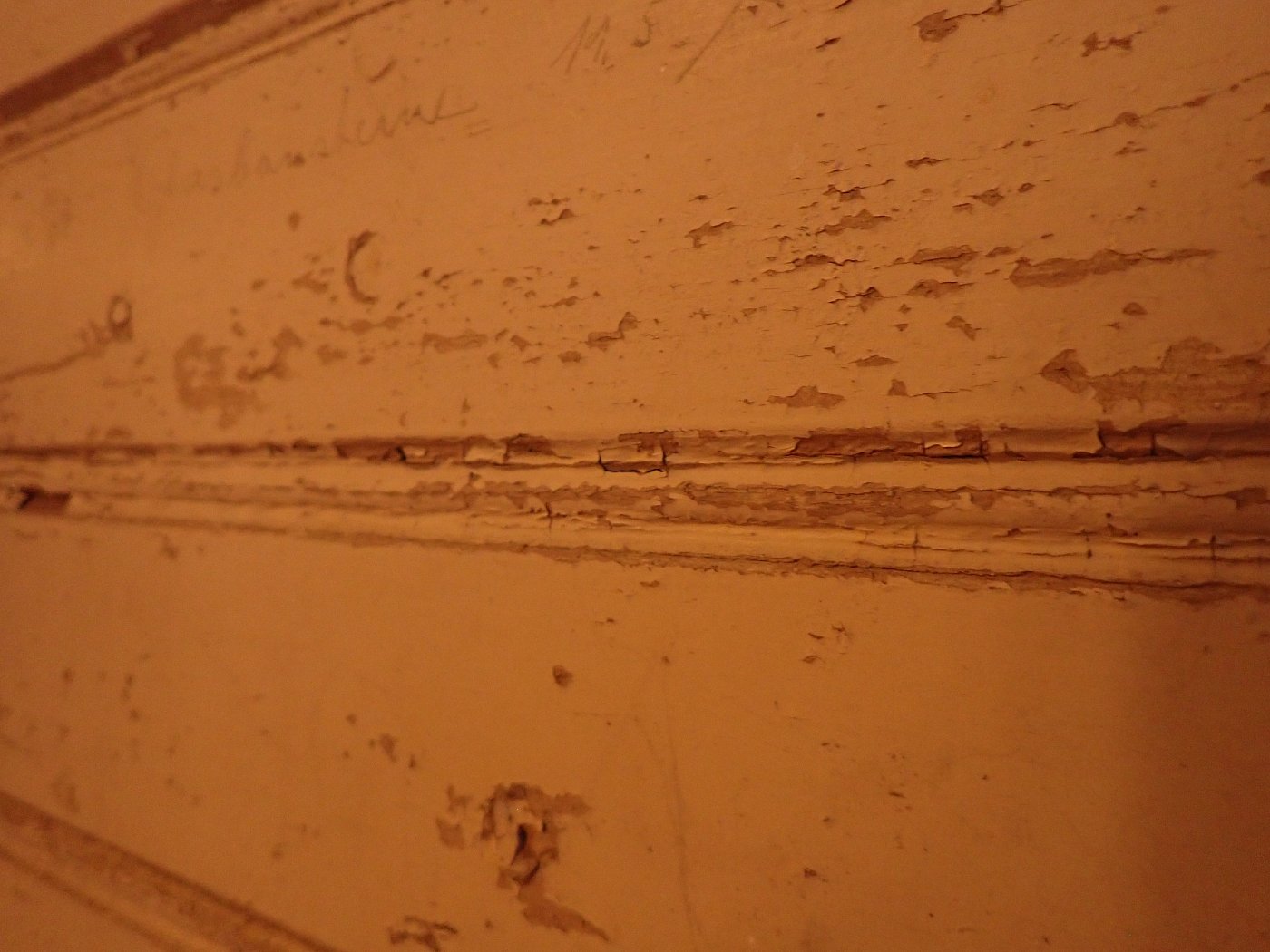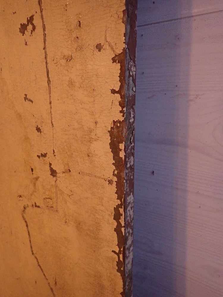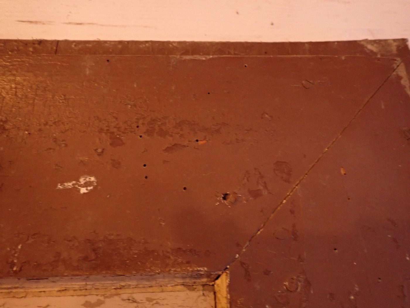 Insgesamt befindet sich die Tür in einem soliden Bergezustand, auch wenn der farbige Lack auf der Außenseite abbröselt und es an einigen Stellen alte Fraßspuren des Holzwurms gibt. Ob diese noch aktiv bewohnt sind, wissen wir nicht, können aber zur Sicherheit eine thermische Behandlung in der Trockenkammer empfehlen.