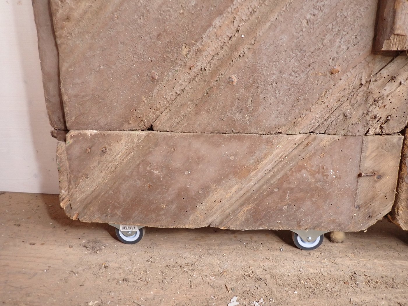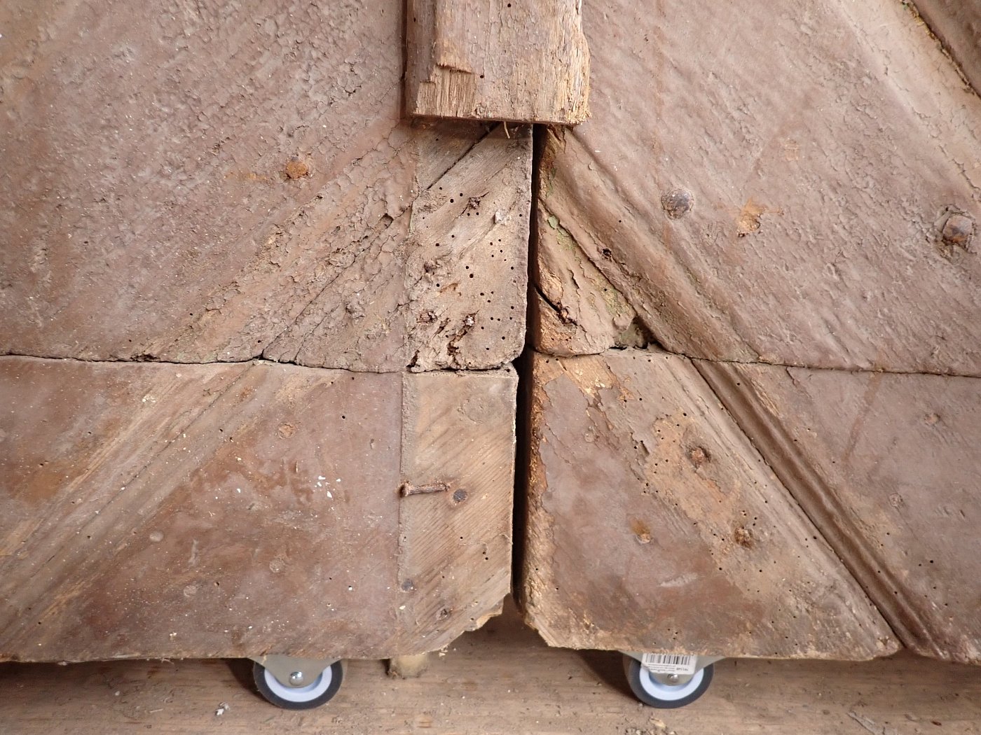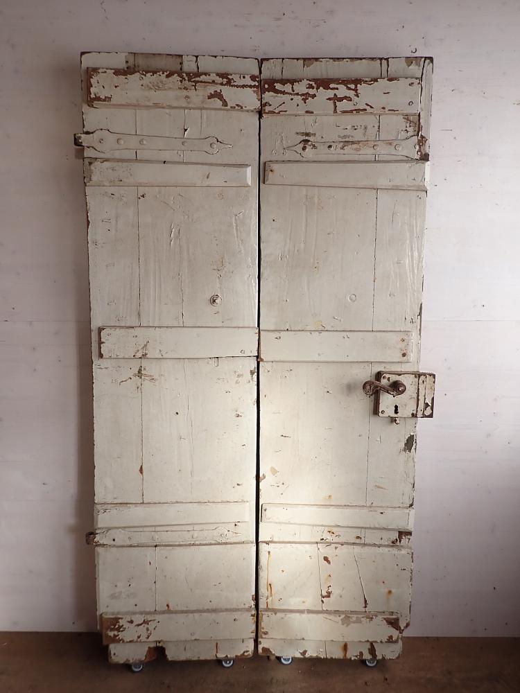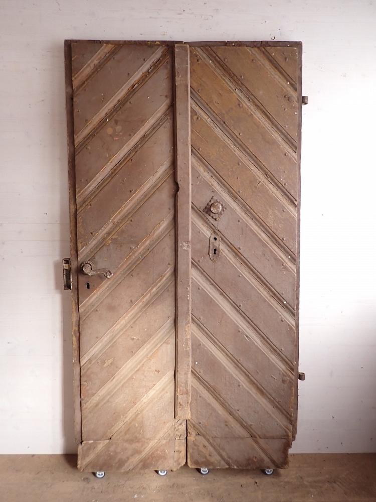 Die zweiflügelige Falttür ist aus Eiche gefertigt und im Fischgrätenmuster gestaltet. An der Tür sind Klinke und Schloss vorhanden. In der Mitte über die beiden aneinanderliegenden Kanten ist eine Schlagleiste angebracht. Diese dient als Wind- und Wetterschutz. Die beiden Wetterschenkel fehlen.