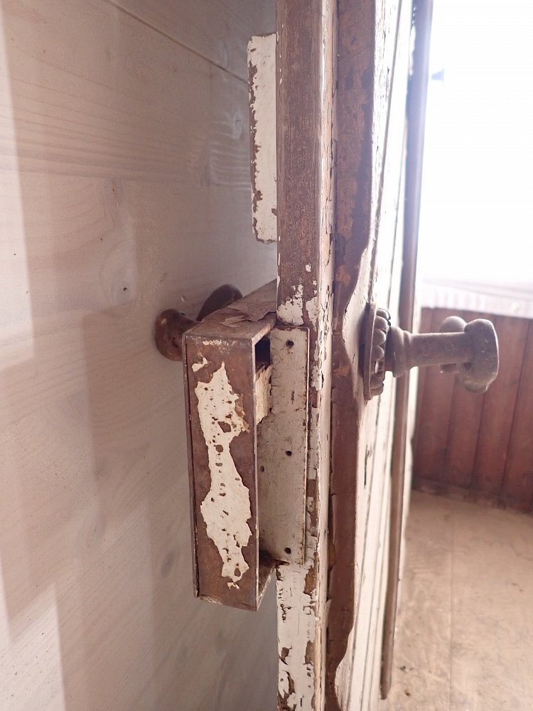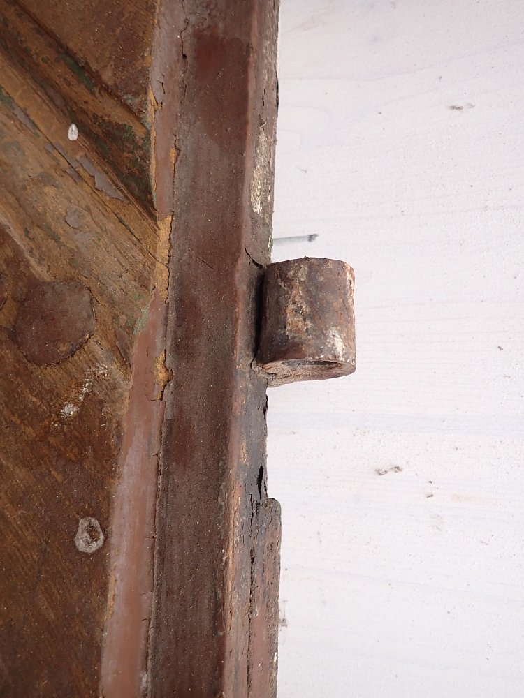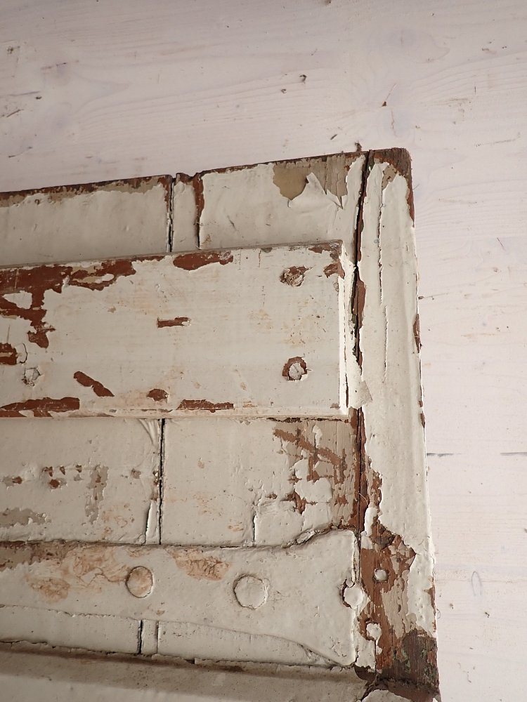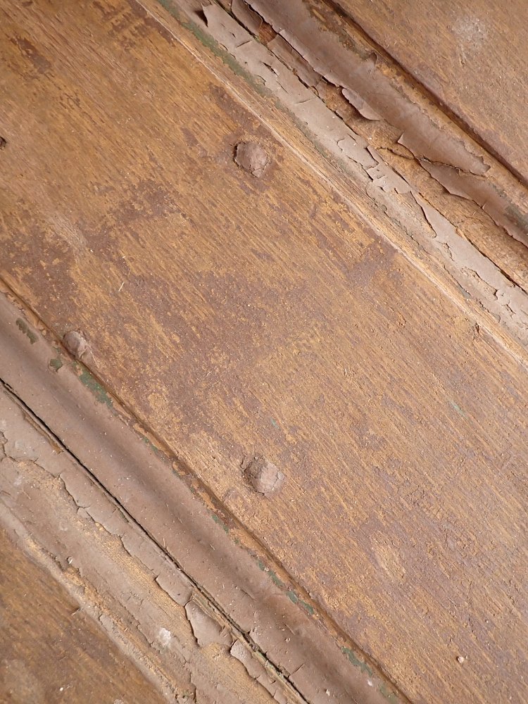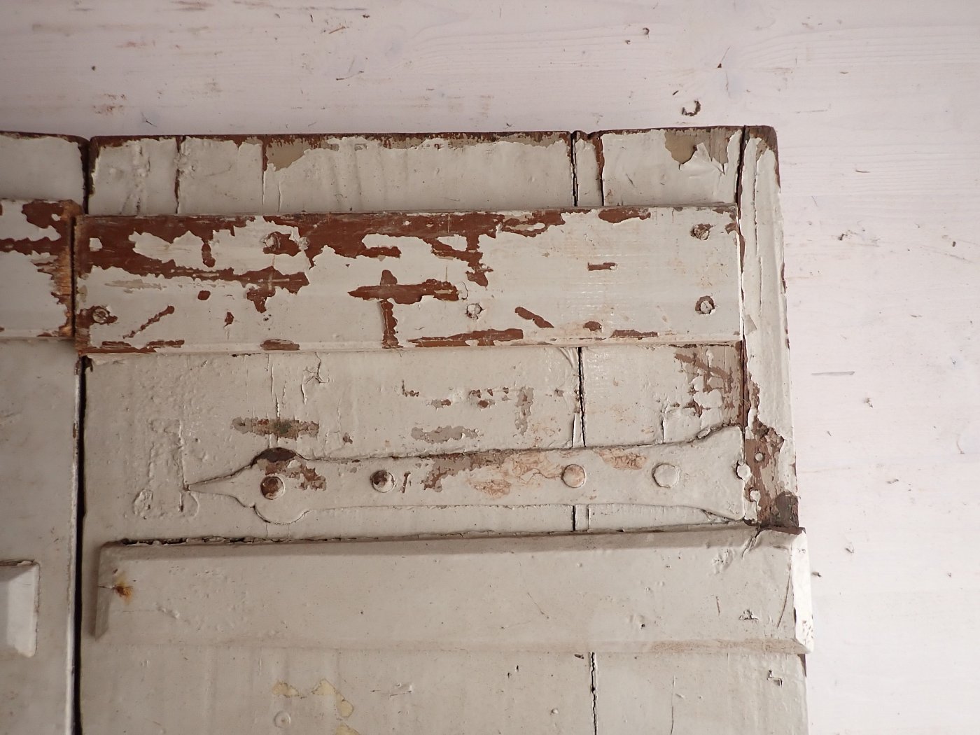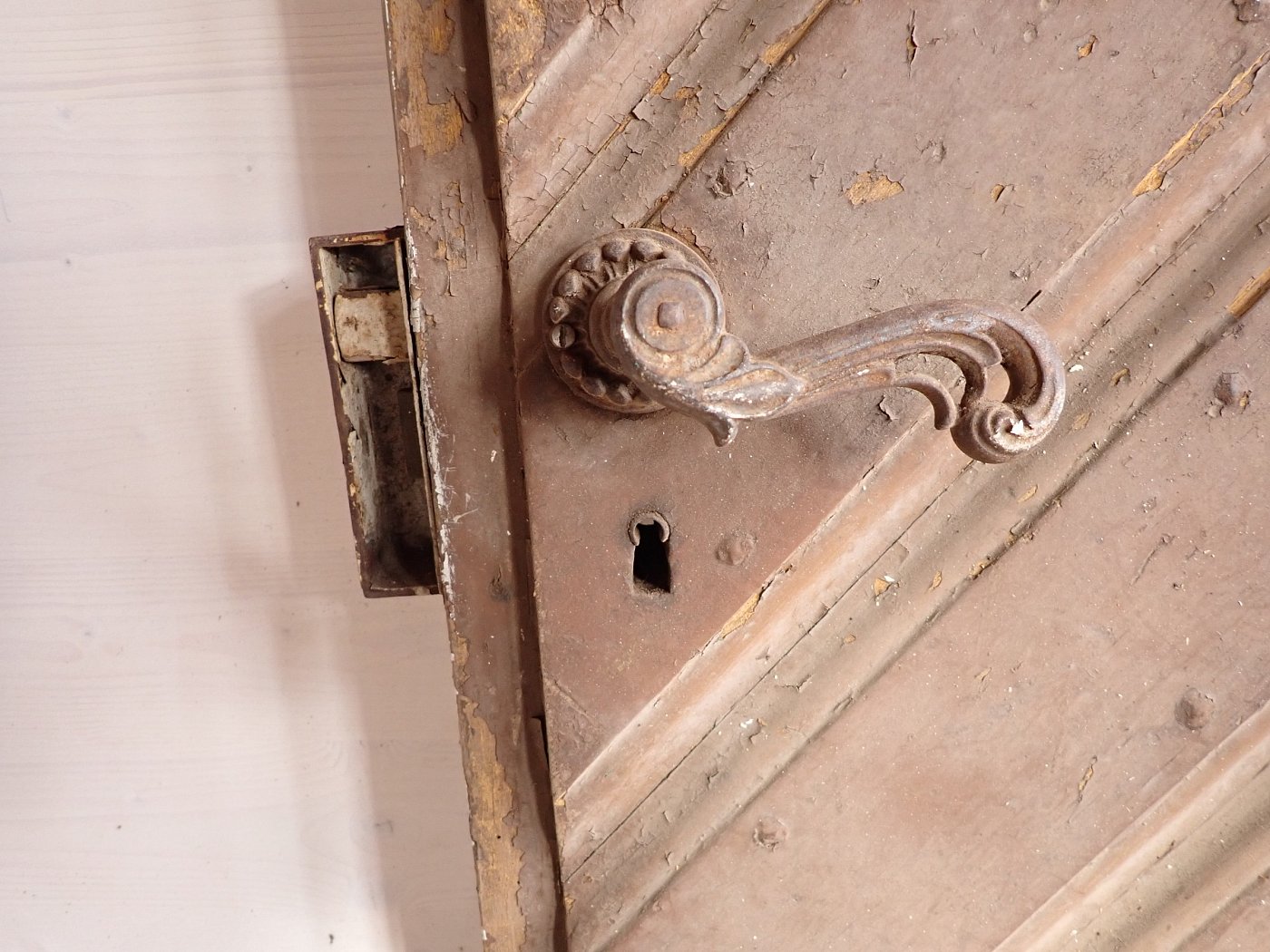Die Tür weist altersbedingte Gebrauchsspuren auf. Abblättender Lack, kleine Beschädigungen auf der Oberfläche und an Kanten. Es sind Spuren eines Holzwurms zu erkennen.