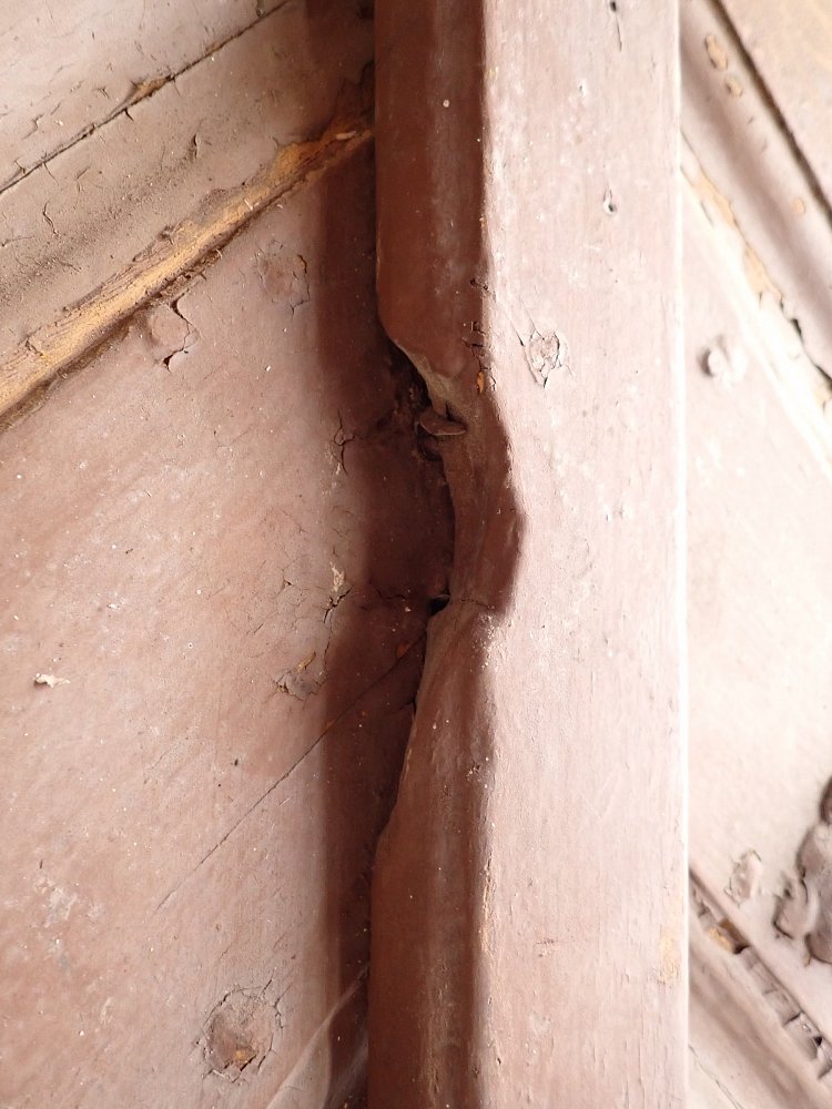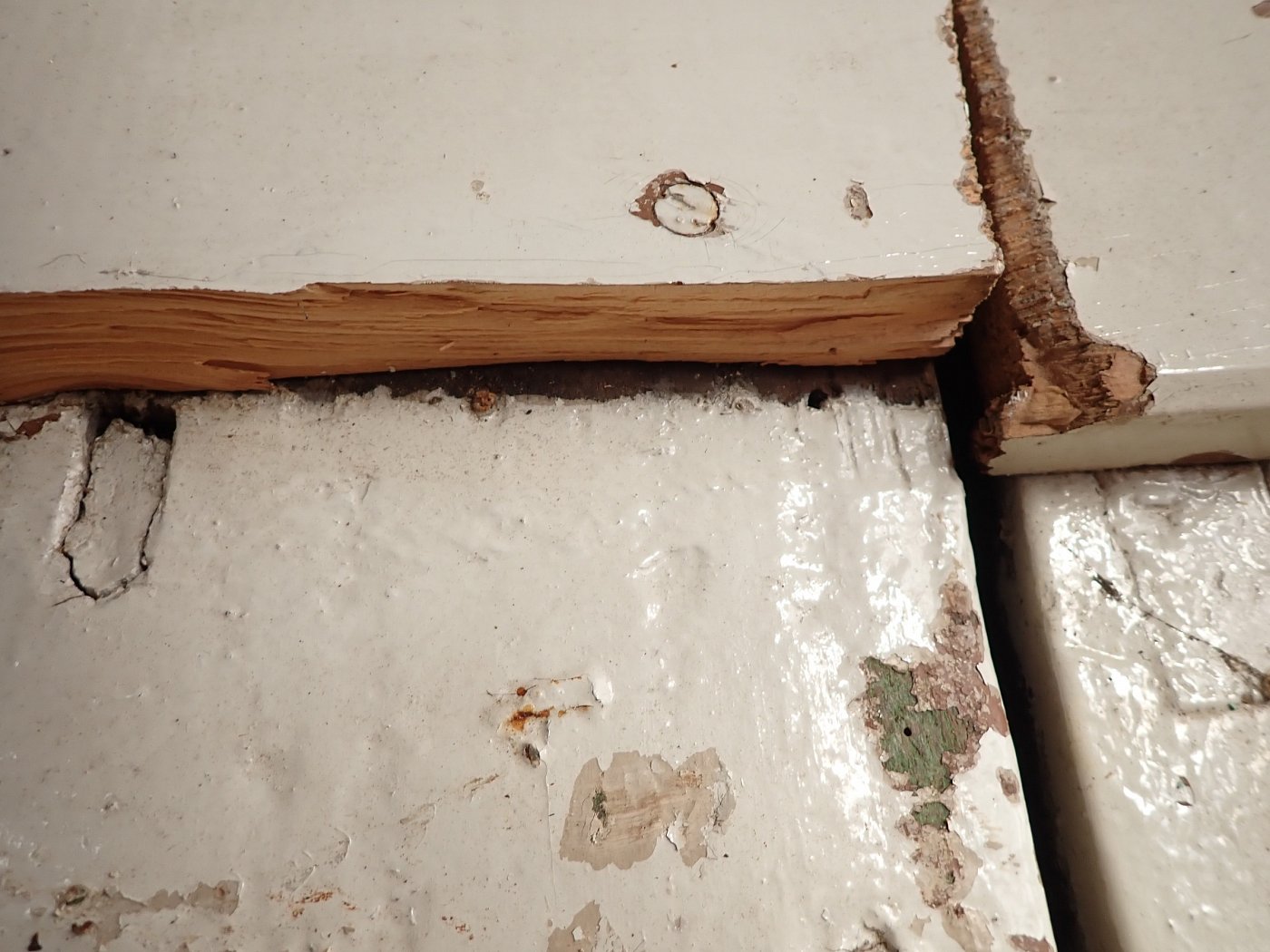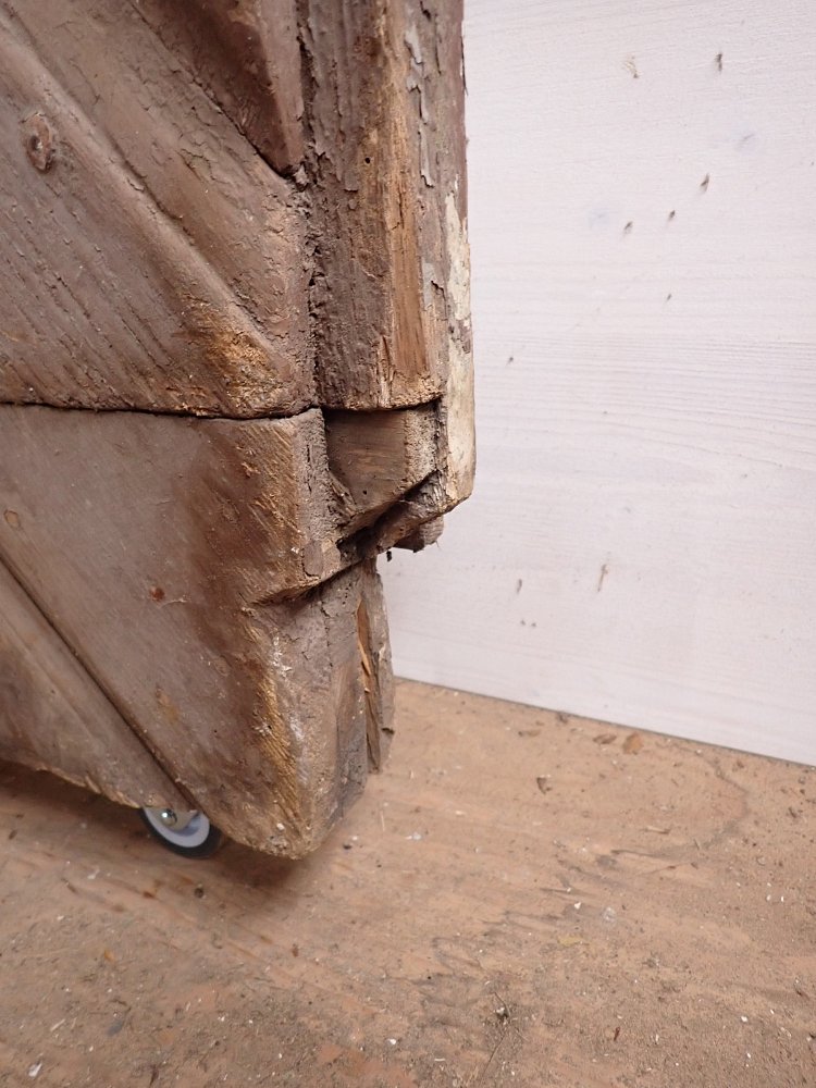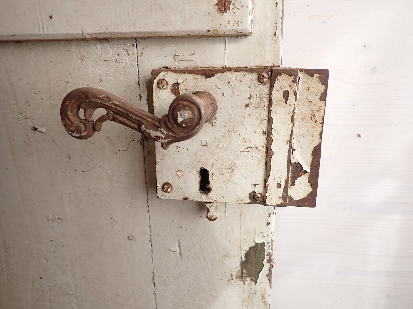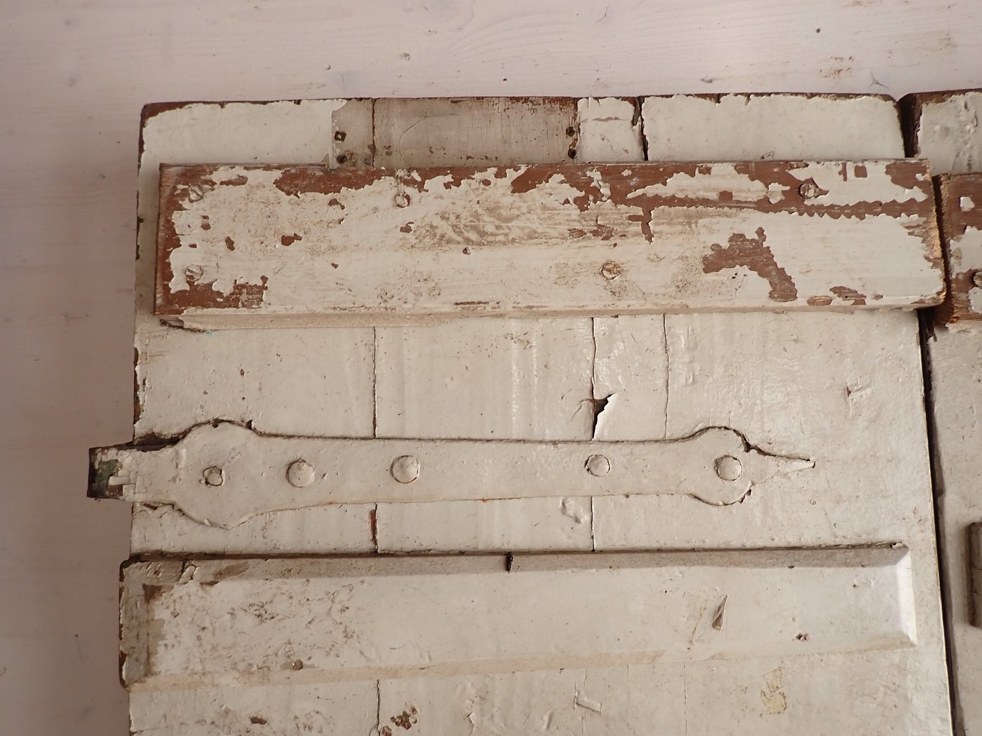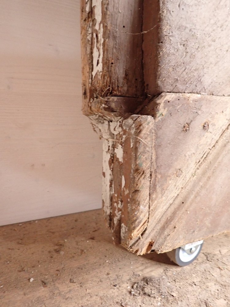 Die Tür weist altersbedingte Gebrauchsspuren auf. Abblättender Lack, kleine Beschädigungen auf der Oberfläche und an Kanten. Es sind Spuren eines Holzwurms zu erkennen.
