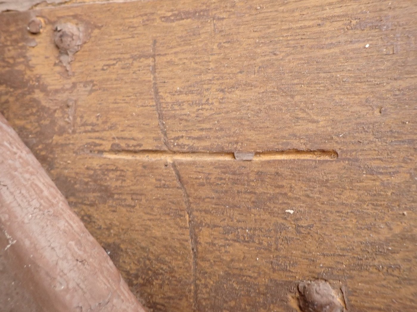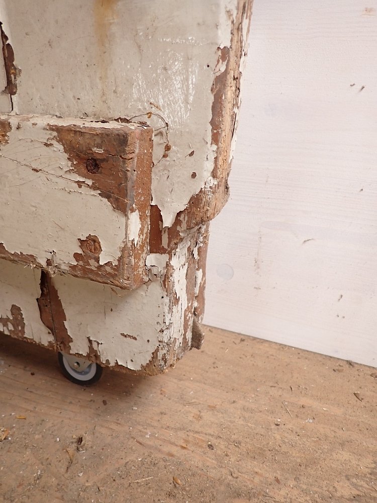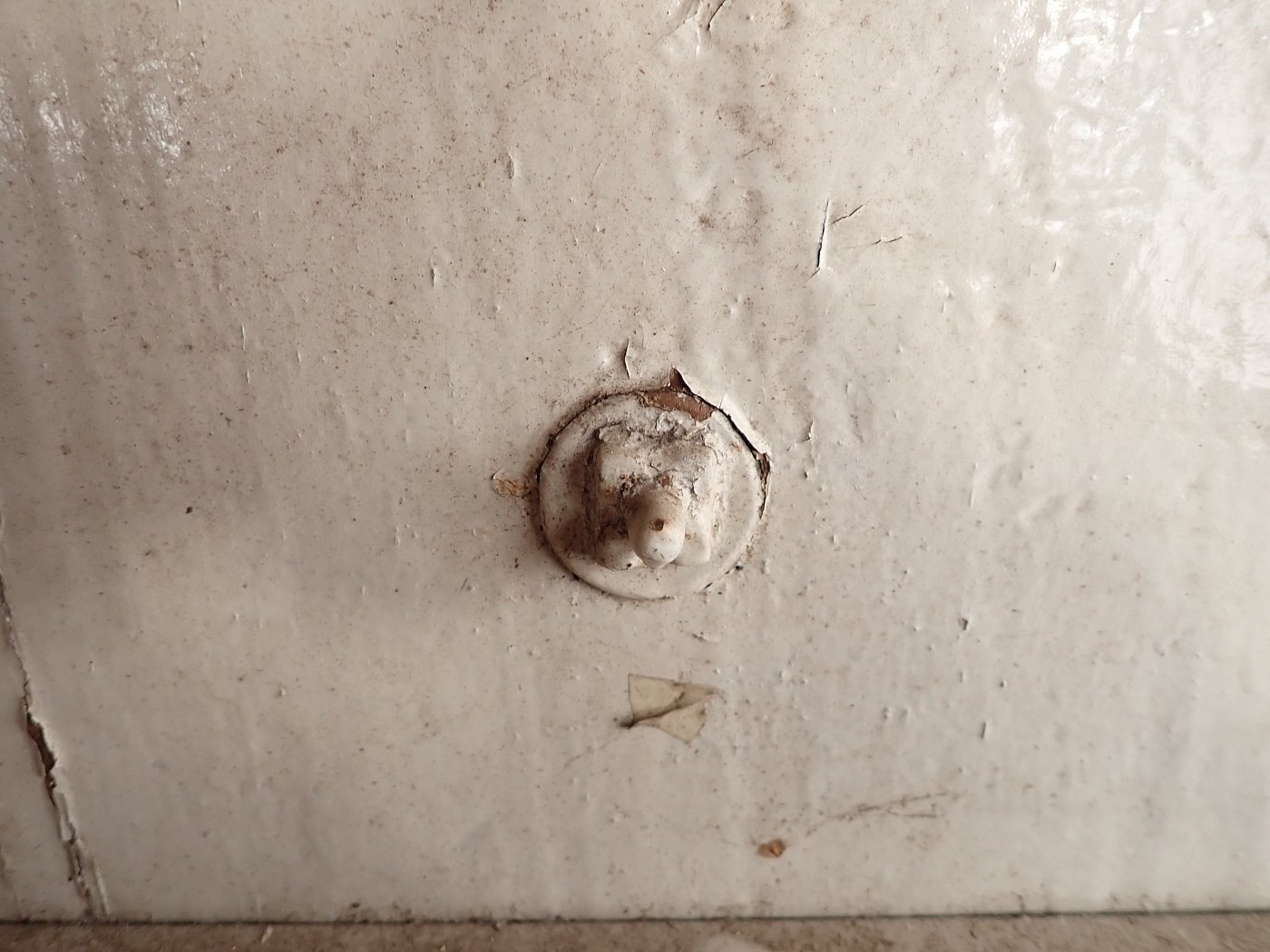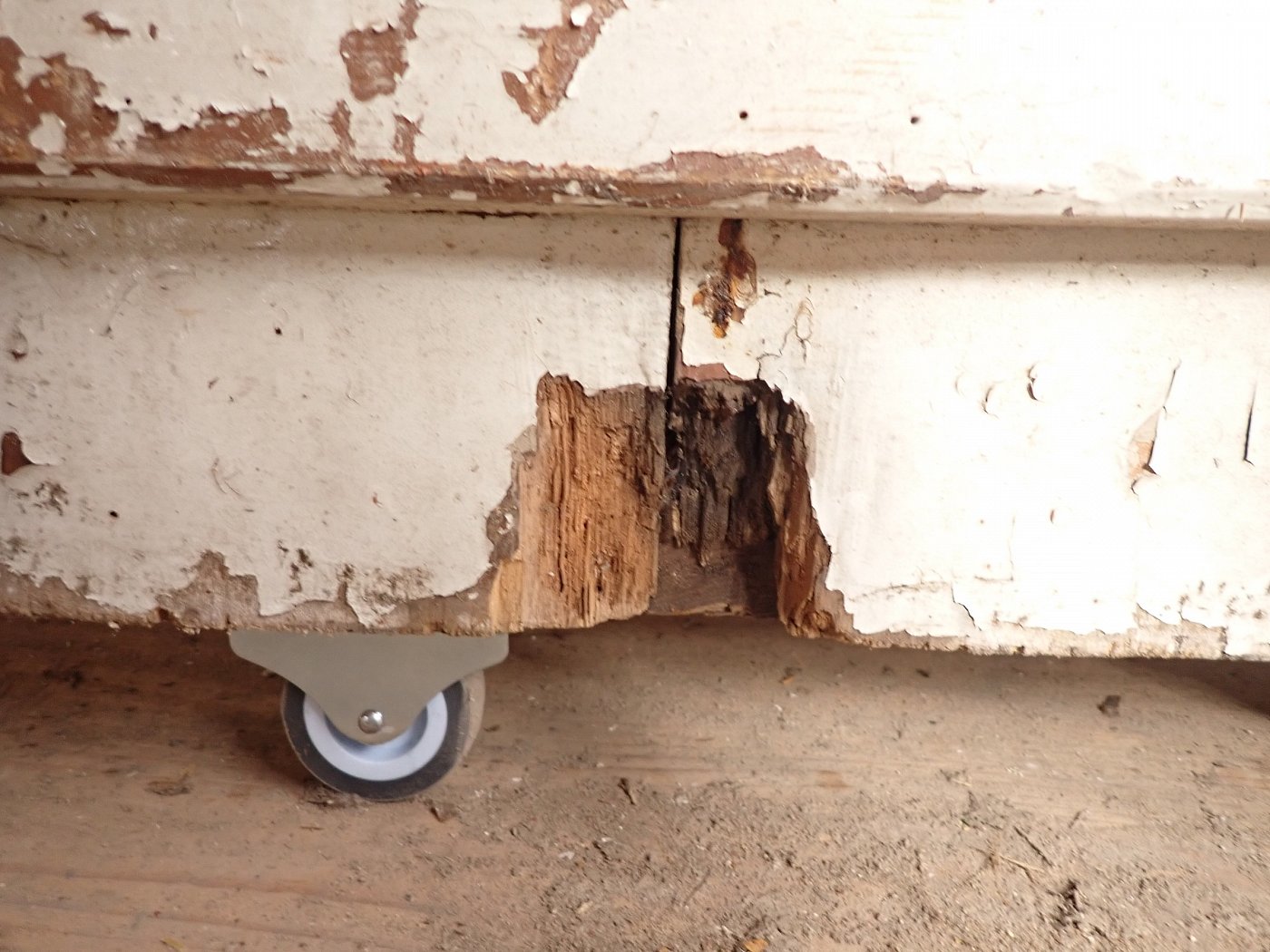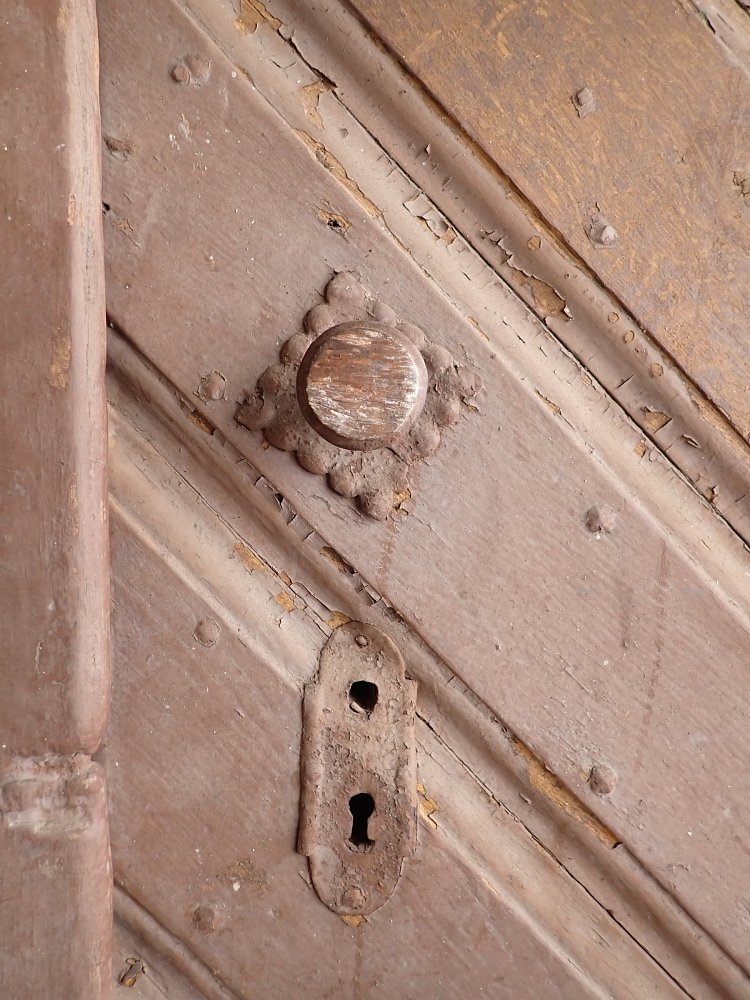 Die Tür weist altersbedingte Gebrauchsspuren auf. Abblättender Lack, kleine Beschädigungen auf der Oberfläche und an Kanten. Es sind Spuren eines Holzwurms zu erkennen.