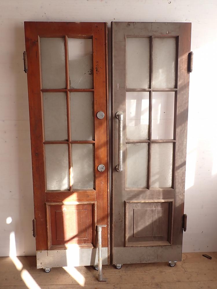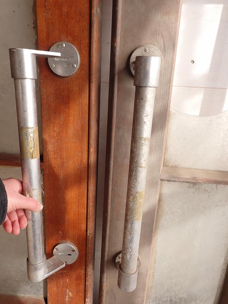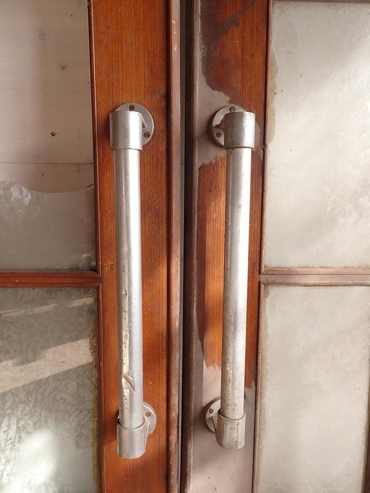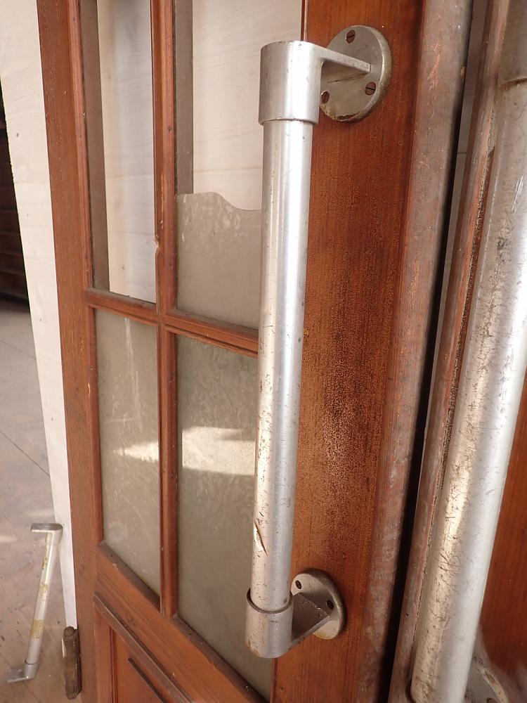 Die zweiflügelige Schwingtür hat jeweils einen großen Lichtausschnitt mit sechs Sprossenfenstern und im unteren Bereich eine klassische Holzfüllung. Auffällig ist an dieser Tür die beiden langen vertikalen Stoßgriffe aus Metall, die typisch sind für diese Art von Tür. Außerdem verfügt die Tür über vertikal verschließbare Riegel.