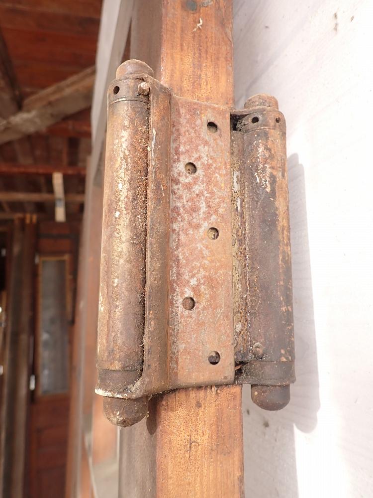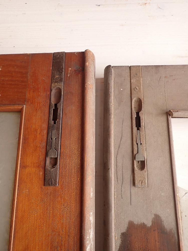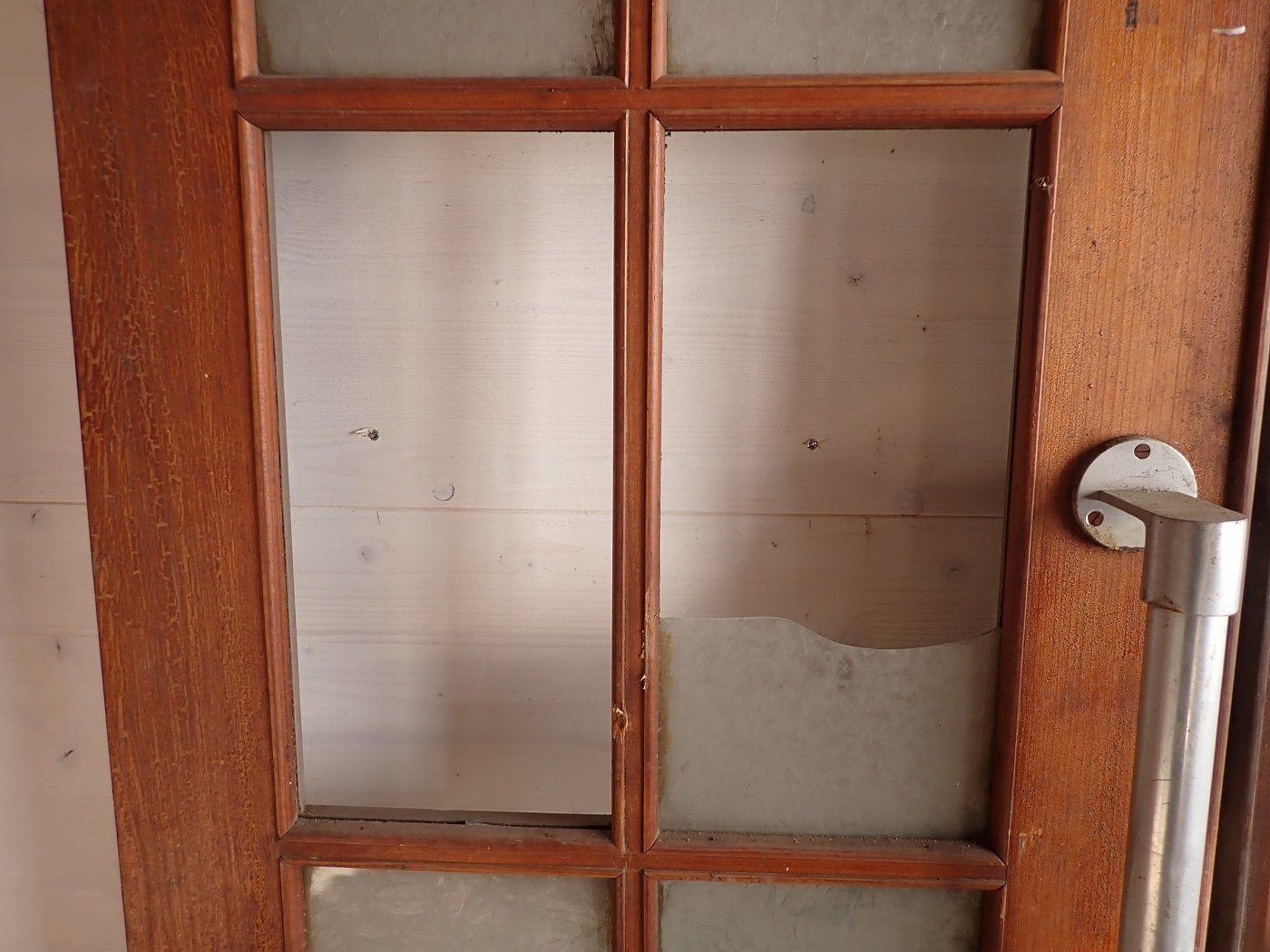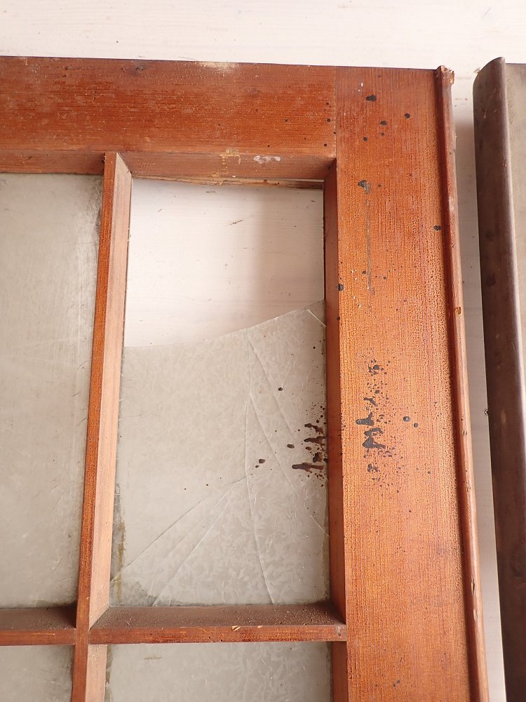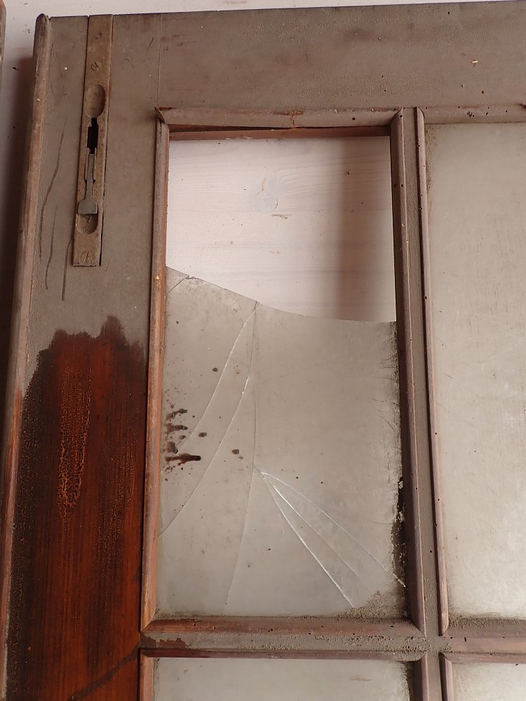 Die Tür ist in einem soliden Zustand. Vieles lässt sich bereits mit einer ersten Reinigung entfernen und sonst weist die Tür altersbedingte Gebrauchsspuren auf. Leider sind drei der Fenster kaputt und es sind Spuren eines Holzwurms erkennbar.