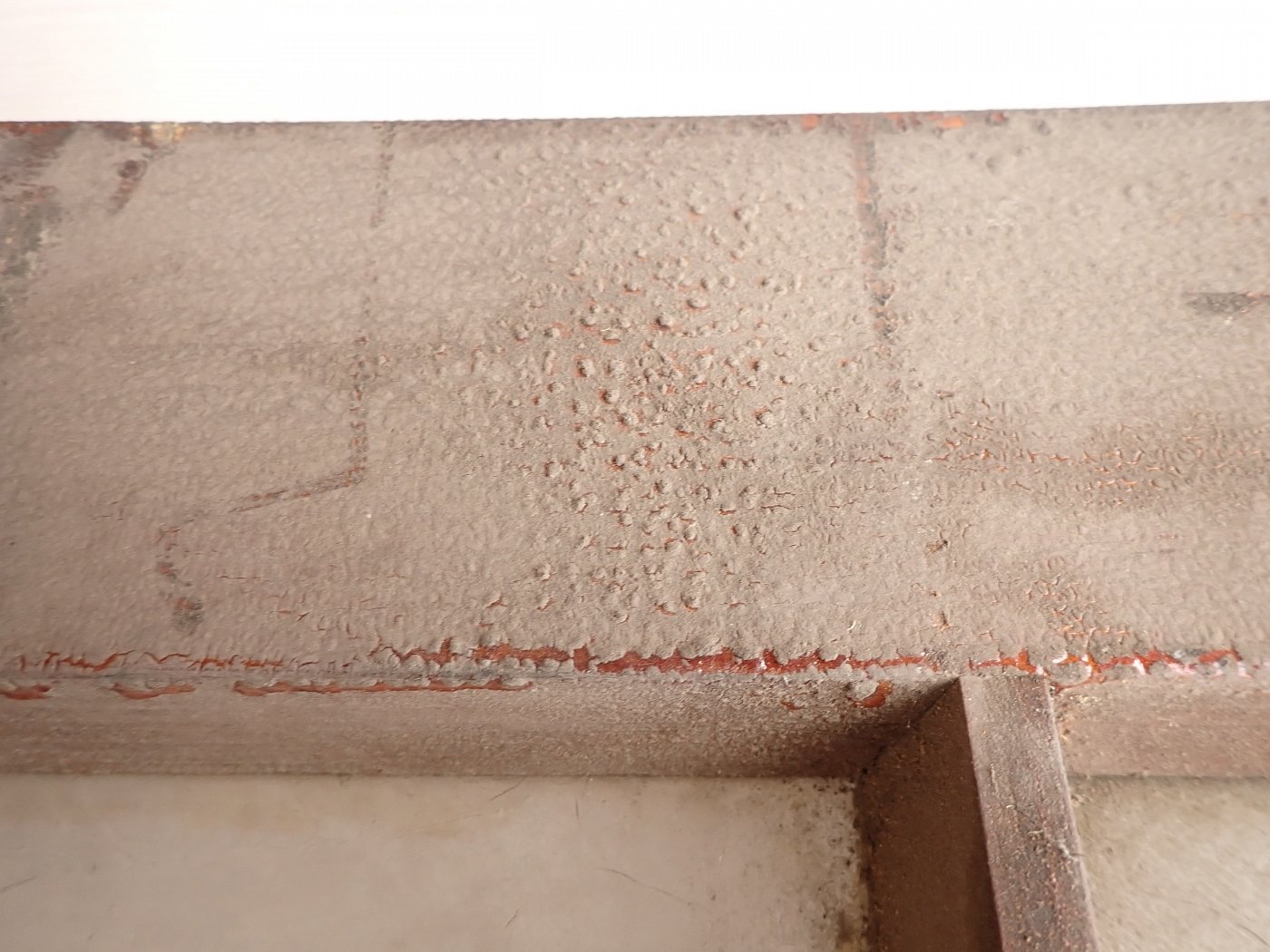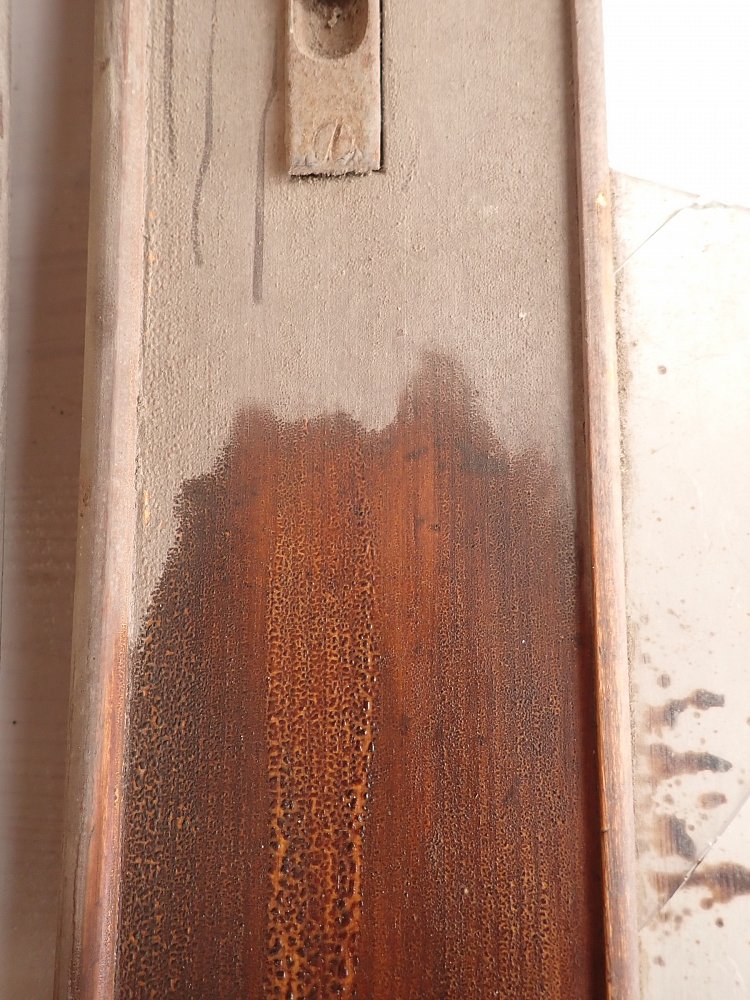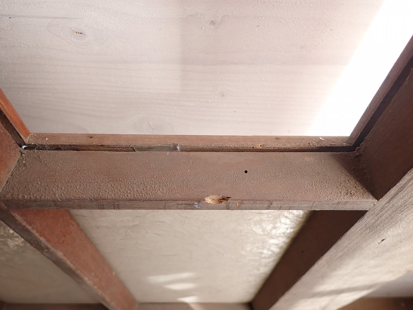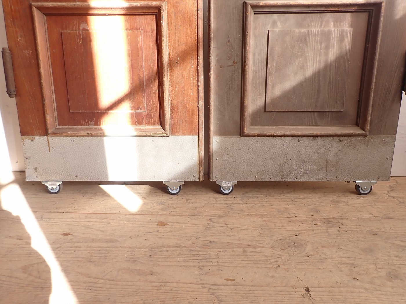 Die Tür ist in einem soliden Zustand. Vieles lässt sich bereits mit einer ersten Reinigung entfernen und sonst weist die Tür altersbedingte Gebrauchsspuren auf. Leider sind drei der Fenster kaputt und es sind Spuren eines Holzwurms erkennbar.