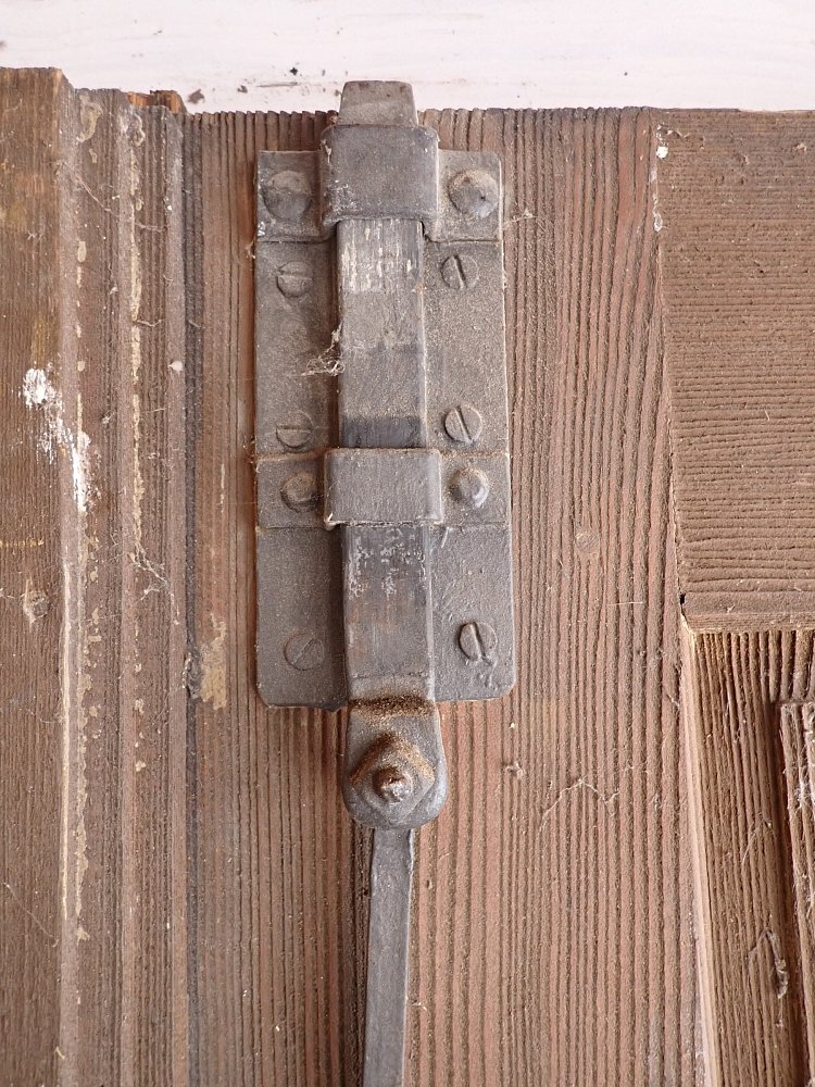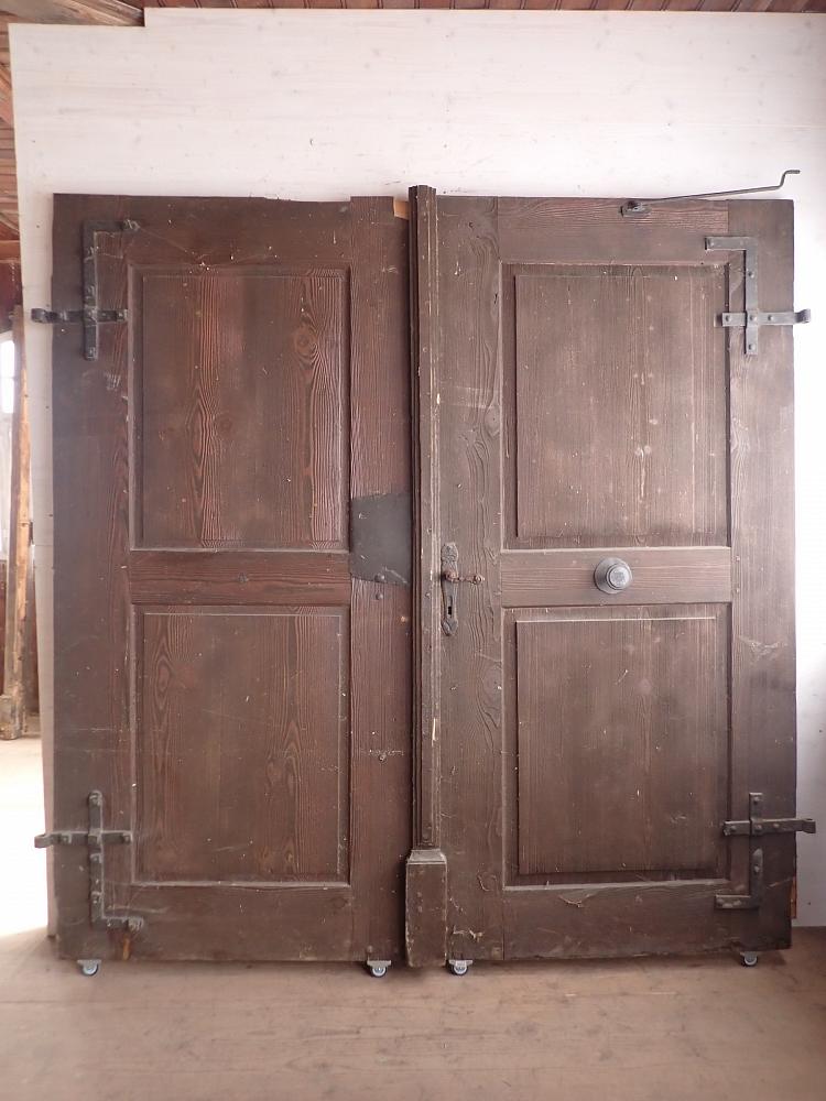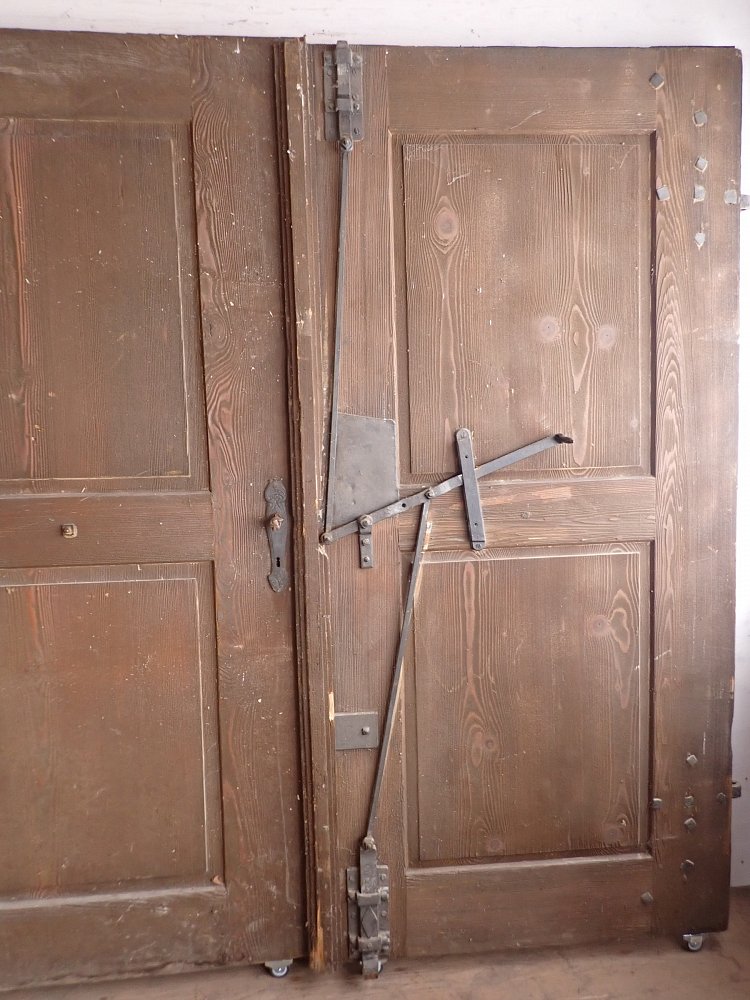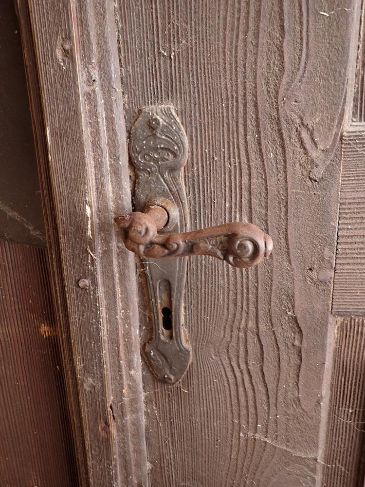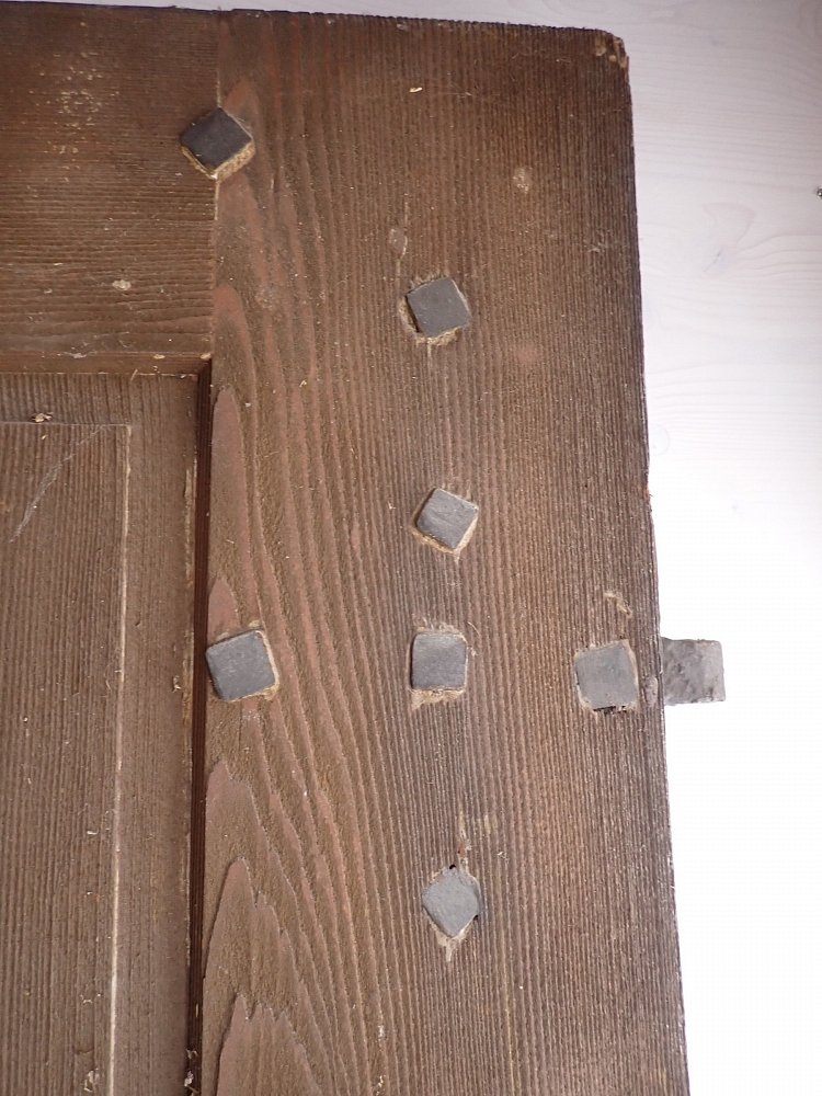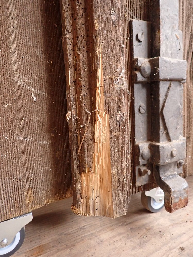 Die Tür befindet sich in einem soliden Zustand. Altersbedingt hat es an den Kanten oder auf der Oberfläche der Türen Stellen, die bereits abgebrochen sind. Es sind Spuren eines Wurmbefalls zu erkennen.