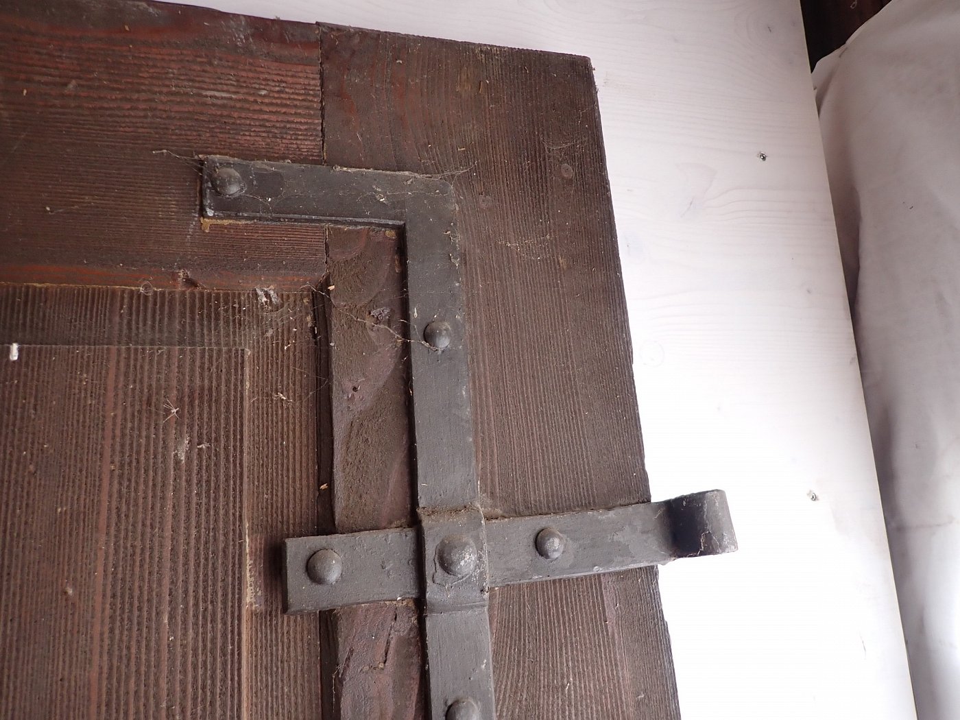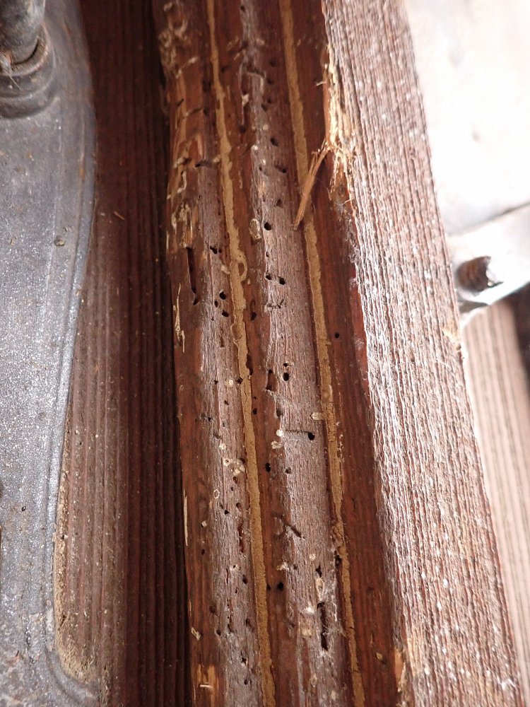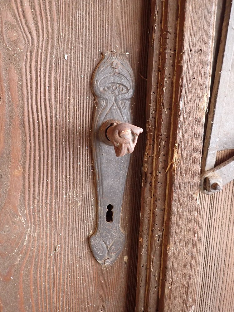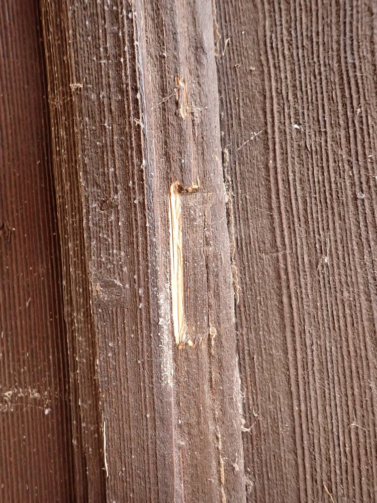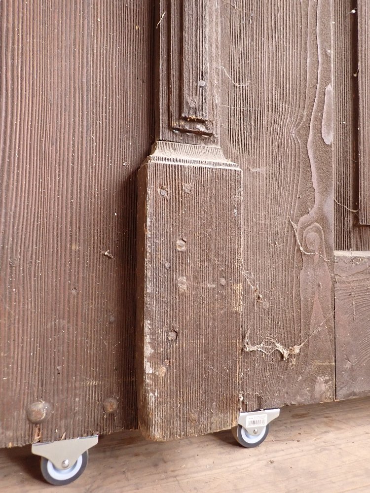 Die Tür befindet sich in einem soliden Zustand. Altersbedingt hat es an den Kanten oder auf der Oberfläche der Türen Stellen, die bereits abgebrochen sind. Es sind Spuren eines Wurmbefalls zu erkennen.