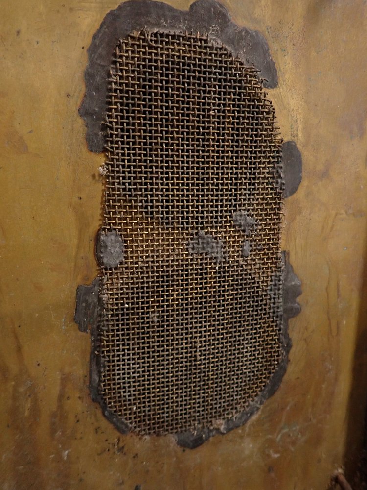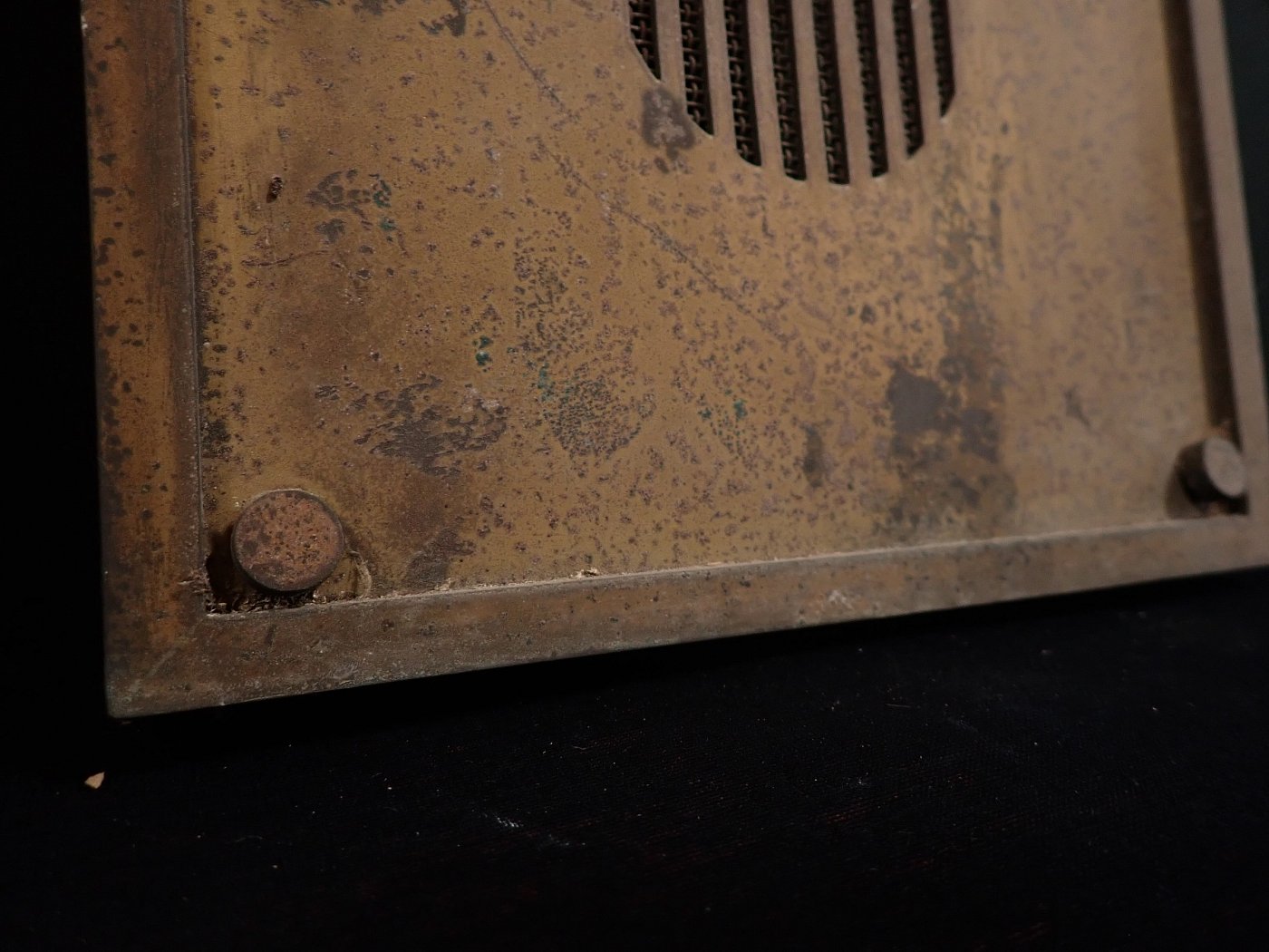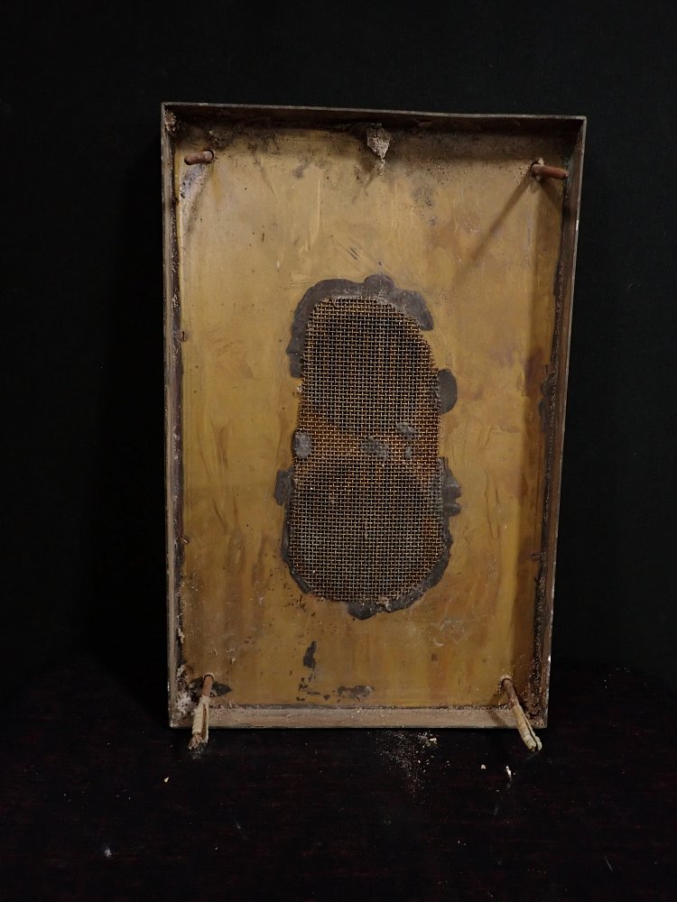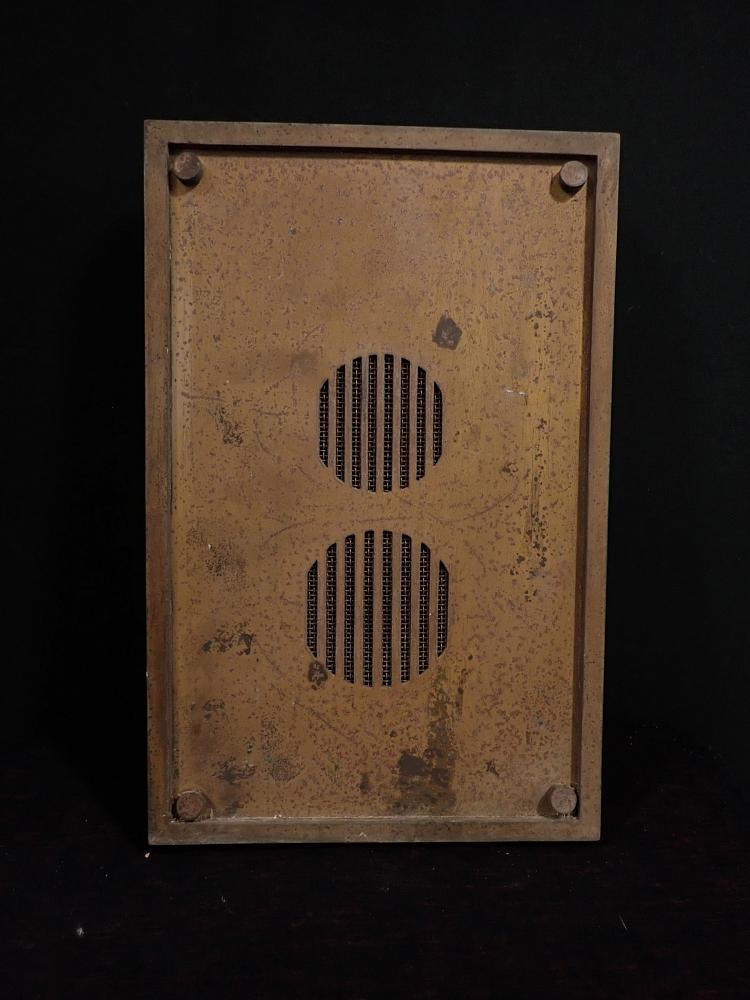 Die Sprechanlagen Abdeckung besteht aus Messing und wird mit vier Schrauben an der Wand befestigt. Auf der Oberfläche sind angelaufene Stellen und abnutzungsstellen...